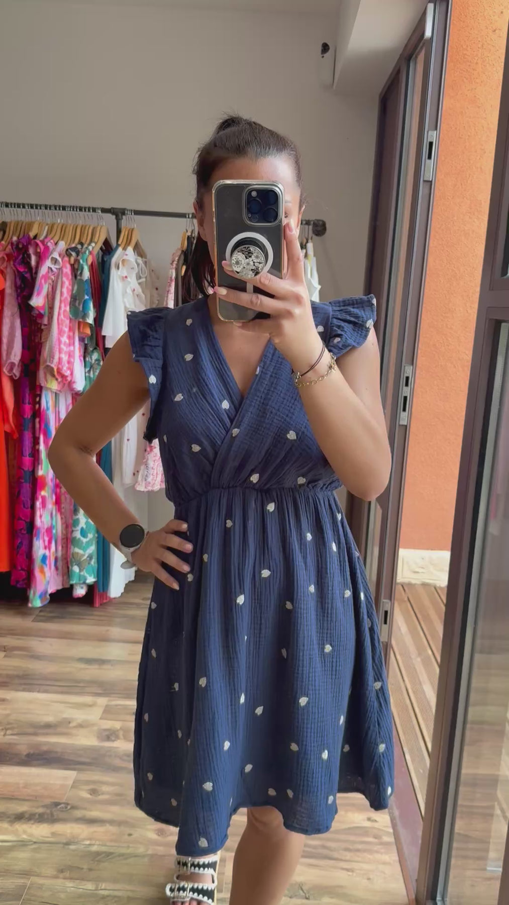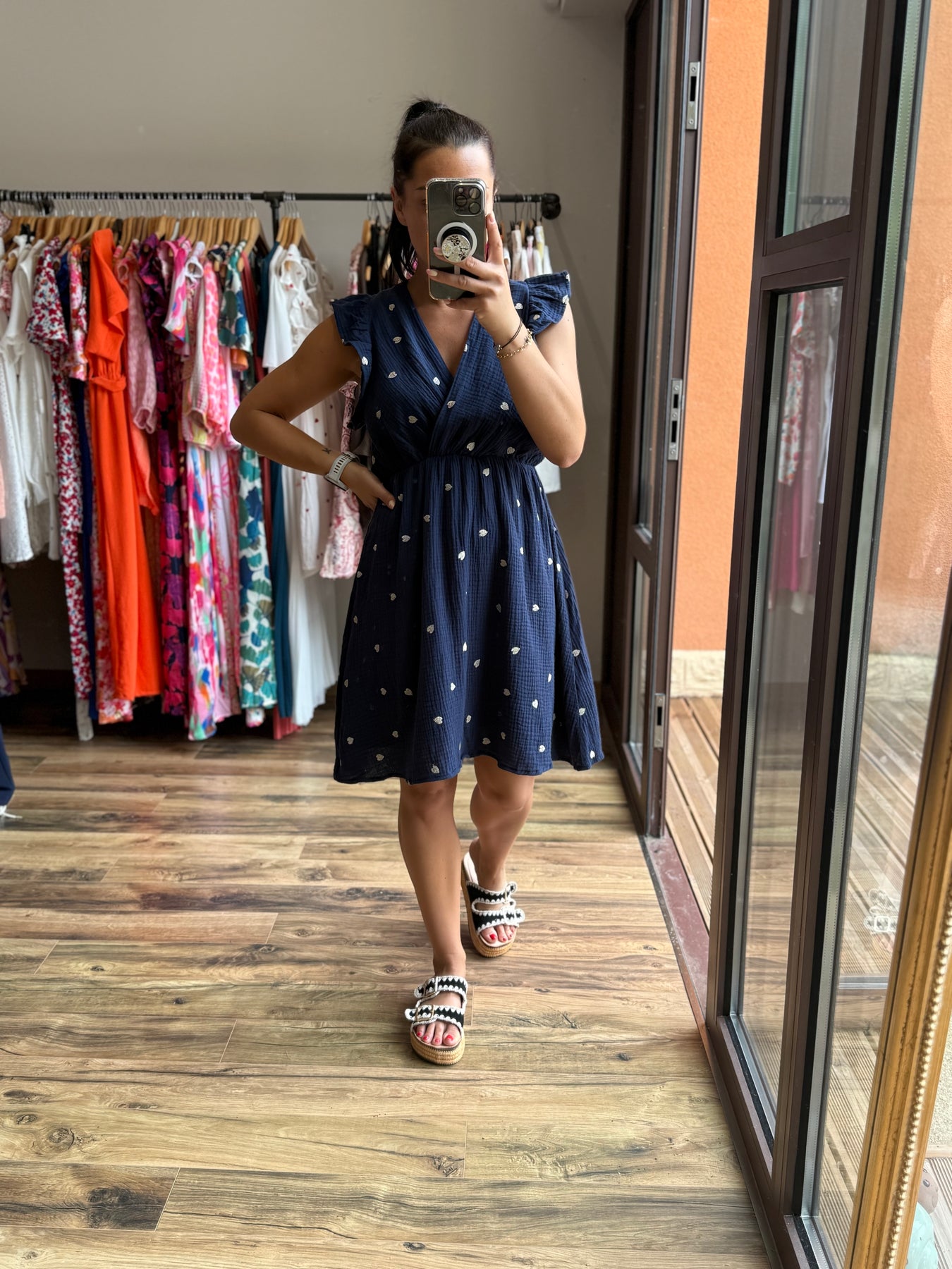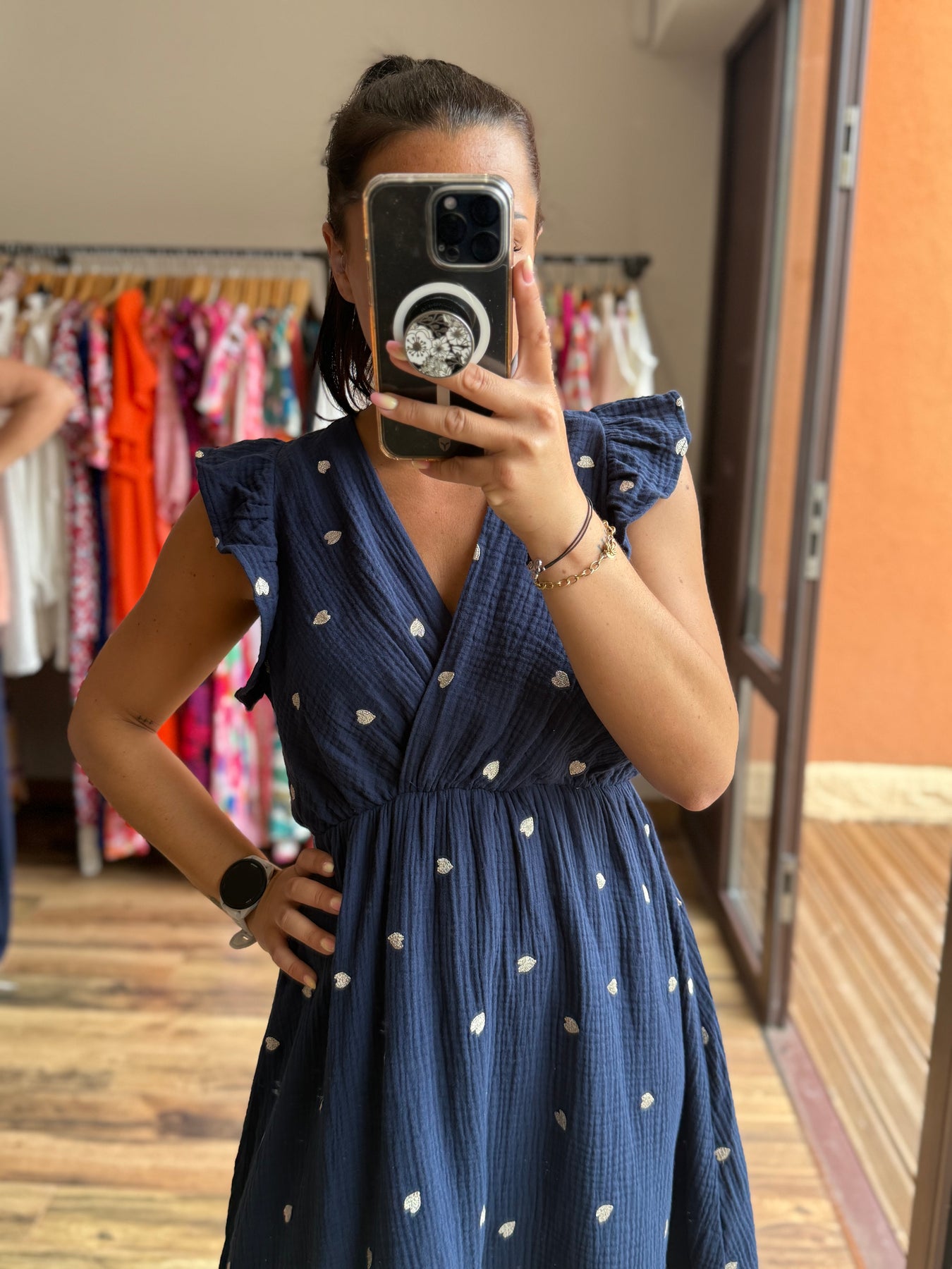 La version marine de la robe “Izan” mise sur un contraste fort et raffiné entre le bleu profond et les cœurs argent. C’est la robe idéale pour celles qui aiment allier confort, légèreté et style affirmé. Facile à accessoiriser, elle se porte aussi bien en journée qu’en soirée d’été.