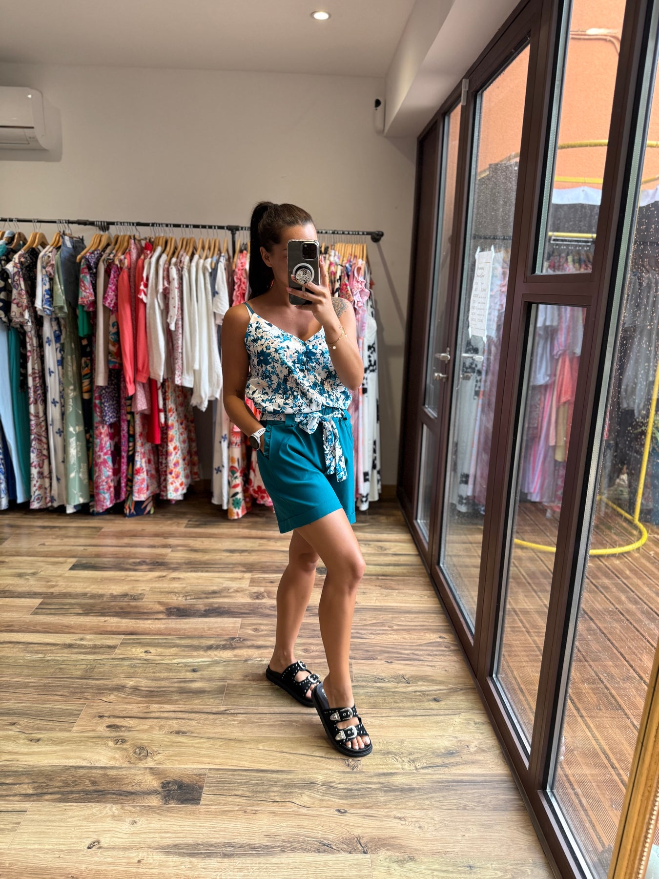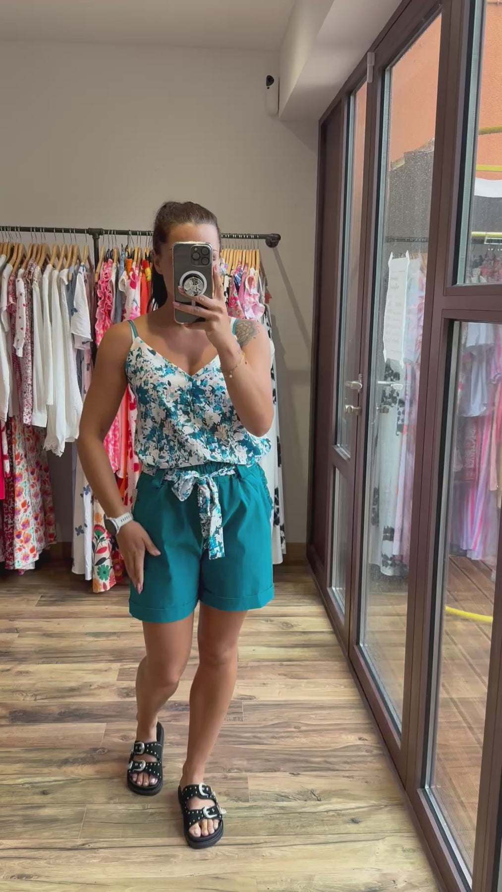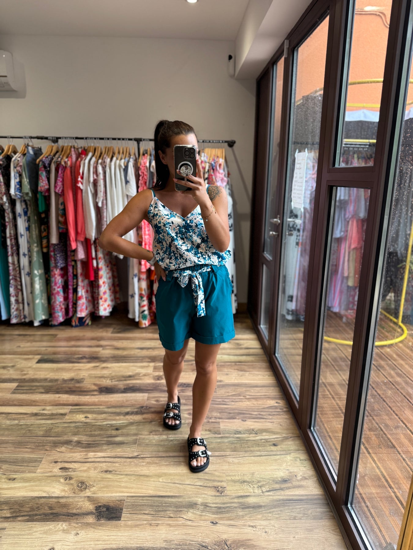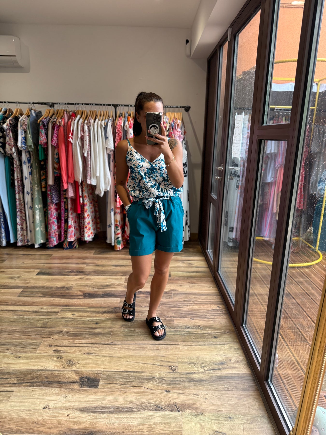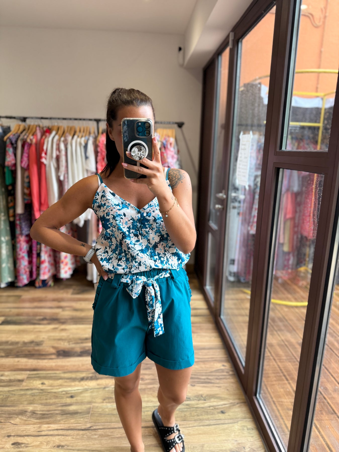 Un short aussi confortable qu’élégant 🌿 Avec sa ceinture fleurie et sa coupe fluide, il met en valeur la silhouette tout en restant très agréable à porter. On le mixe avec le top “Malaga” pour un look estival frais et tendance 💙