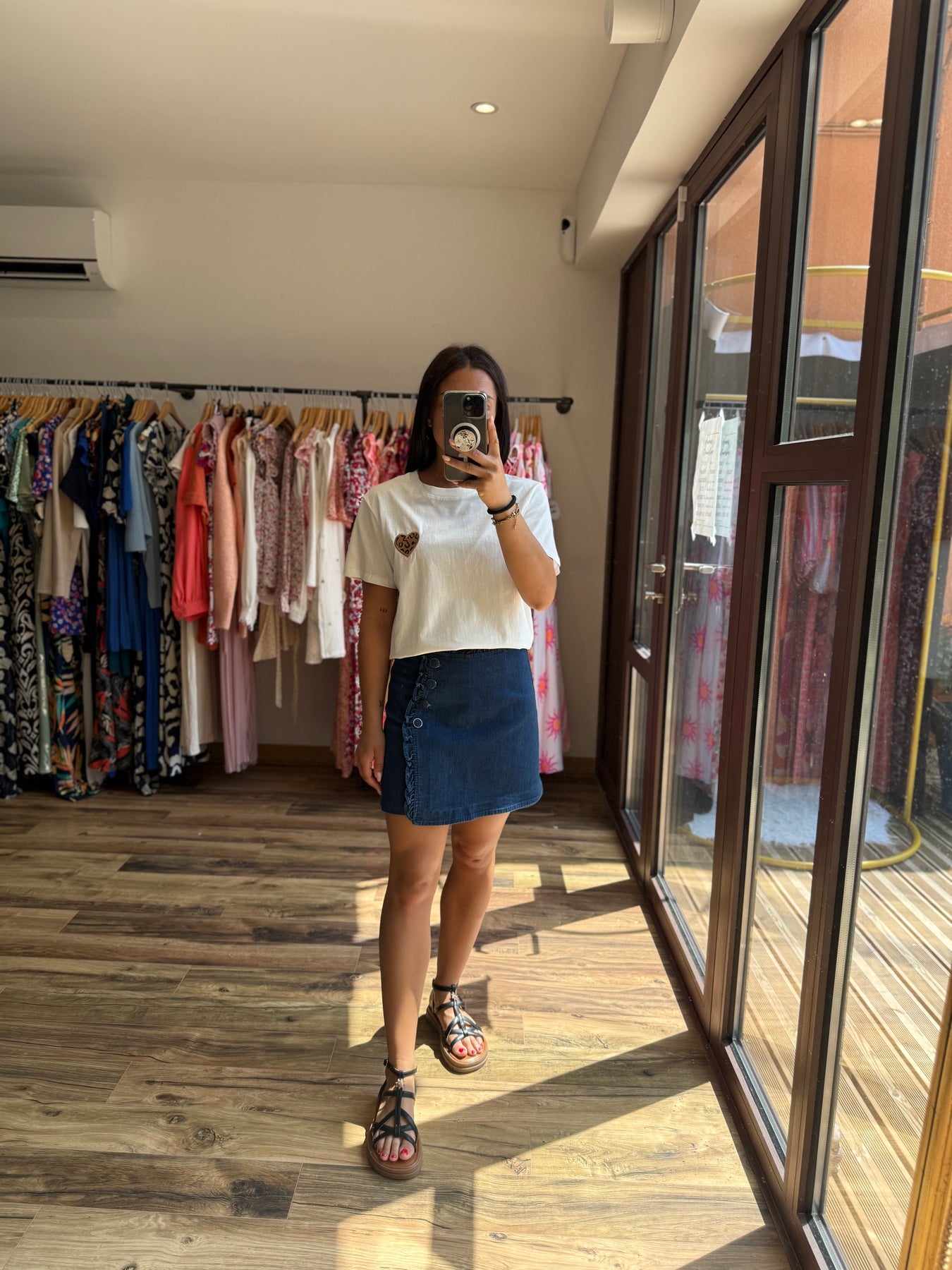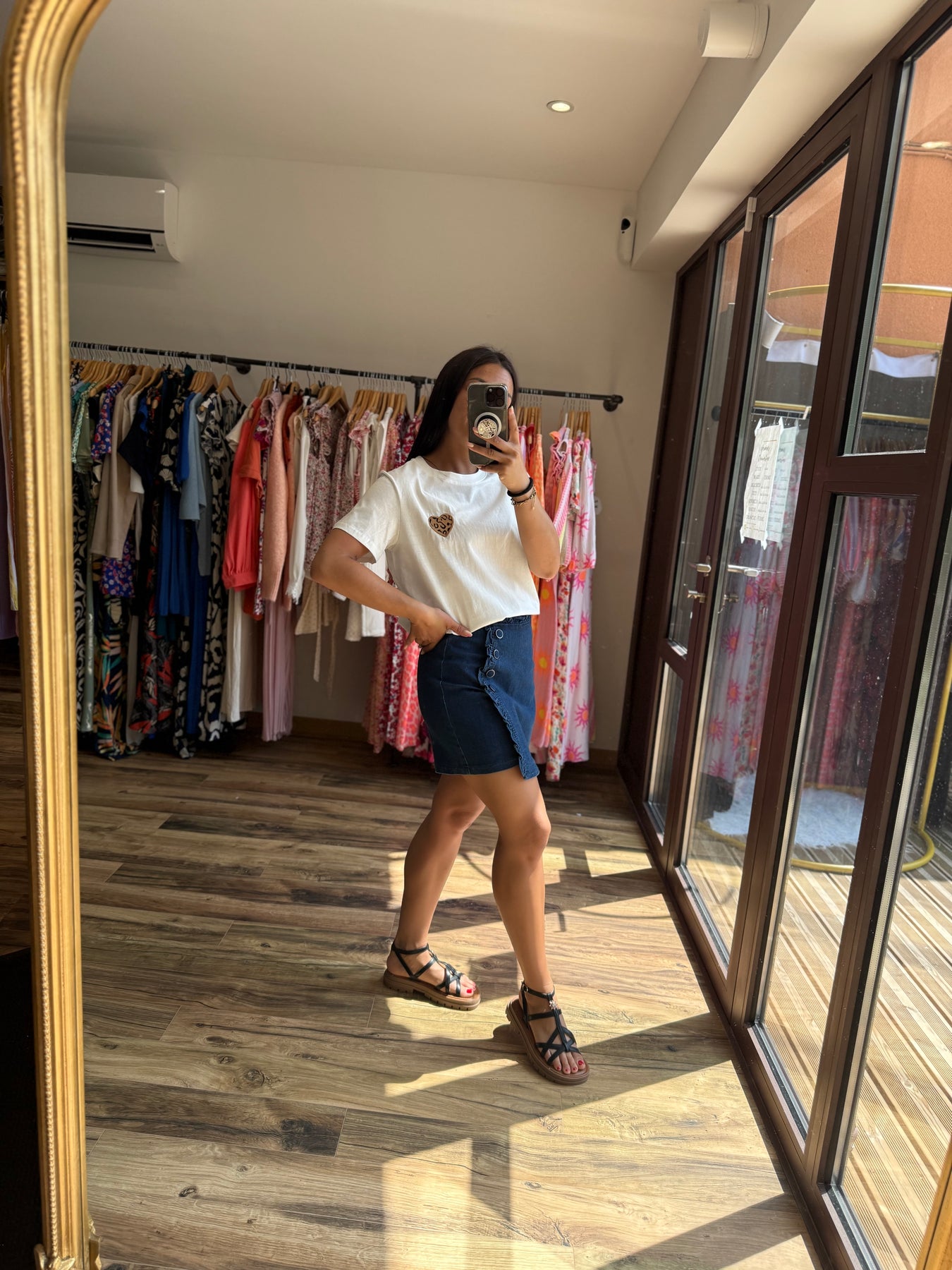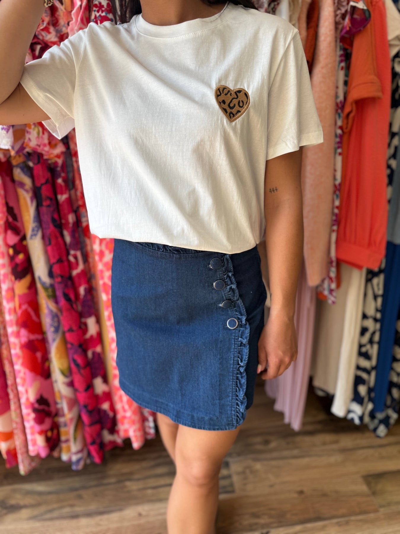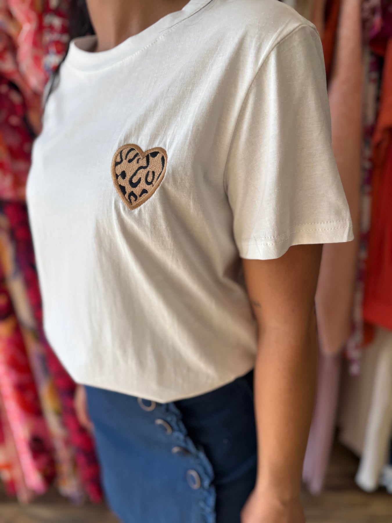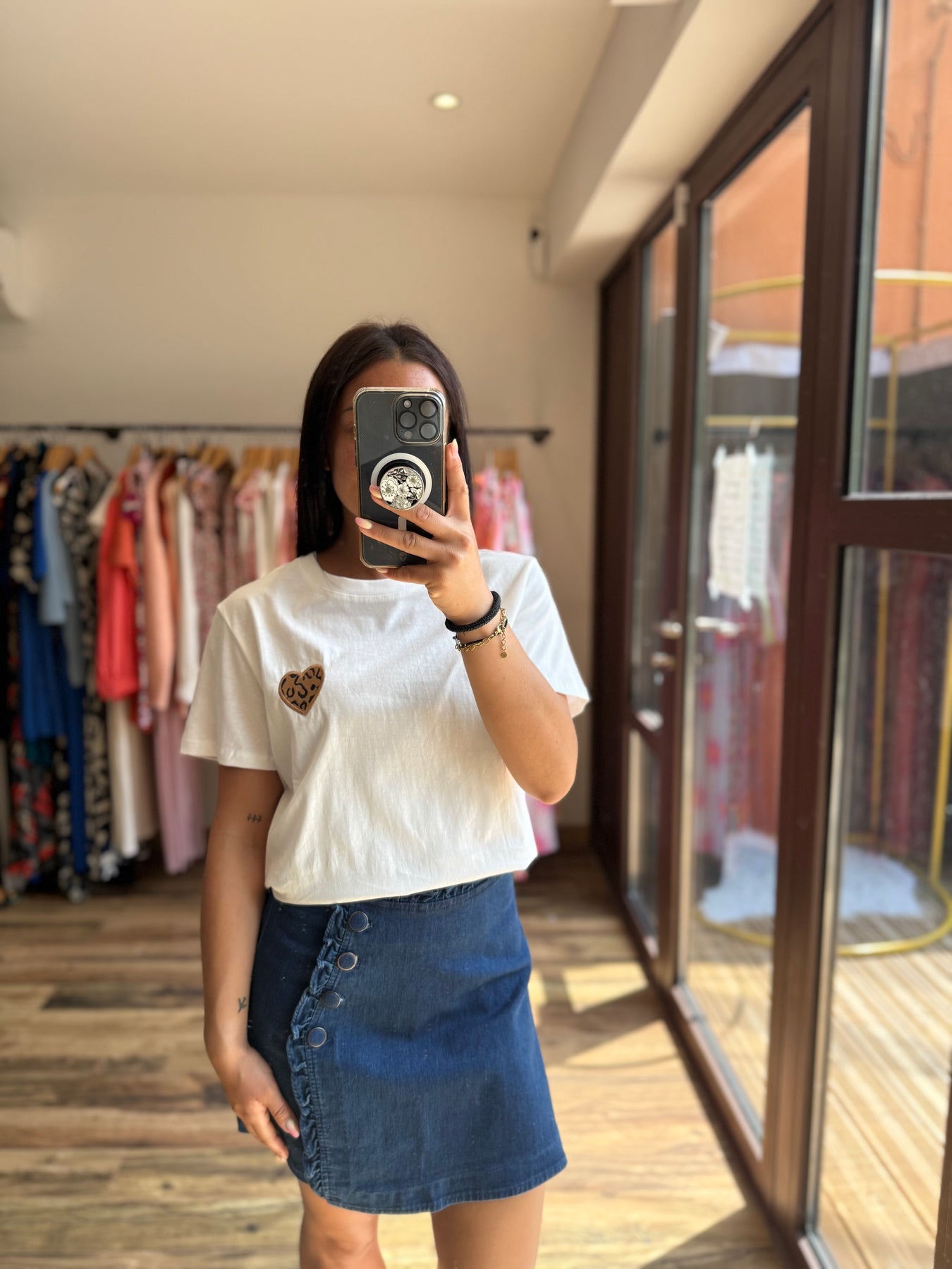 Un tee-shirt simple mais qui a du caractère grâce à son petit motif léopard en forme de cœur. Il s’associe parfaitement avec la jupe-short Isma en jean pour un look casual, cool et féminin 🐆💘
