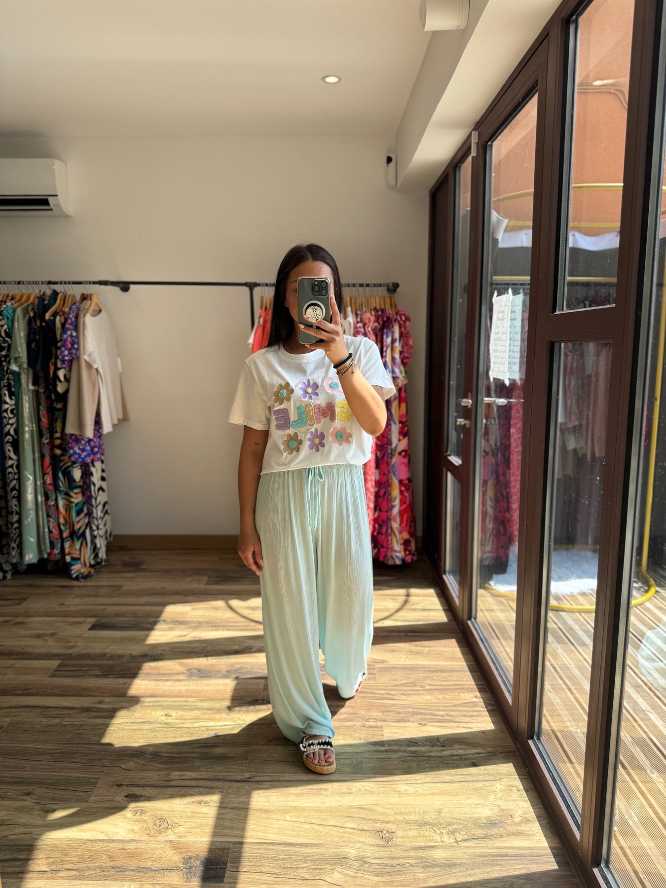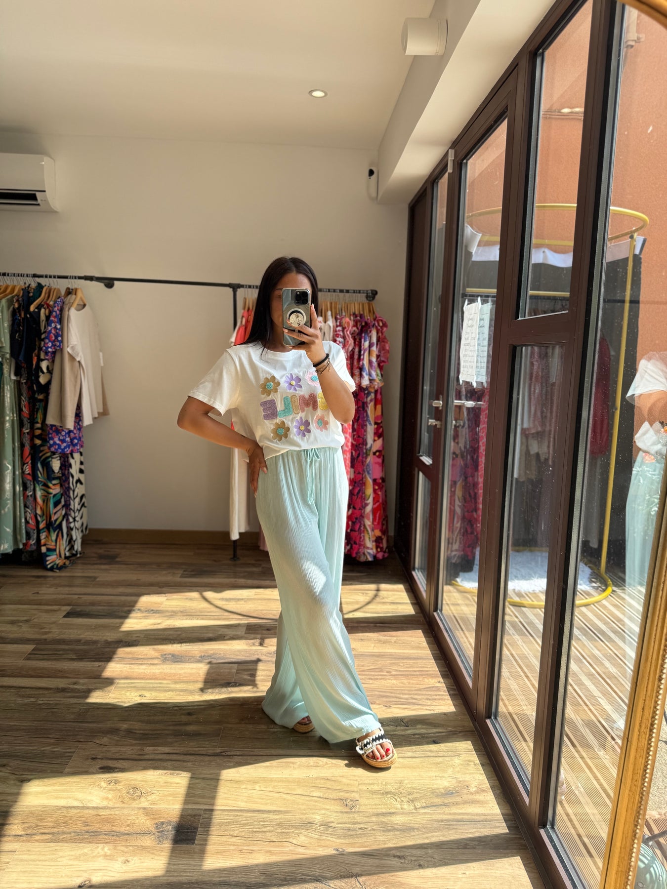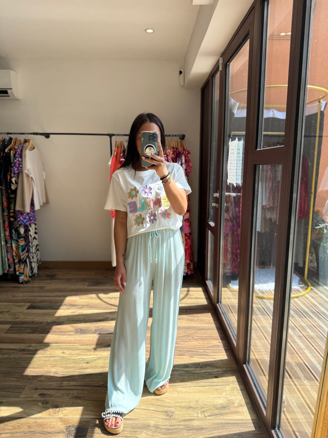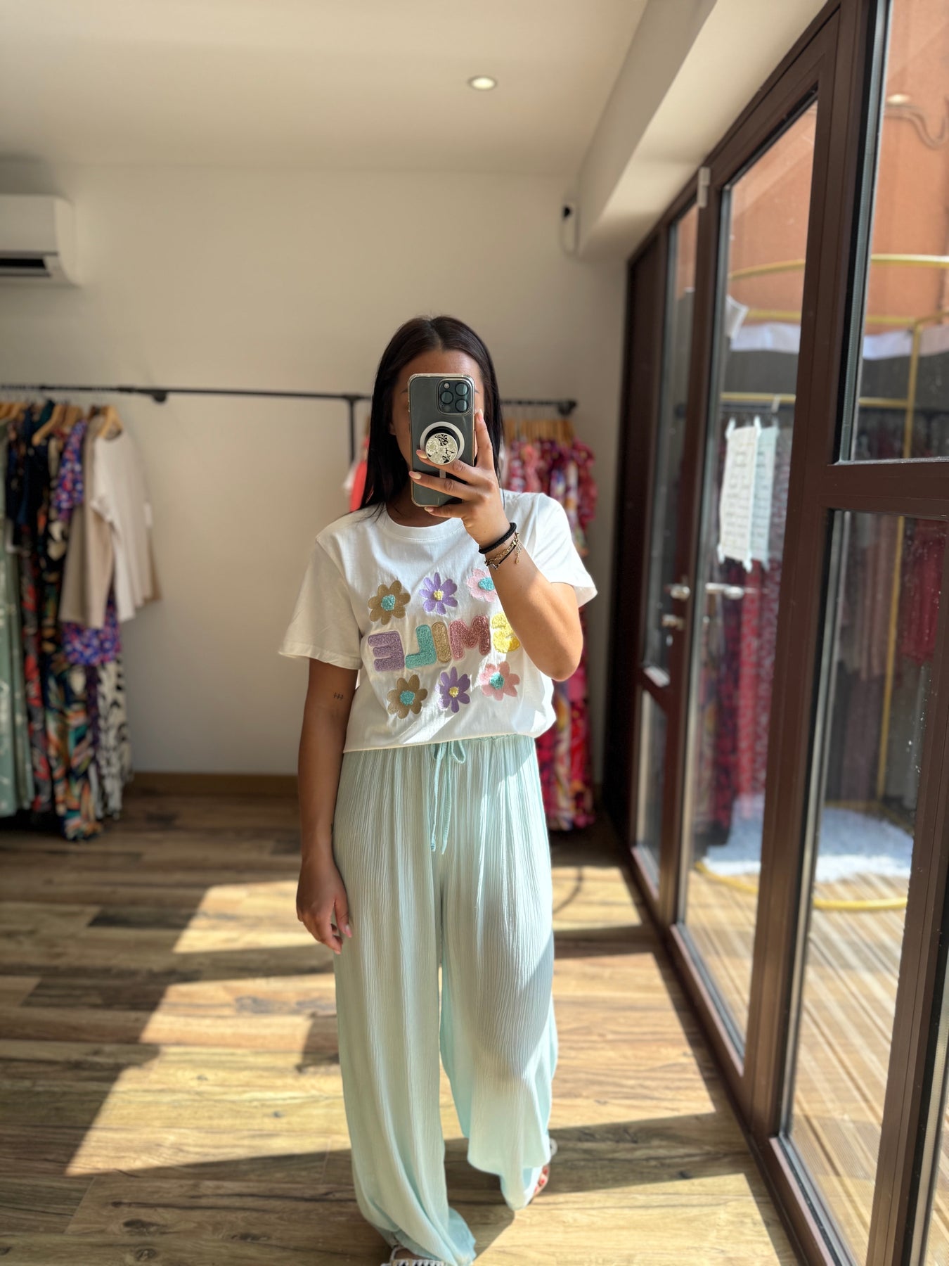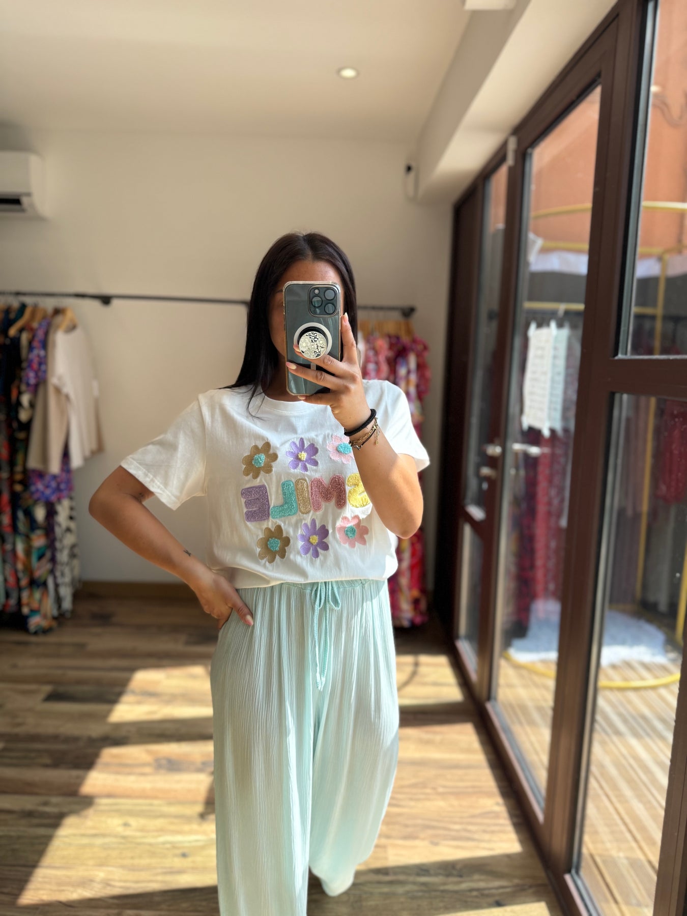 Un tee-shirt qui respire la bonne humeur avec ses broderies joyeuses et son message plein de peps ! On le glisse dans un pantalon fluide, un short ou une jupe pour une tenue casual pleine de fraîcheur. Gros coup de cœur avec le pantalon Velly vert d’eau 💚