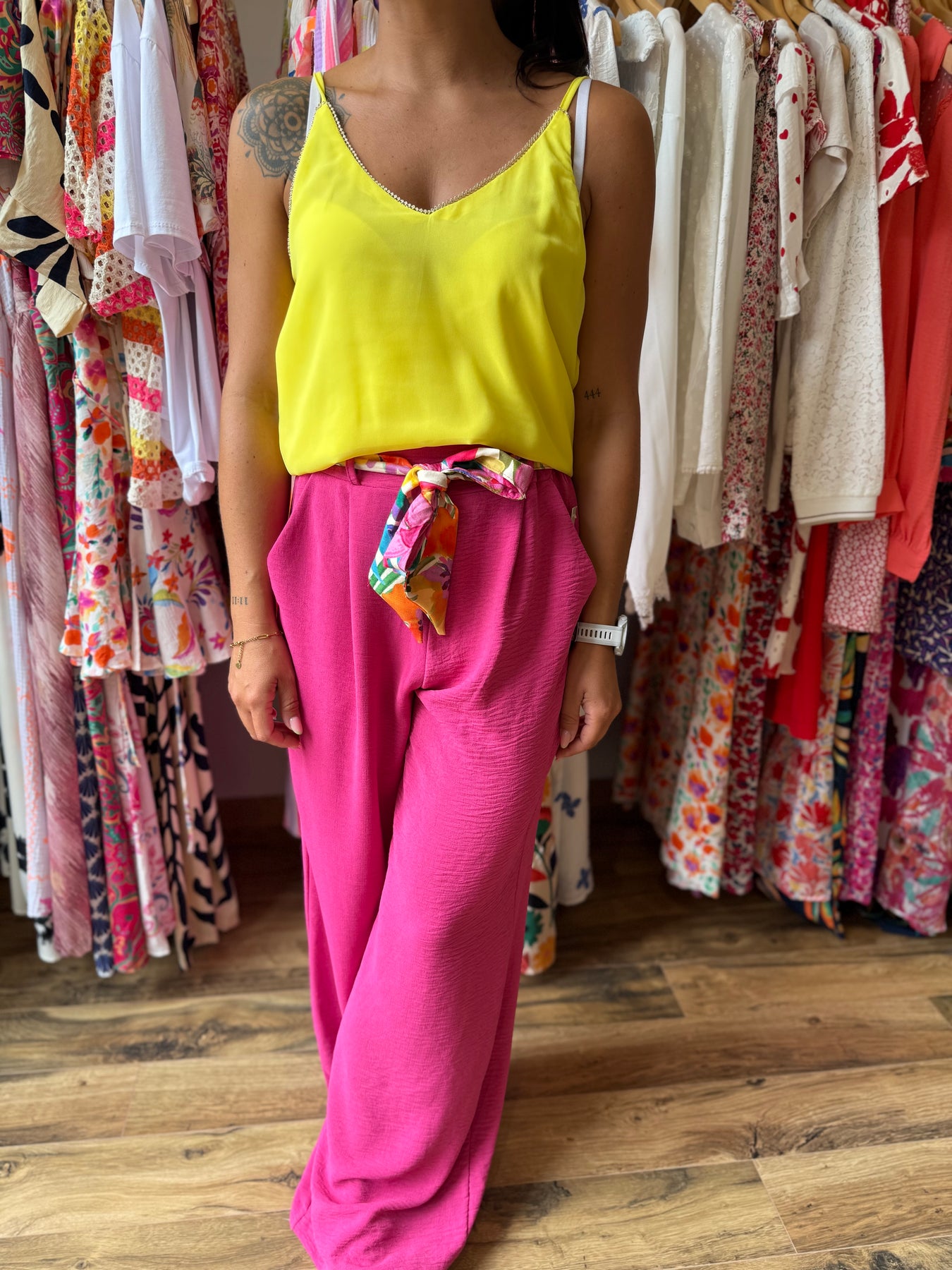 Le top “Grant” met instantanément de bonne humeur ! Son jaune éclatant, sa coupe fluide et son détail brillant au col lui donnent une allure ultra féminine. Il se porte aussi bien rentré dans un jean que sur une jupe longue ou un pantalon large. Un must-have pour illuminer vos tenues estivales 🌞