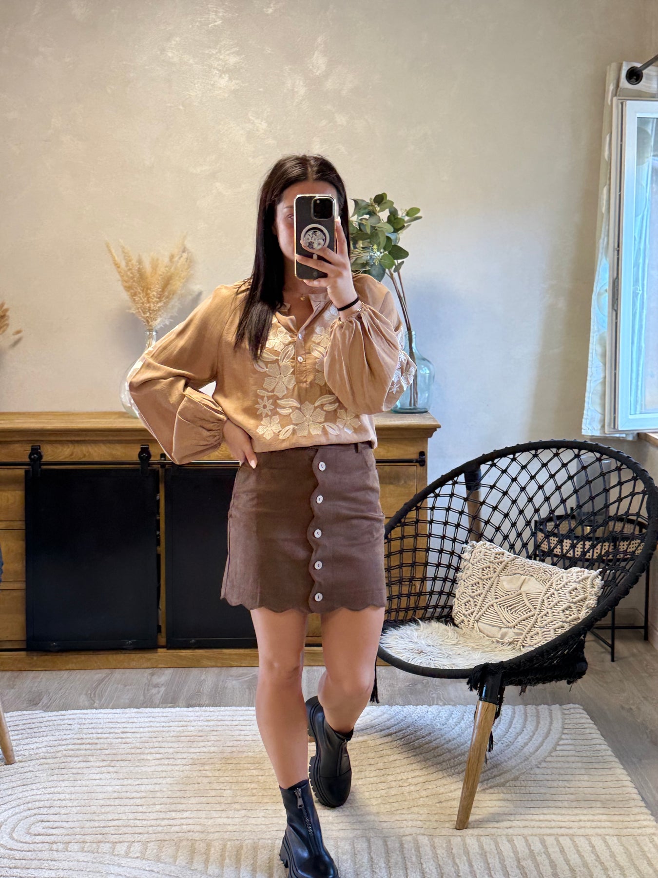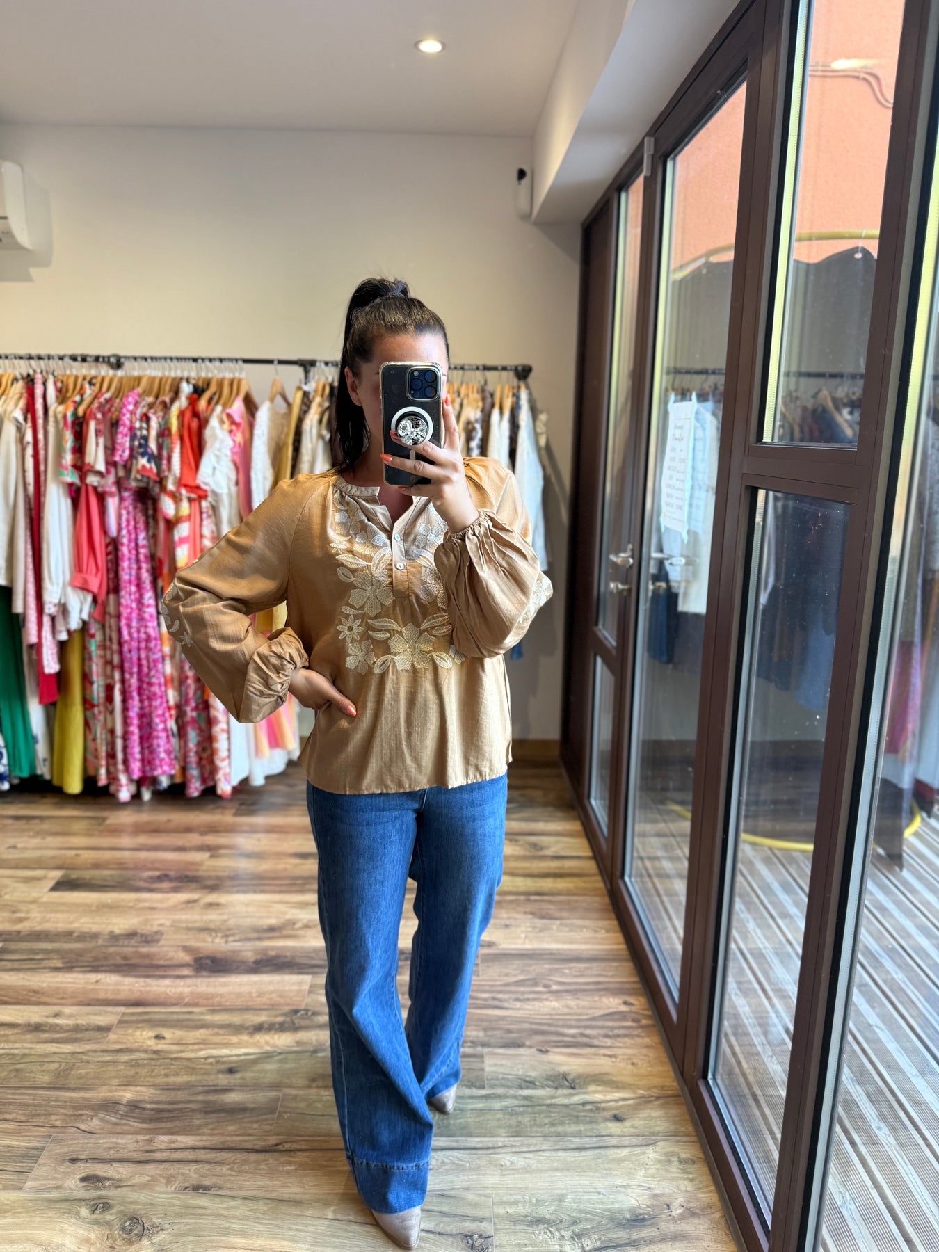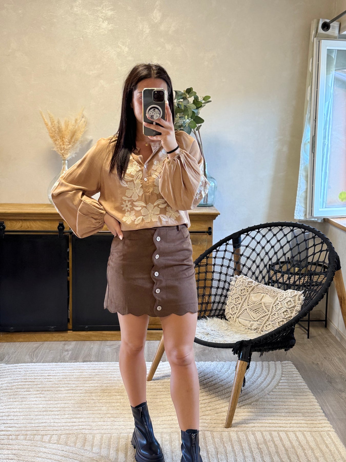• Chemise camel avec broderies florales ivoire