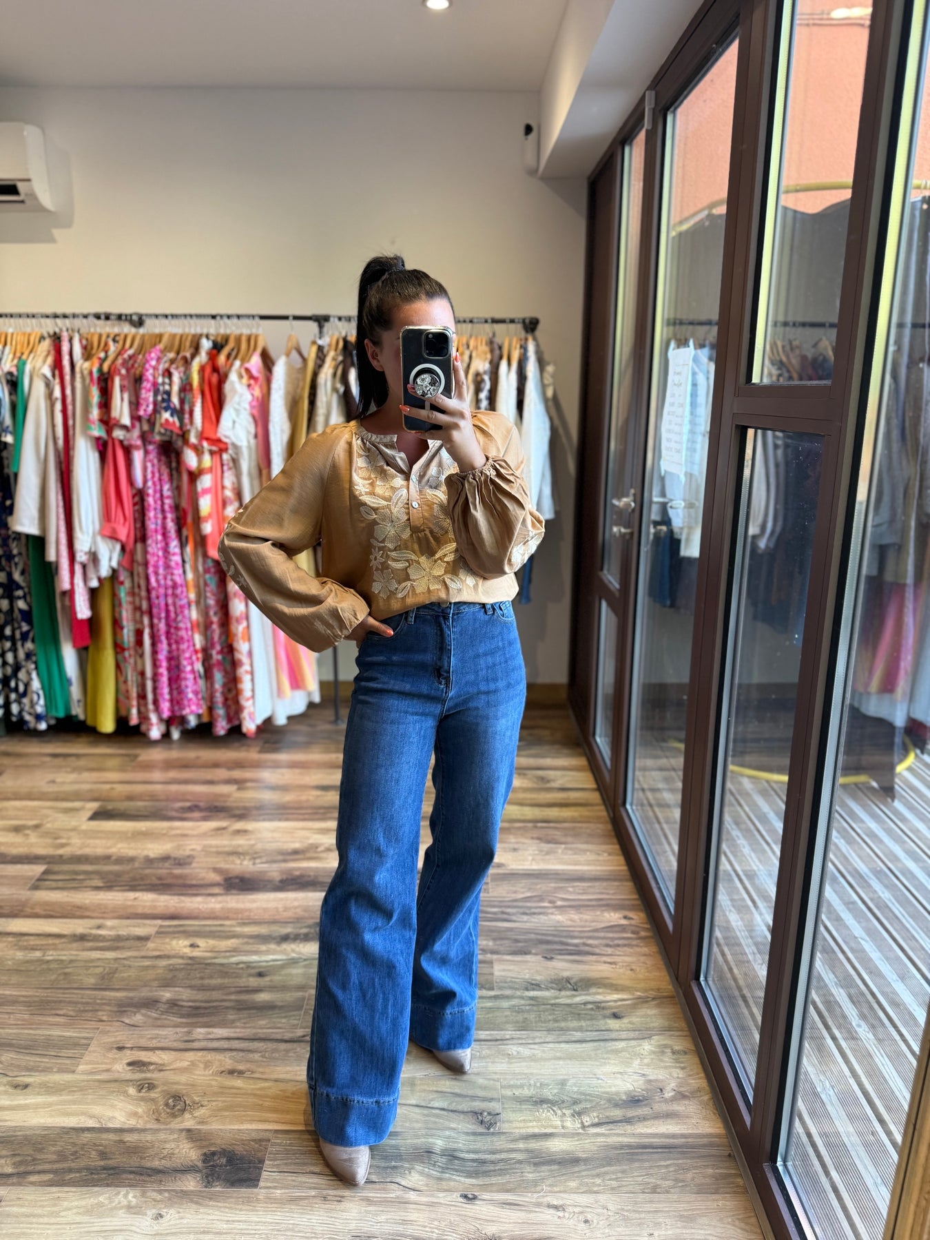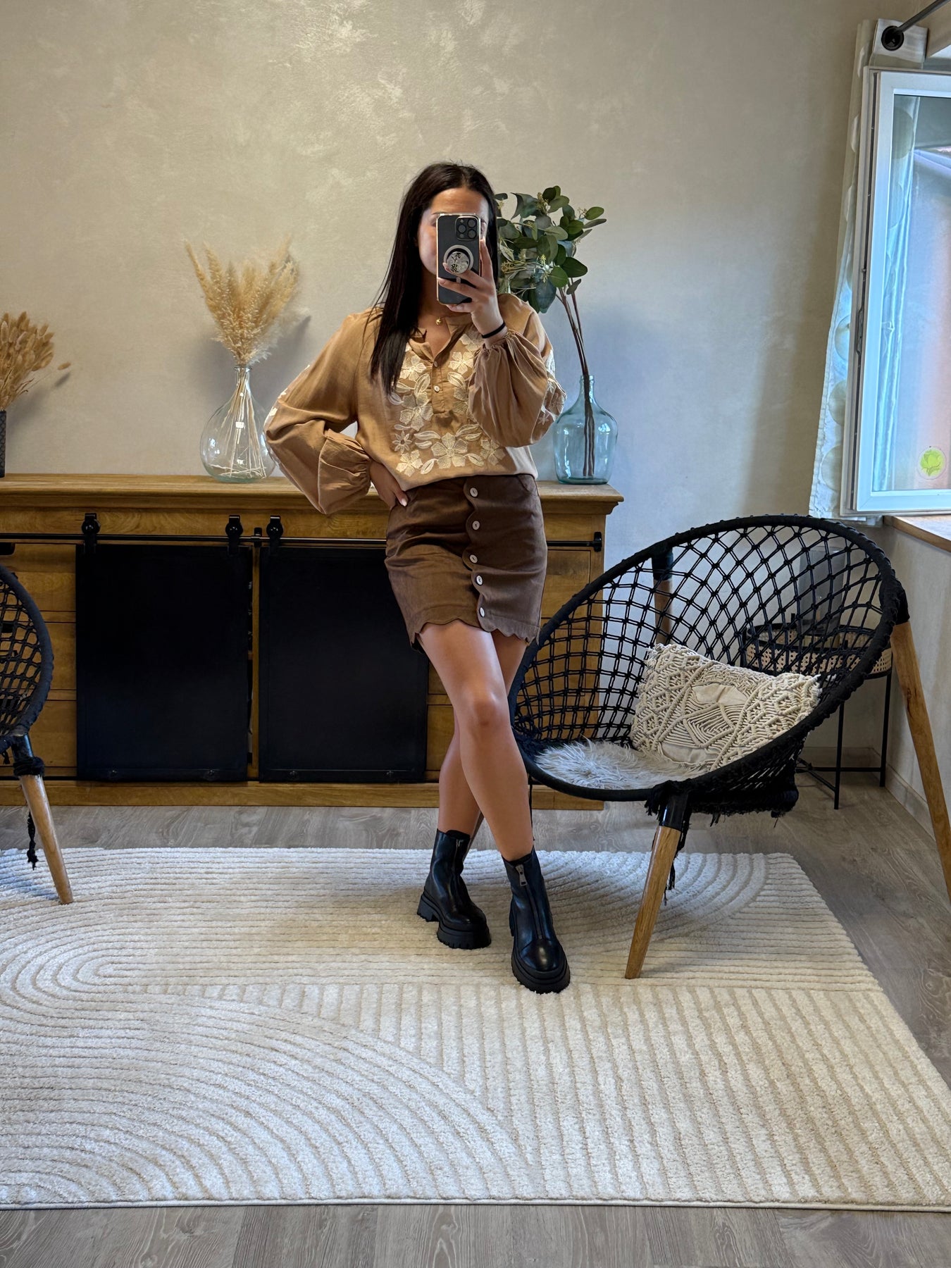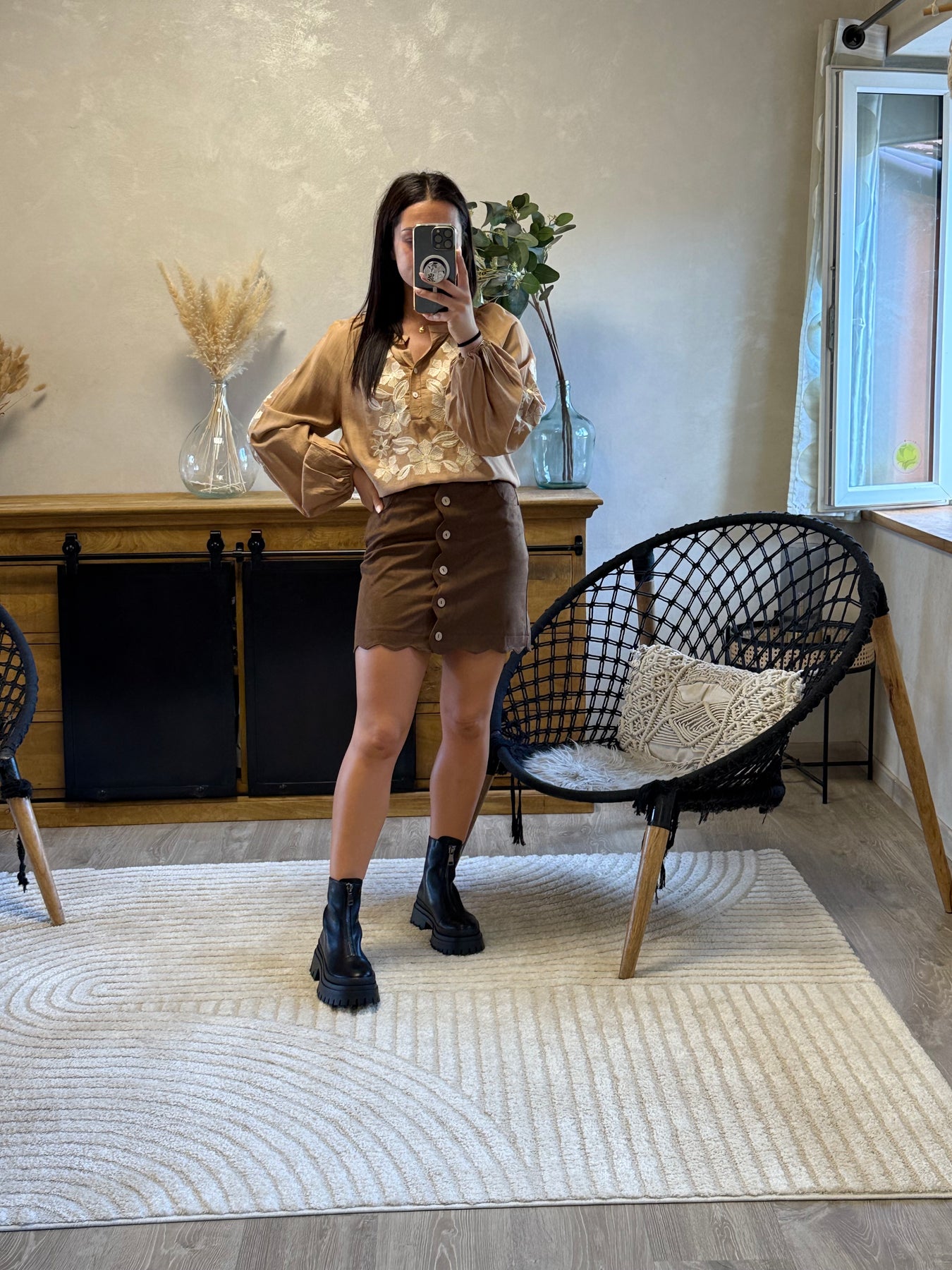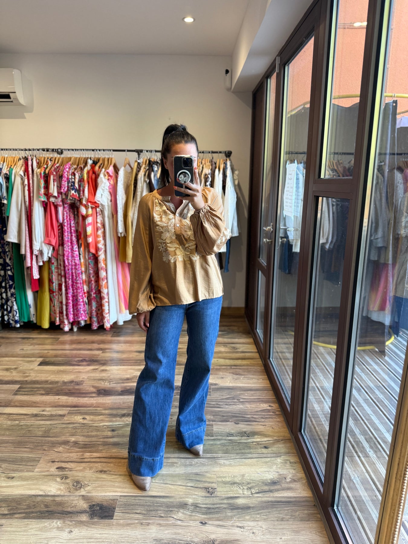 • Chemise camel avec broderies florales ivoire