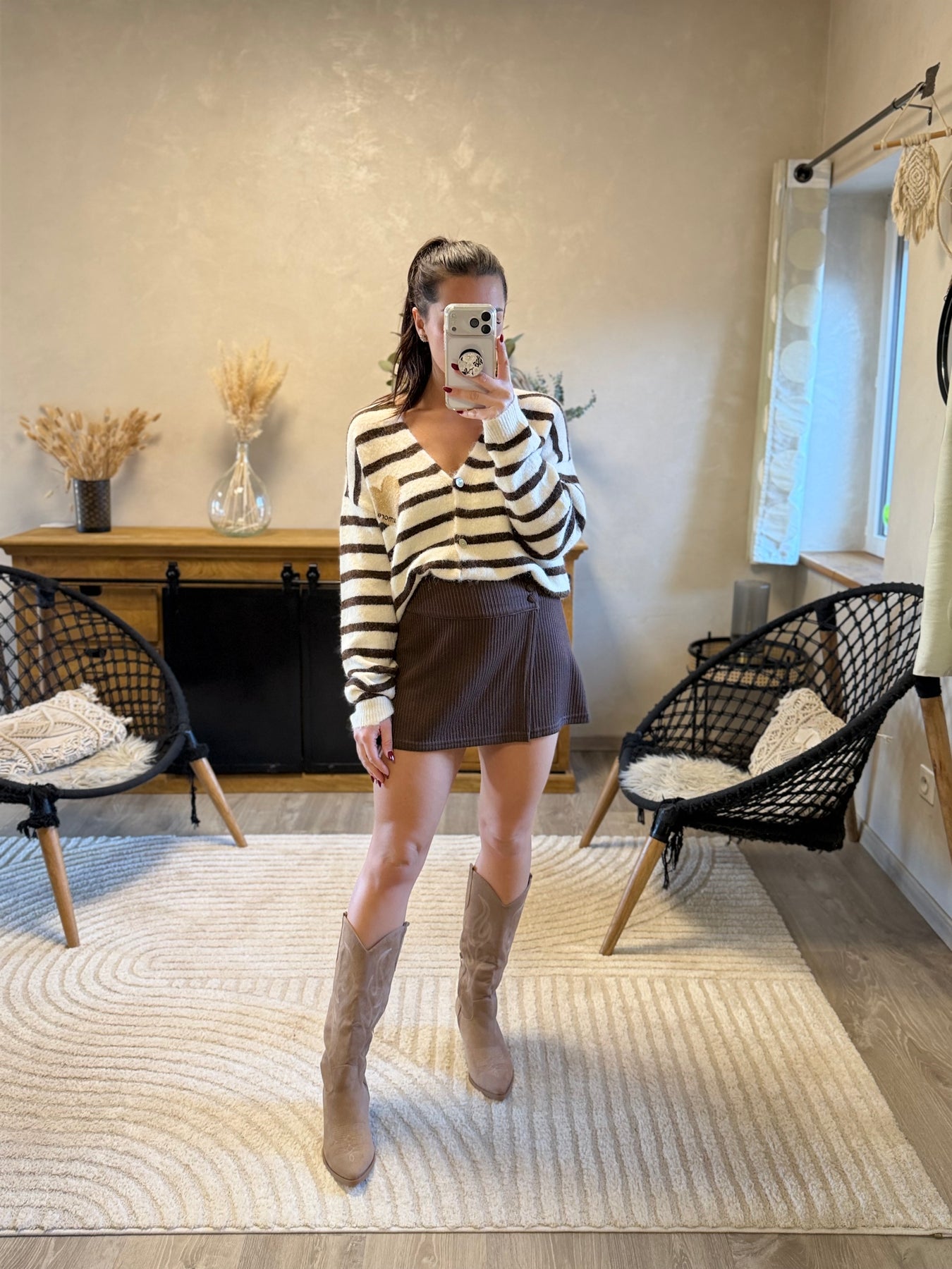 👉 Alicia mesure 1m57 et porte la taille unique, associée à une jupe-short chocolat.