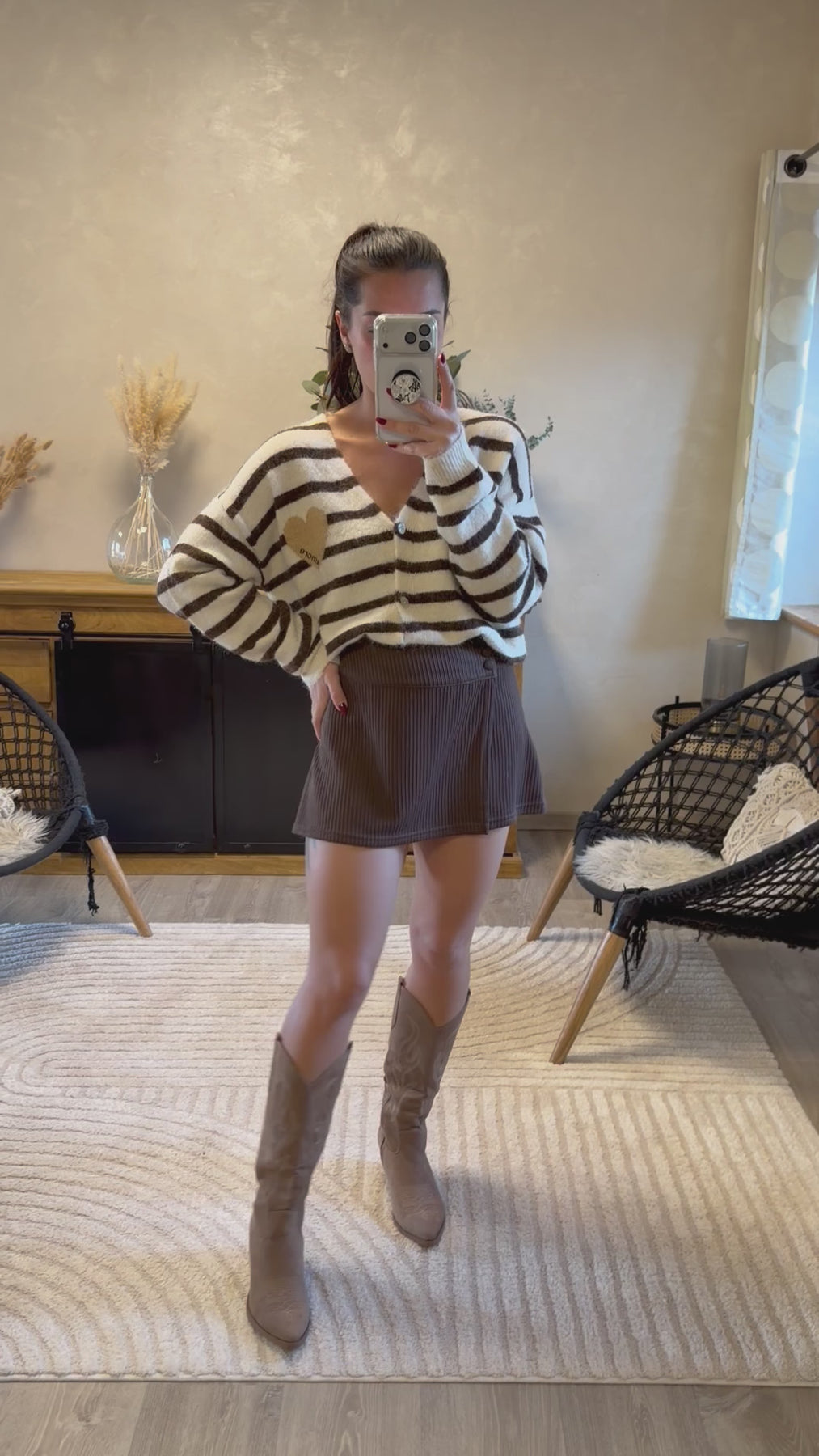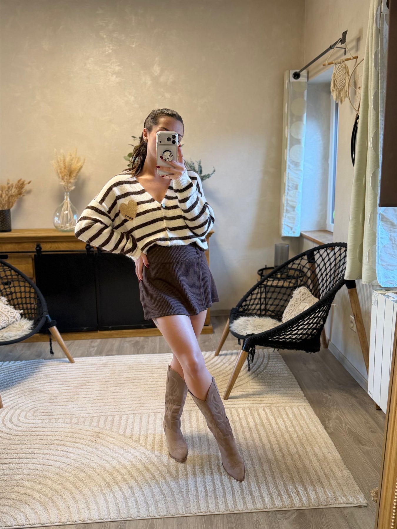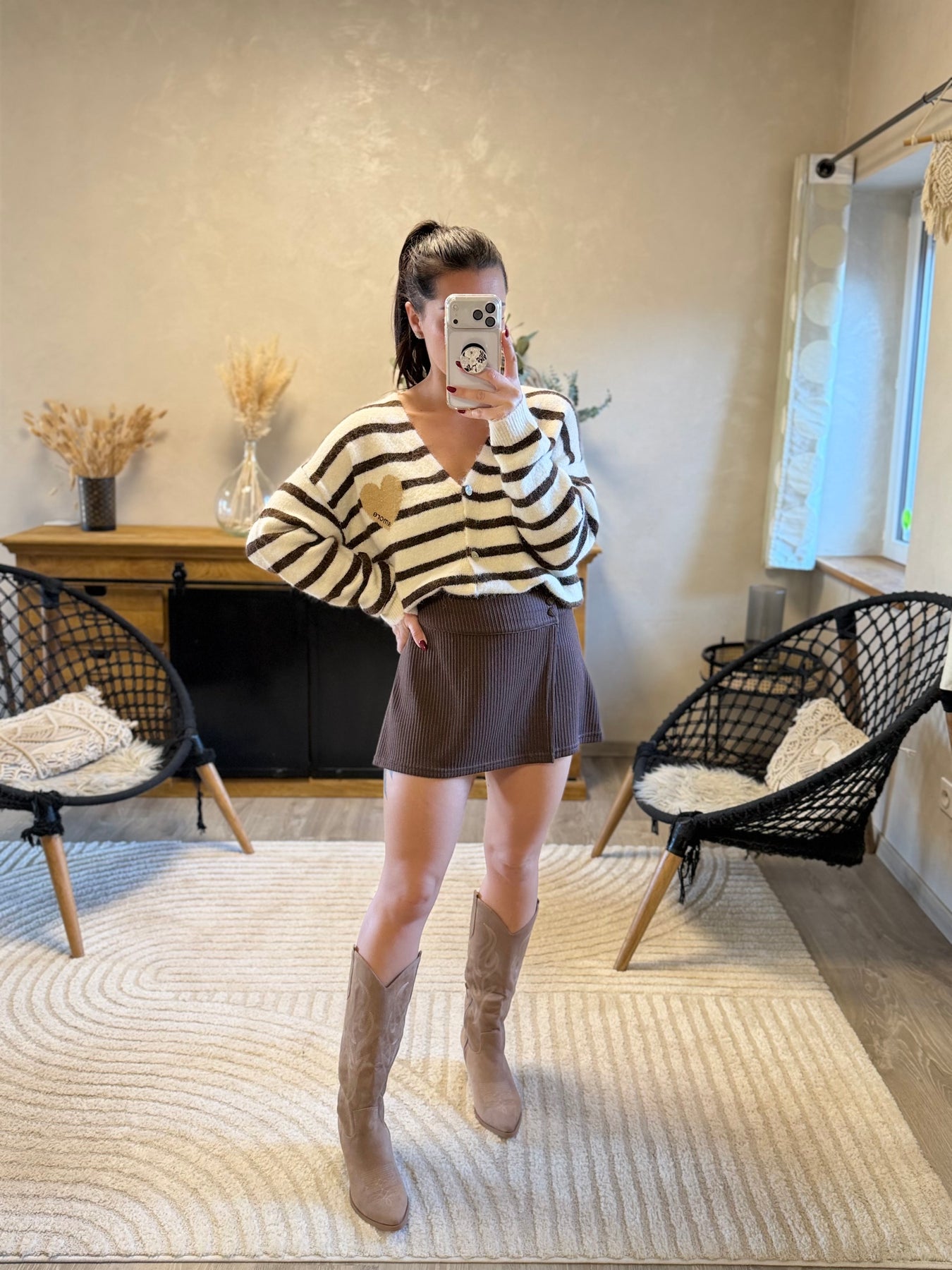 Sa maille douce réchauffe, ses rayures apportent une touche tendance, et son petit cœur brodé lui donne un charme irrésistible. On le porte aussi bien rentré dans une jupe-short pour un look chic & cosy, qu’avec un jean pour un style plus décontracté. Un indispensable pour l’automne-hiver ✨