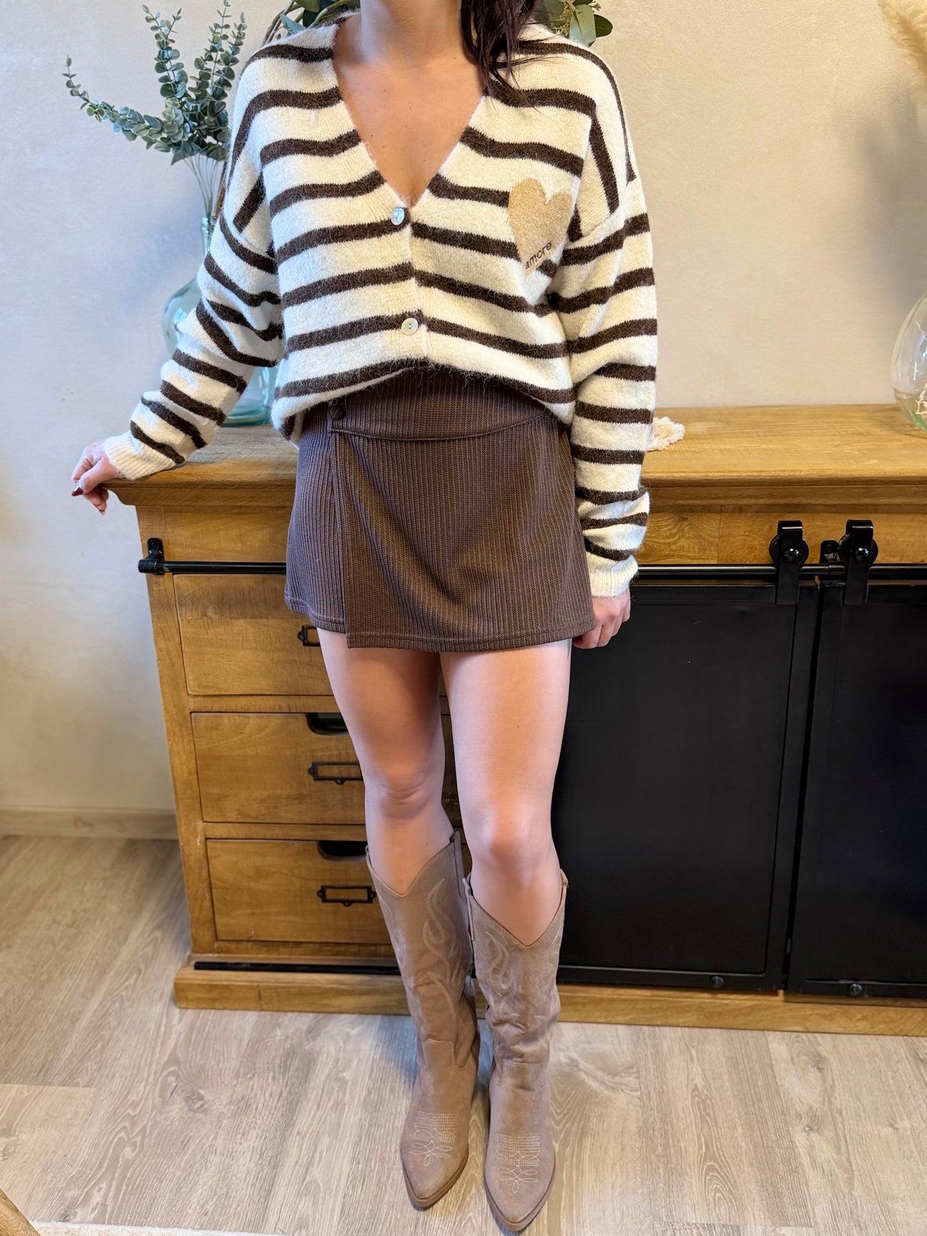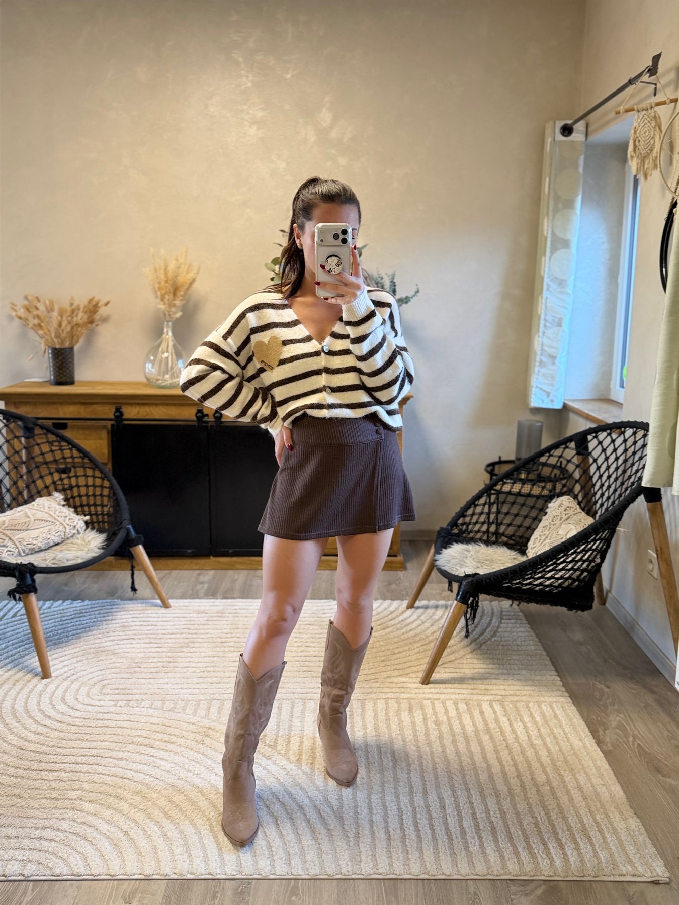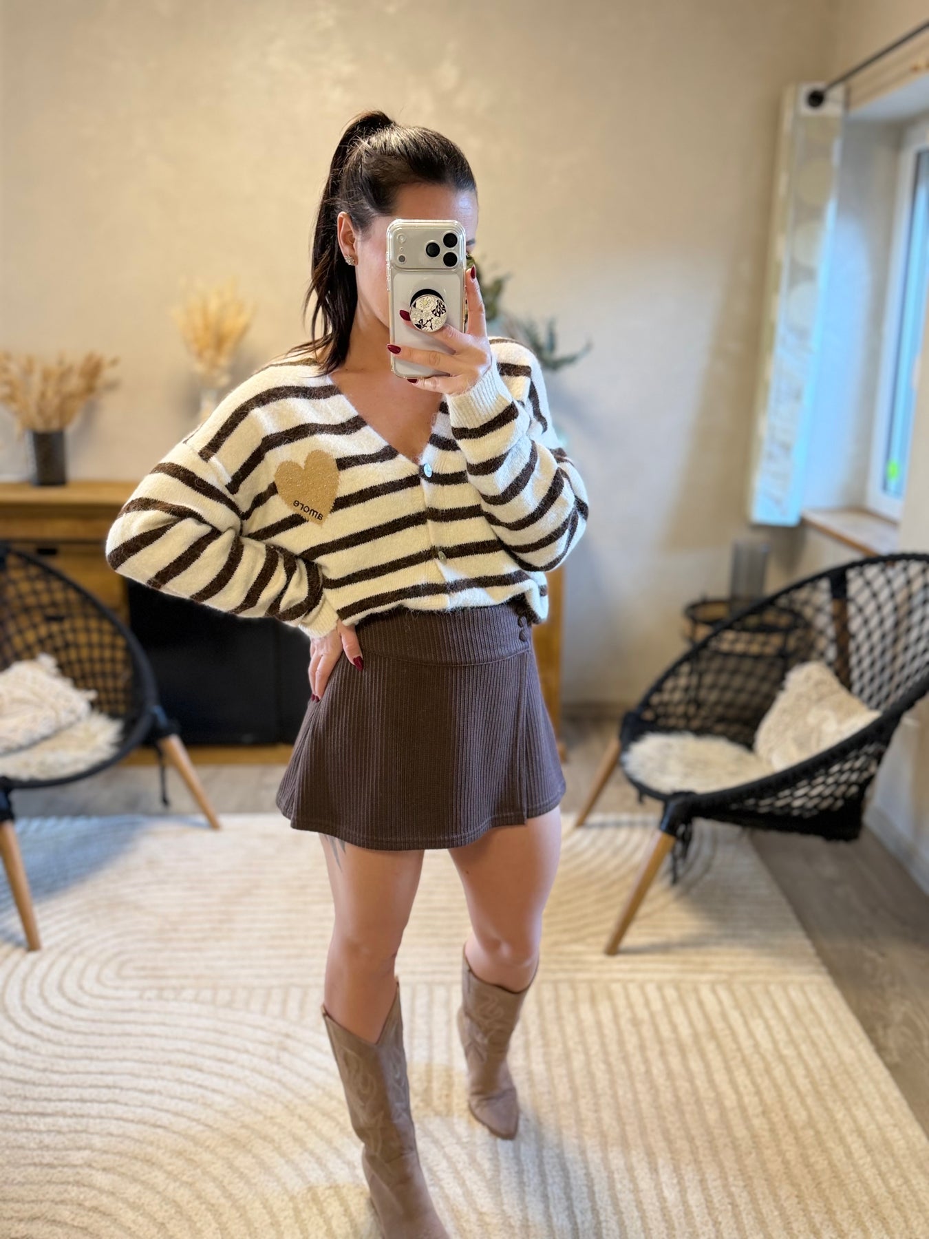 Sa maille douce réchauffe, ses rayures apportent une touche tendance, et son petit cœur brodé lui donne un charme irrésistible. On le porte aussi bien rentré dans une jupe-short pour un look chic & cosy, qu’avec un jean pour un style plus décontracté. Un indispensable pour l’automne-hiver ✨