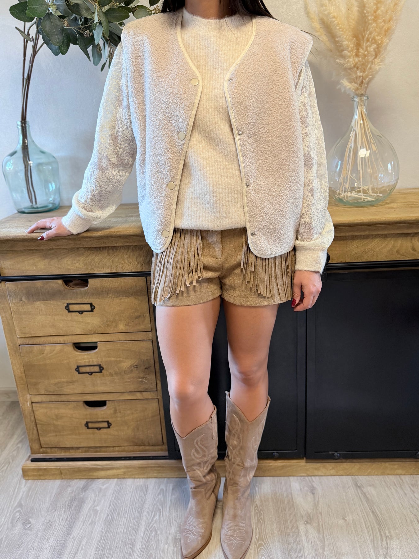 Alicia (1m57, porte du 36) présente ici le gilet Aldo associé au pull Dipa et au short Mariah, pour un look tout en douceur à l’esprit western chic 🤎