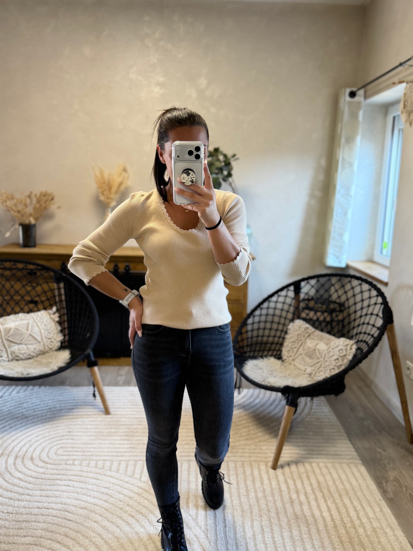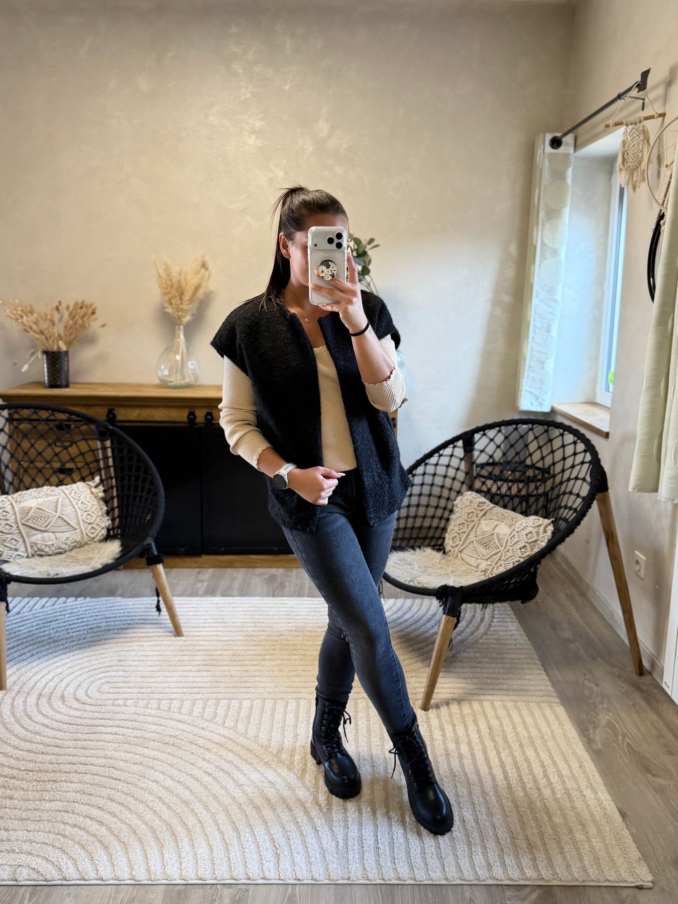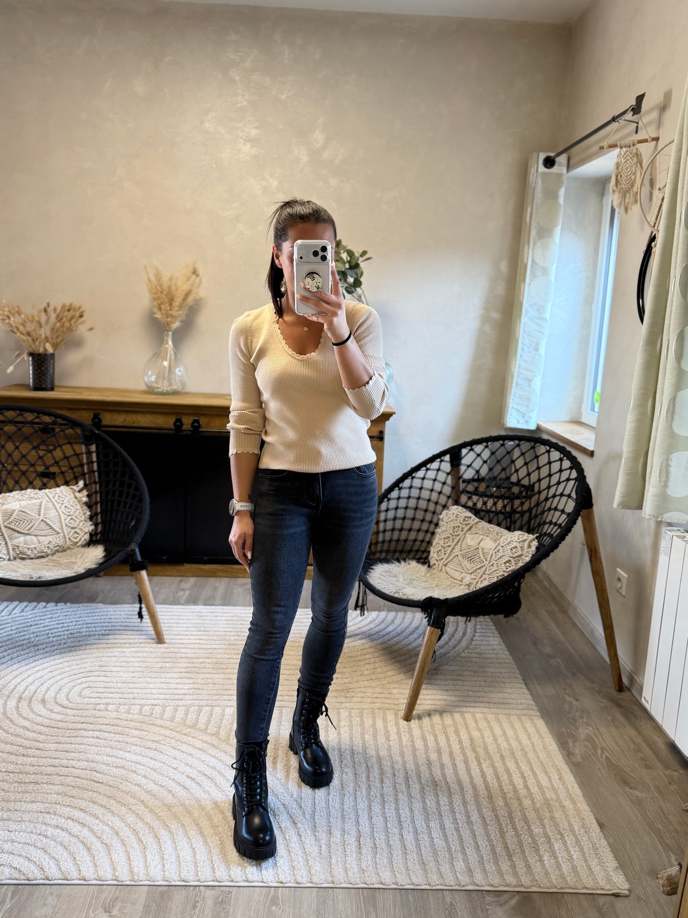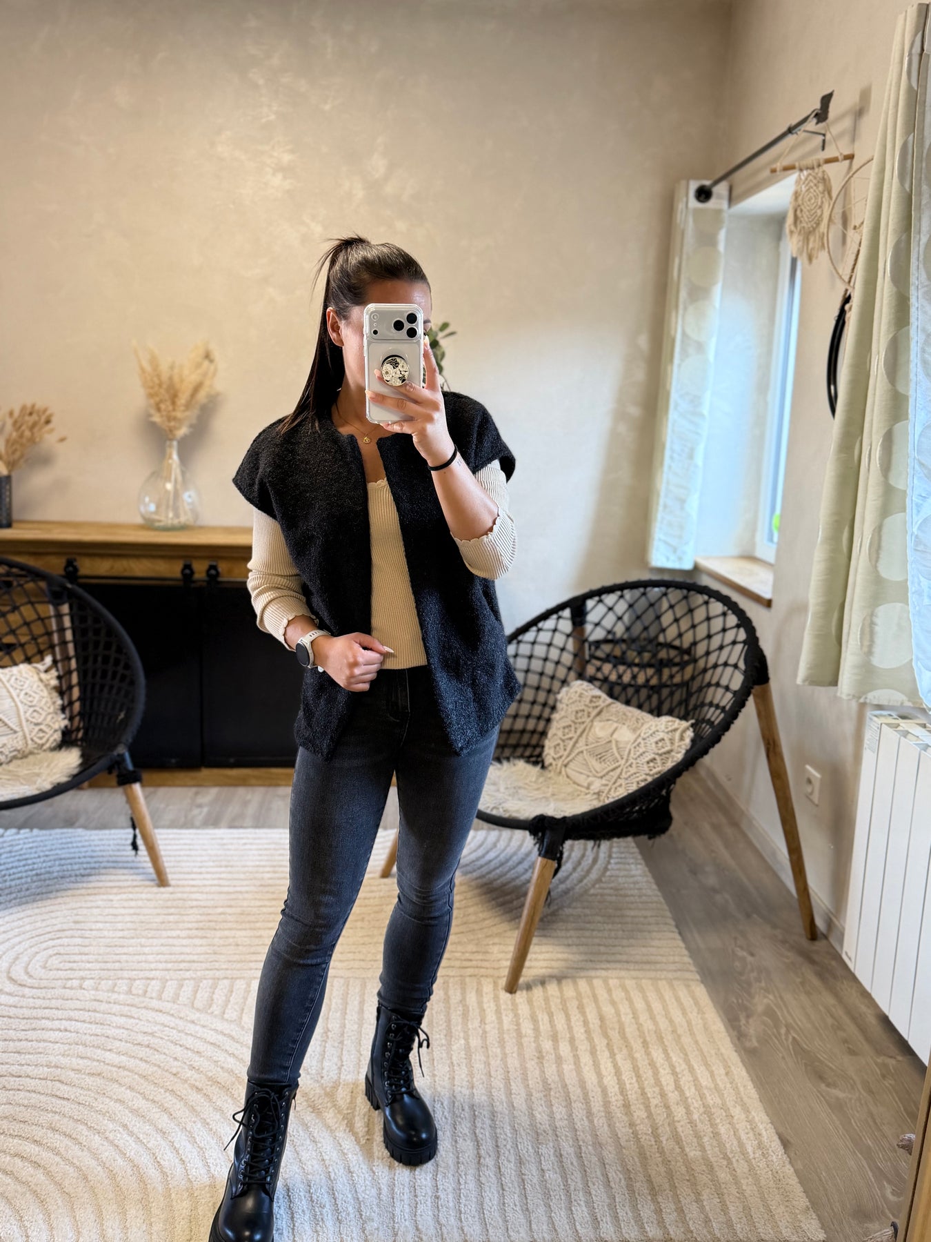 Alicia (1m57, porte du 36) présente ici le jean slim Apo associé au pull fin Aragone et à la veste Marthe noire pour un look moderne et élégant.