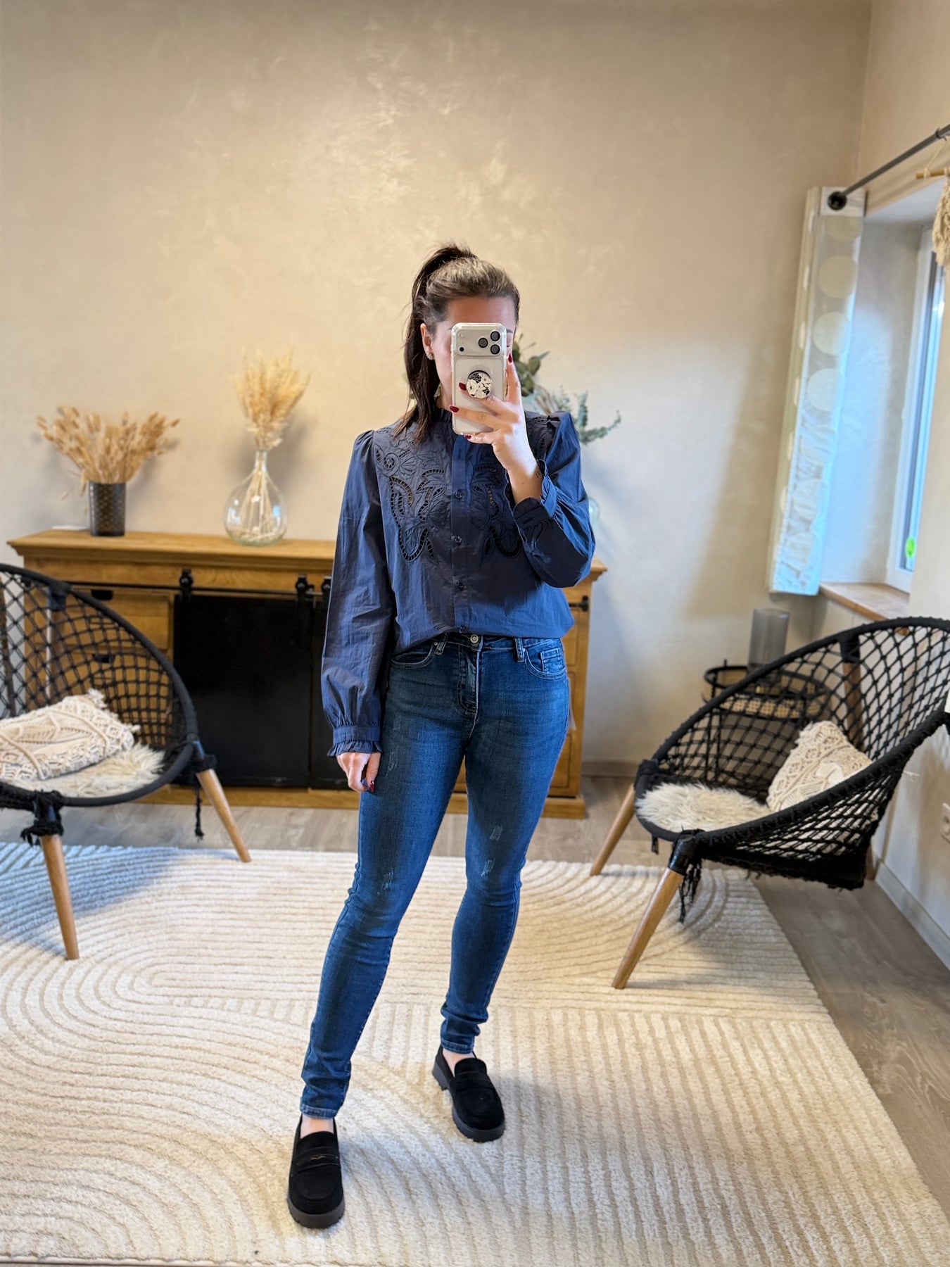 Alicia mesure 1m57 et porte la taille 36, associé à la chemise Miranda pour un look chic et moderne 💙
