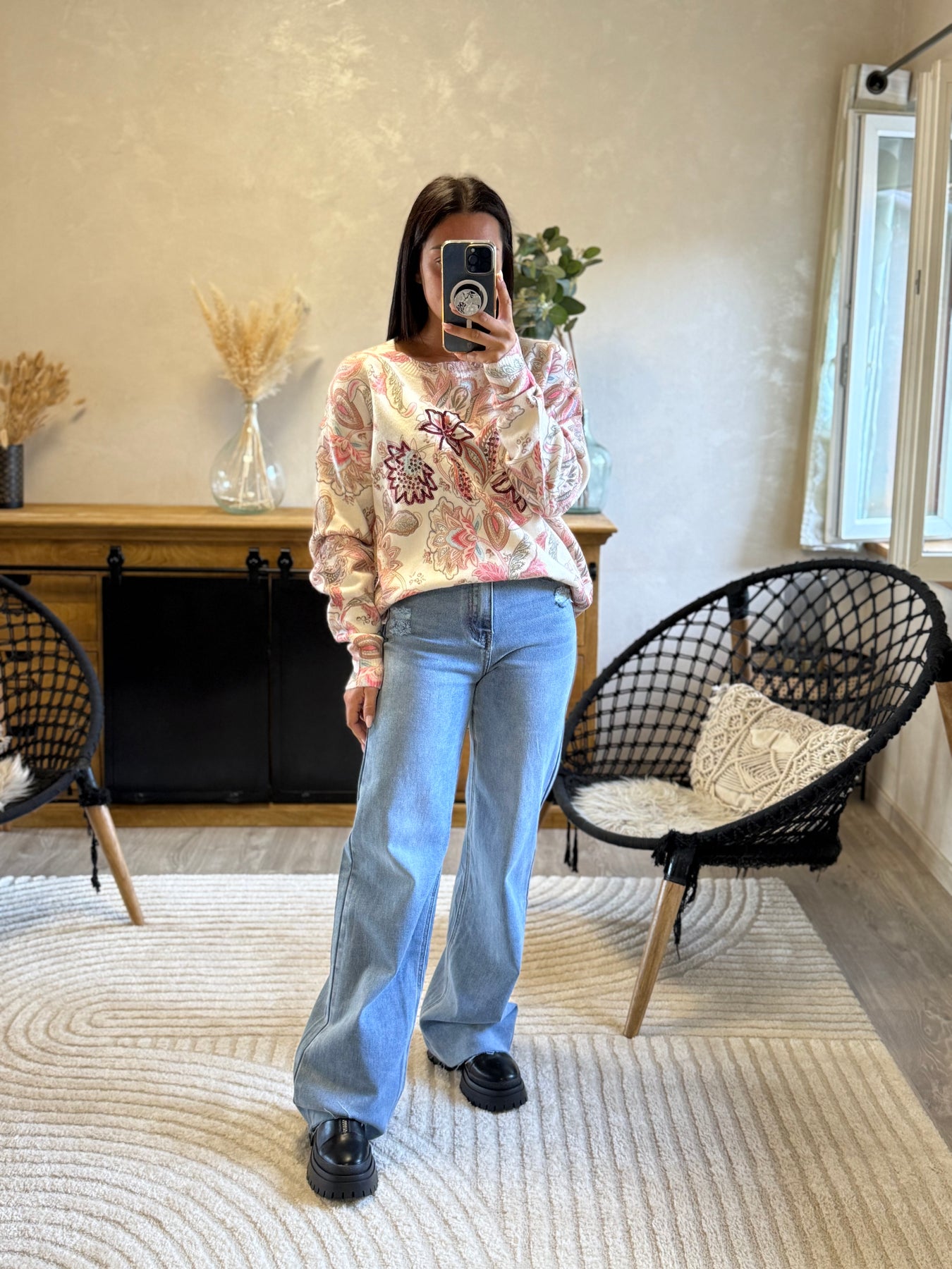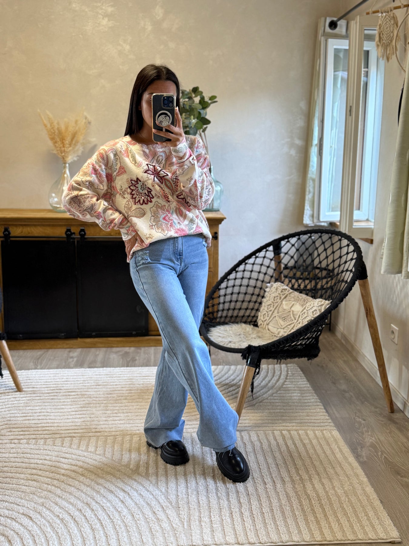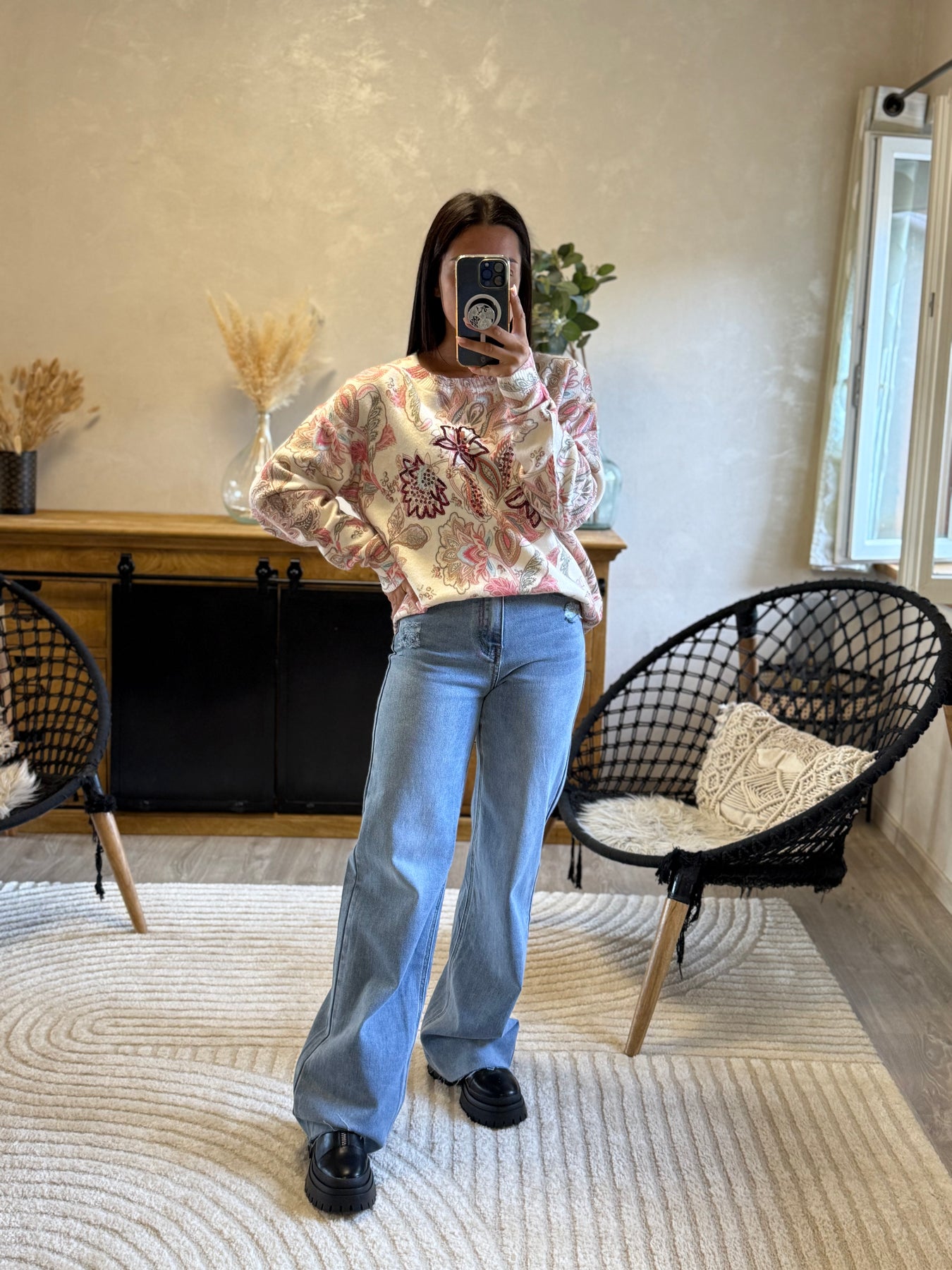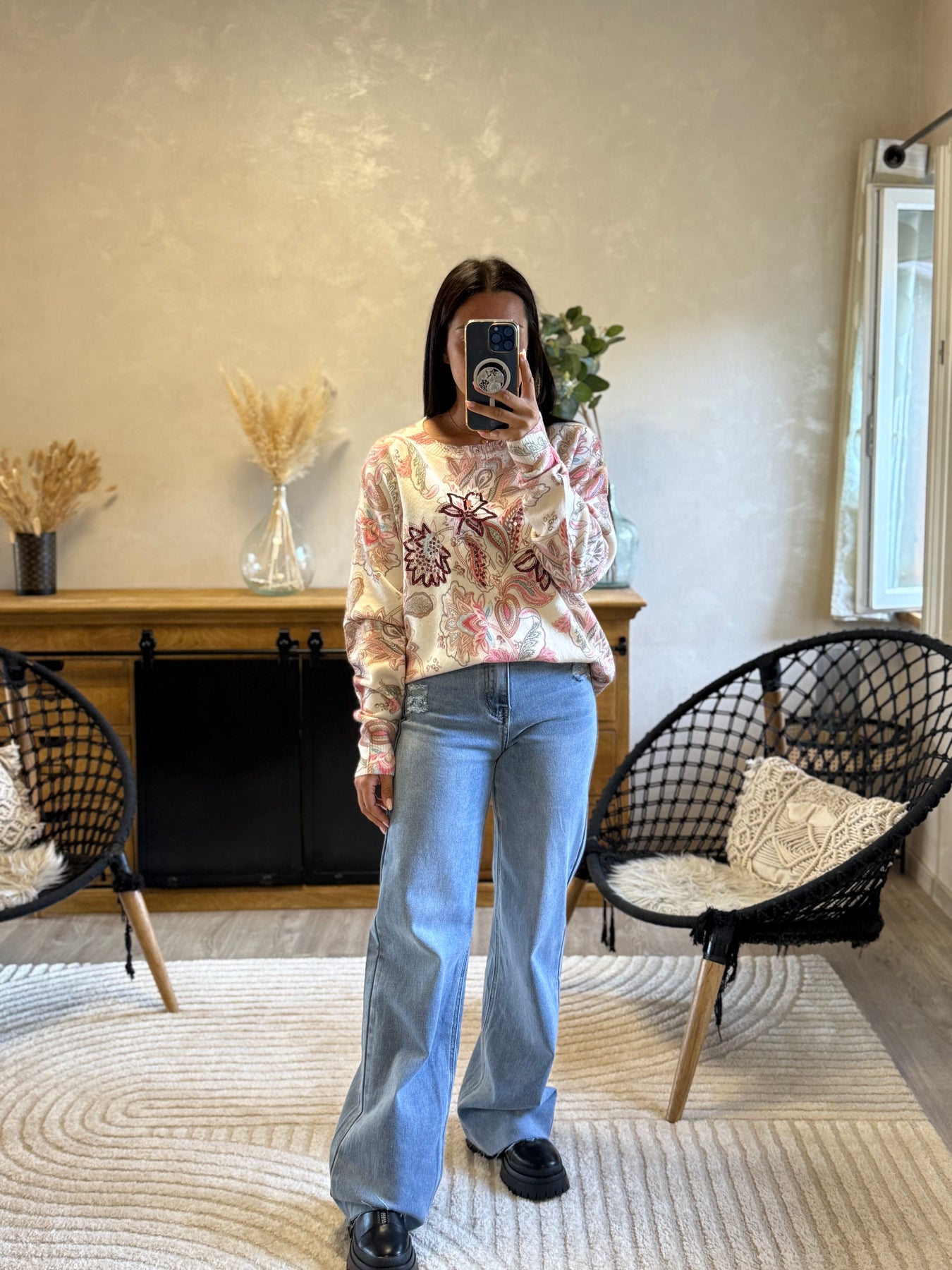 Le pull Léandre apporte une touche originale et chaleureuse à ton dressing. Ses broderies perlées sur fond imprimé cachemire en font une pièce unique qui attire le regard ✨. Ici porté avec le jean Antho, il crée un look casual et chic parfait pour illuminer les journées fraîches.
