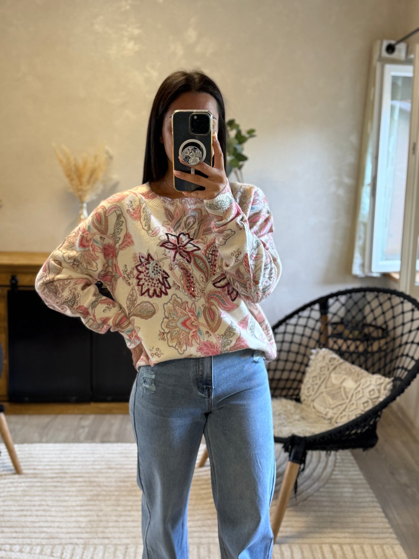 - Pull à imprimé cachemire fleuri avec détails brodés et perles