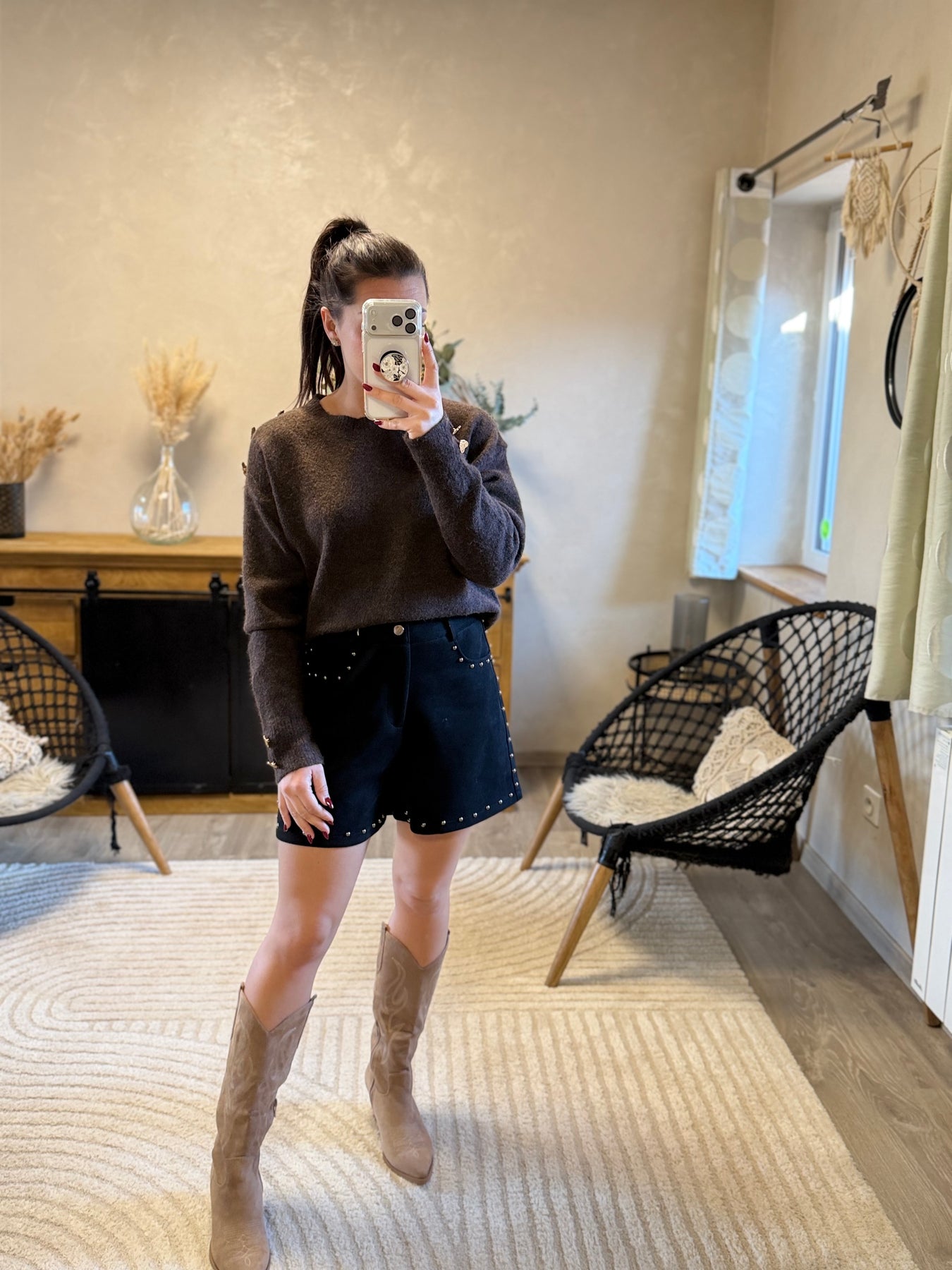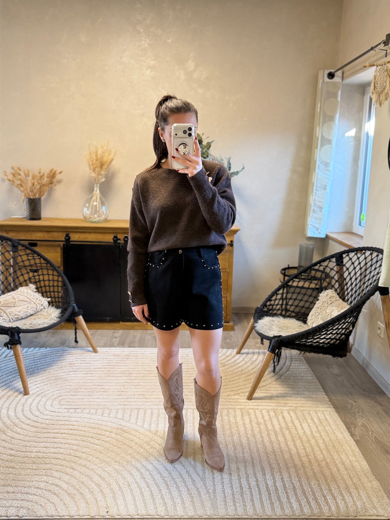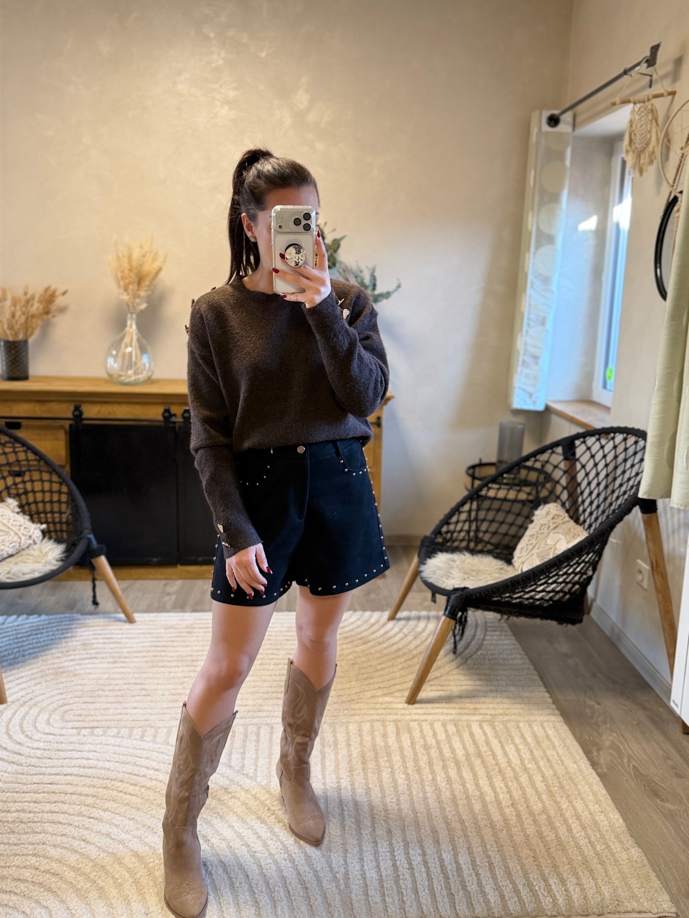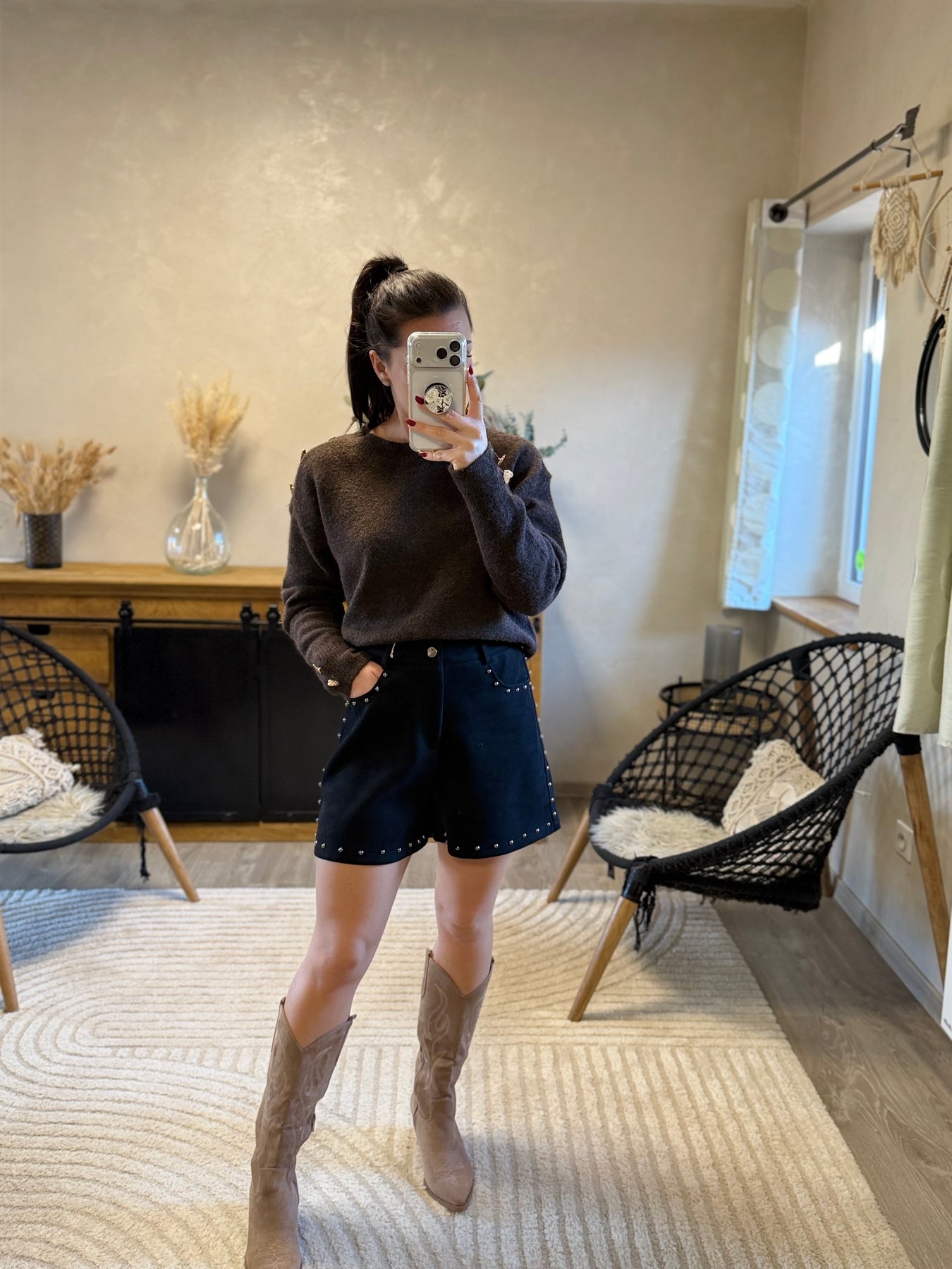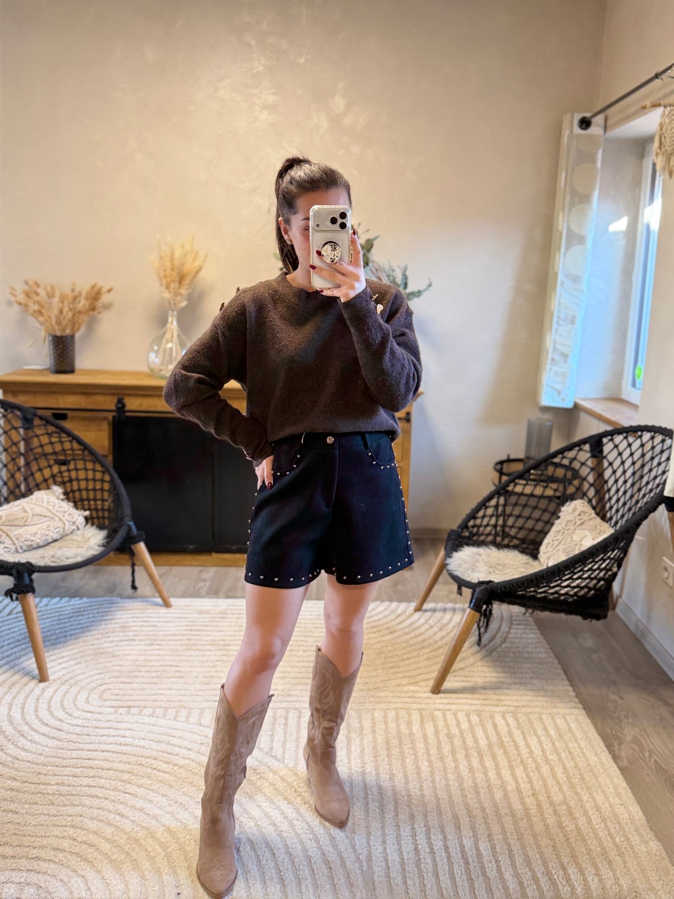 Alicia mesure 1m57 et porte la TU, associée au short Loris noir et aux bottes camel pour un look automnal chic et féminin 🍂