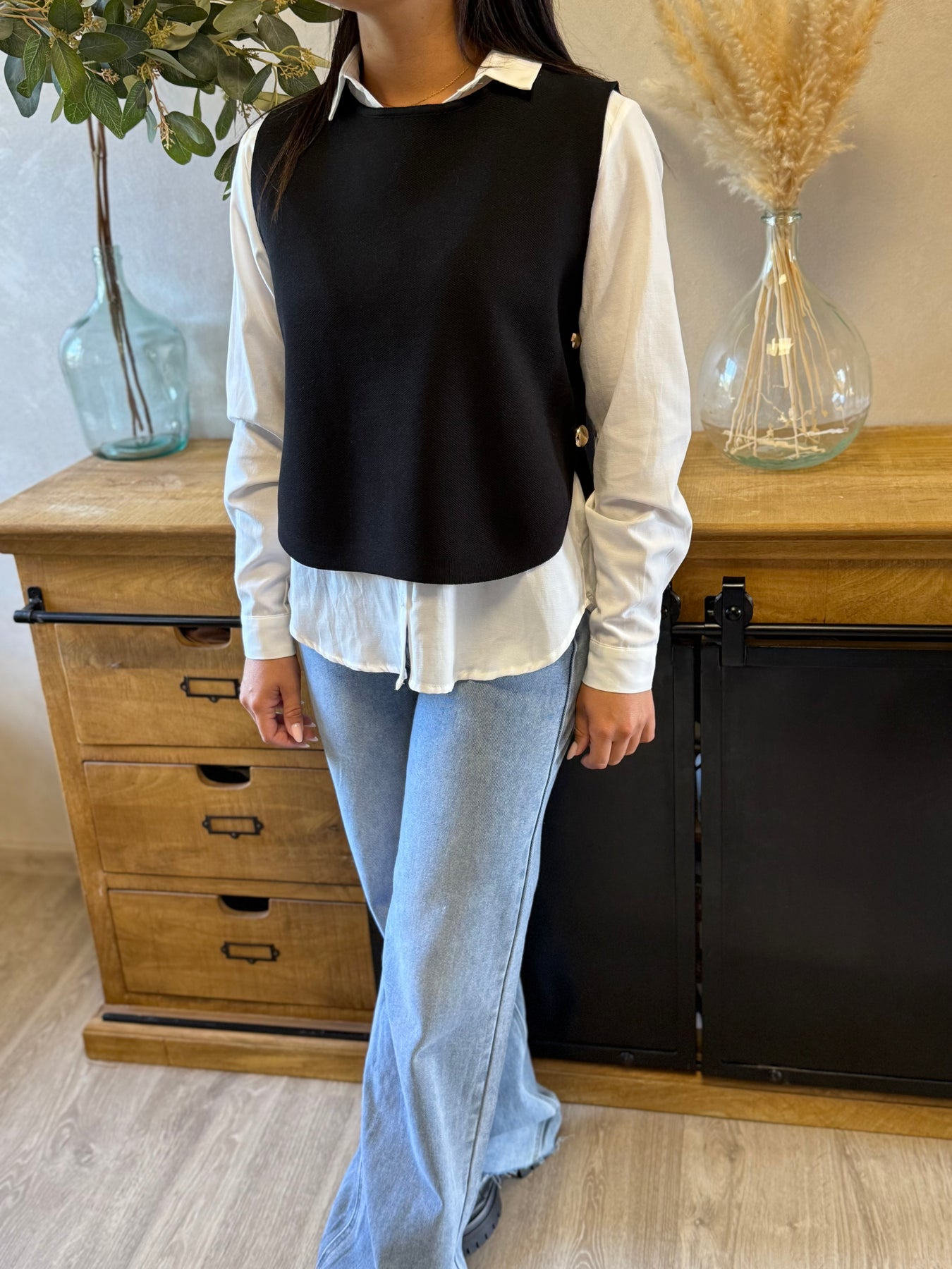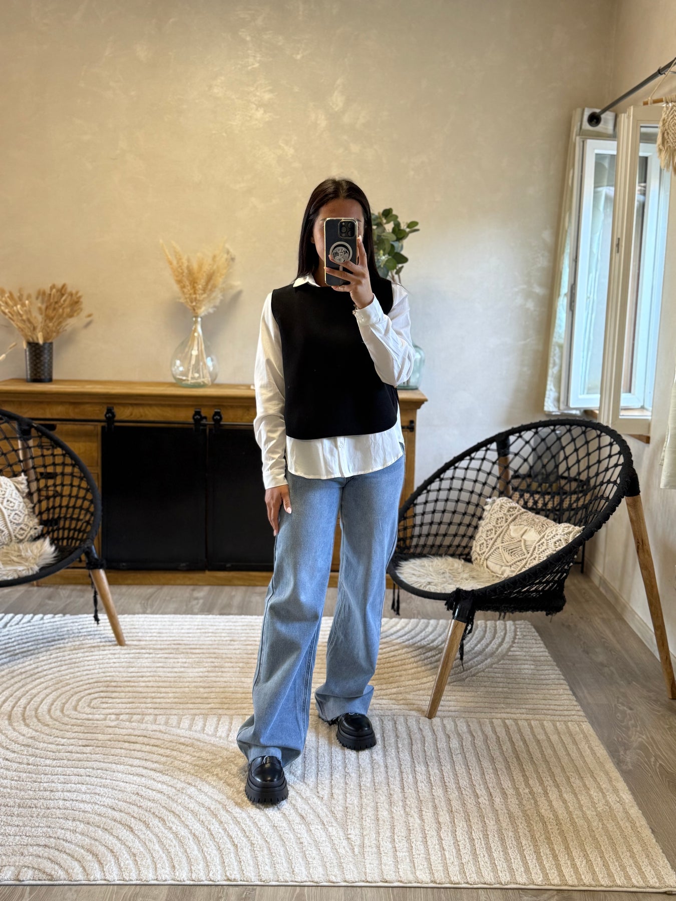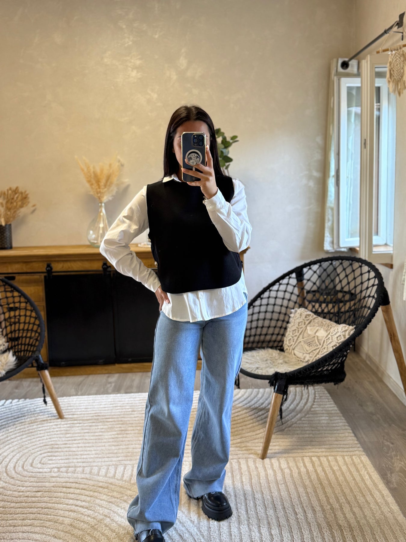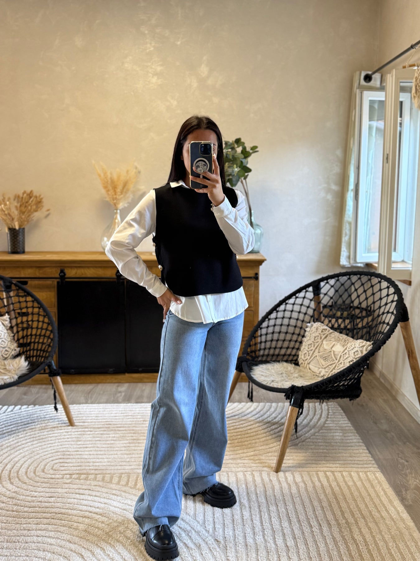 Le pull sans manches noir est un essentiel moderne, parfait pour jouer avec les superpositions. Ici porté avec la chemise blanche Ondine et le jean Antho, il crée un look tendance et sophistiqué. On aime son côté minimaliste twisté par les détails boutons sur les côtés ✨.