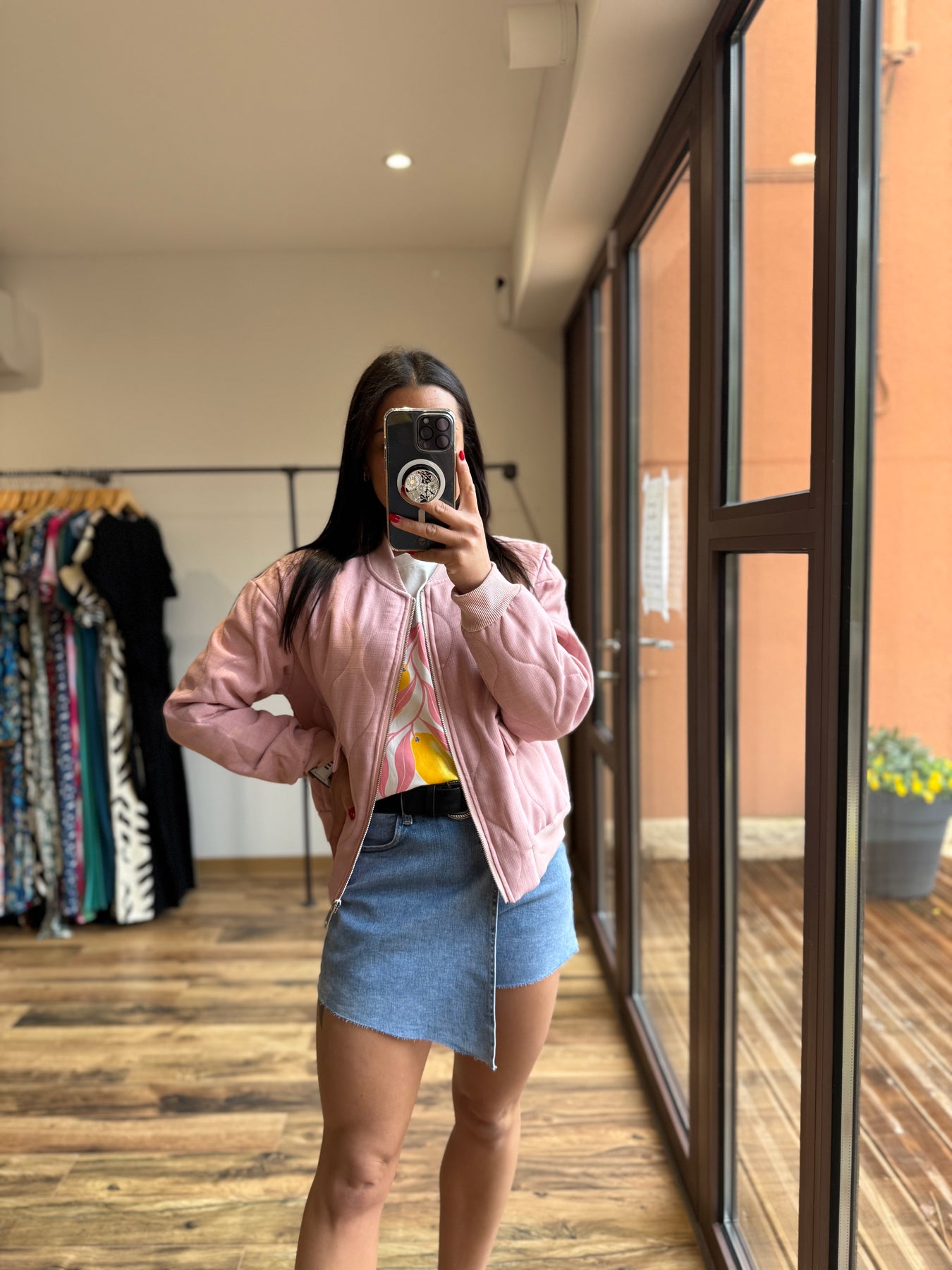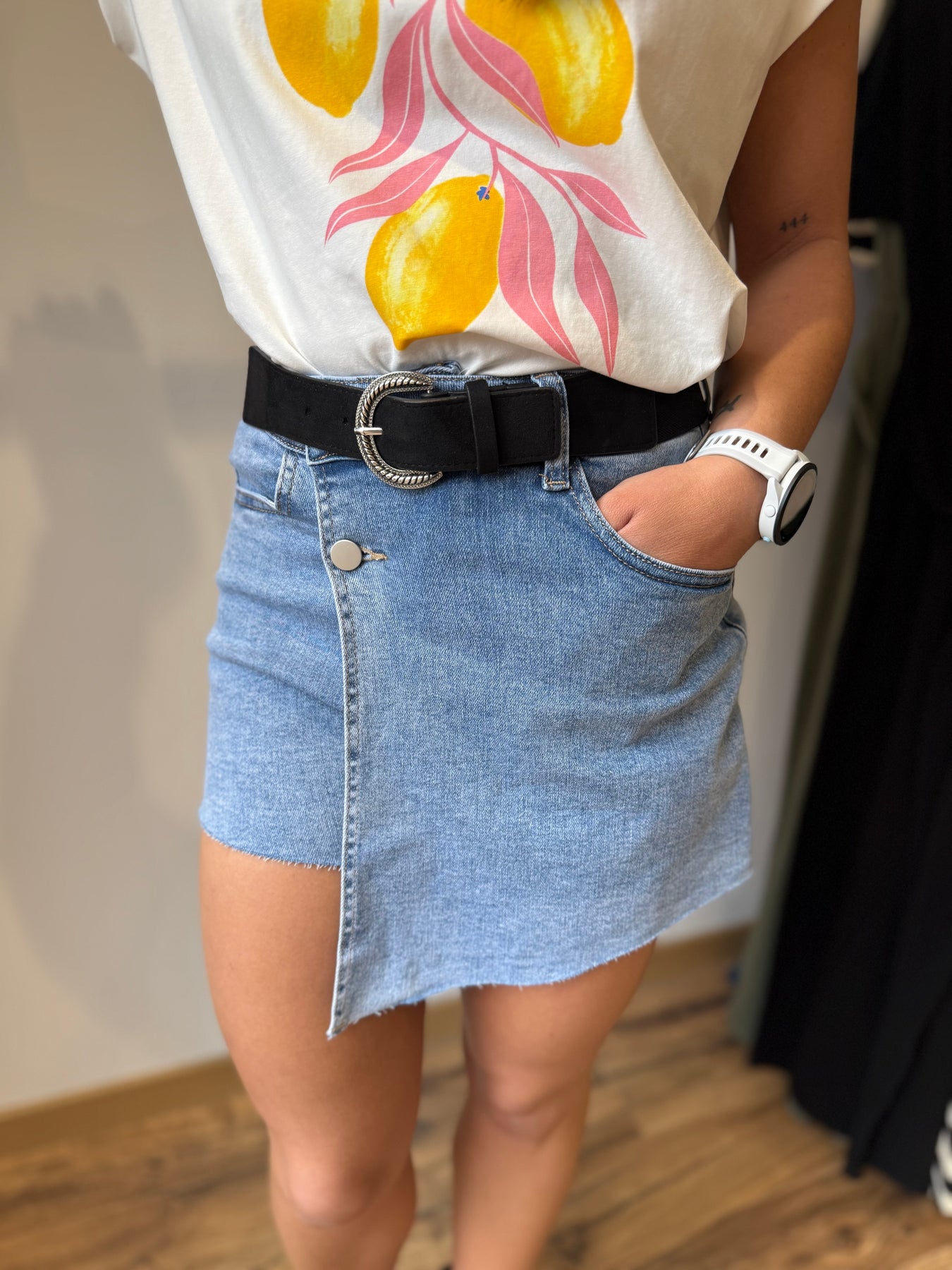 Alicia mesure 1m57 et porte la taille 34 la jupe short est associé au teeshirt Citron