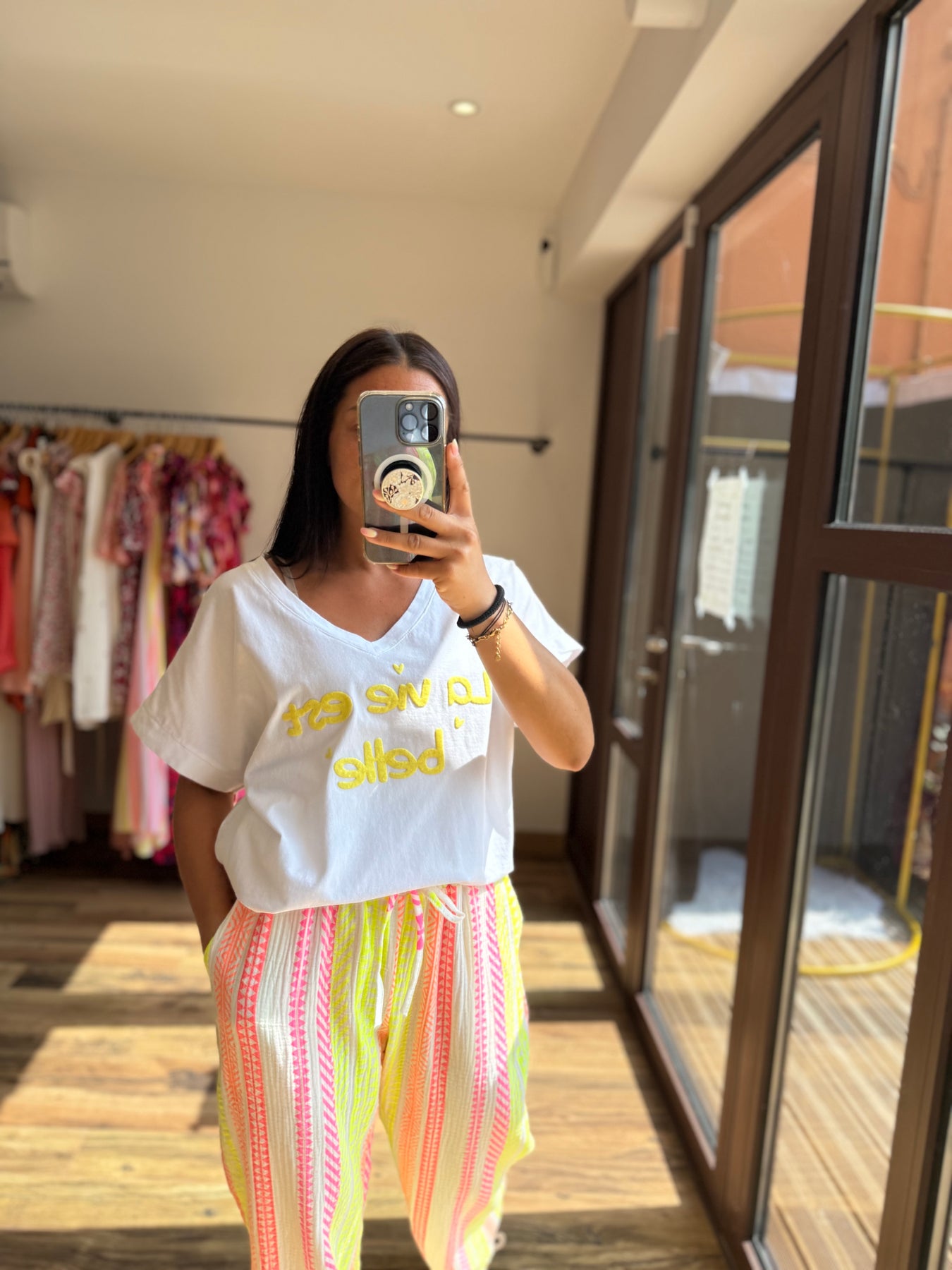 Elle le porte ici avec le tee-shirt La vie est belle jaune pour un look ensoleillé et confortable à souhait.