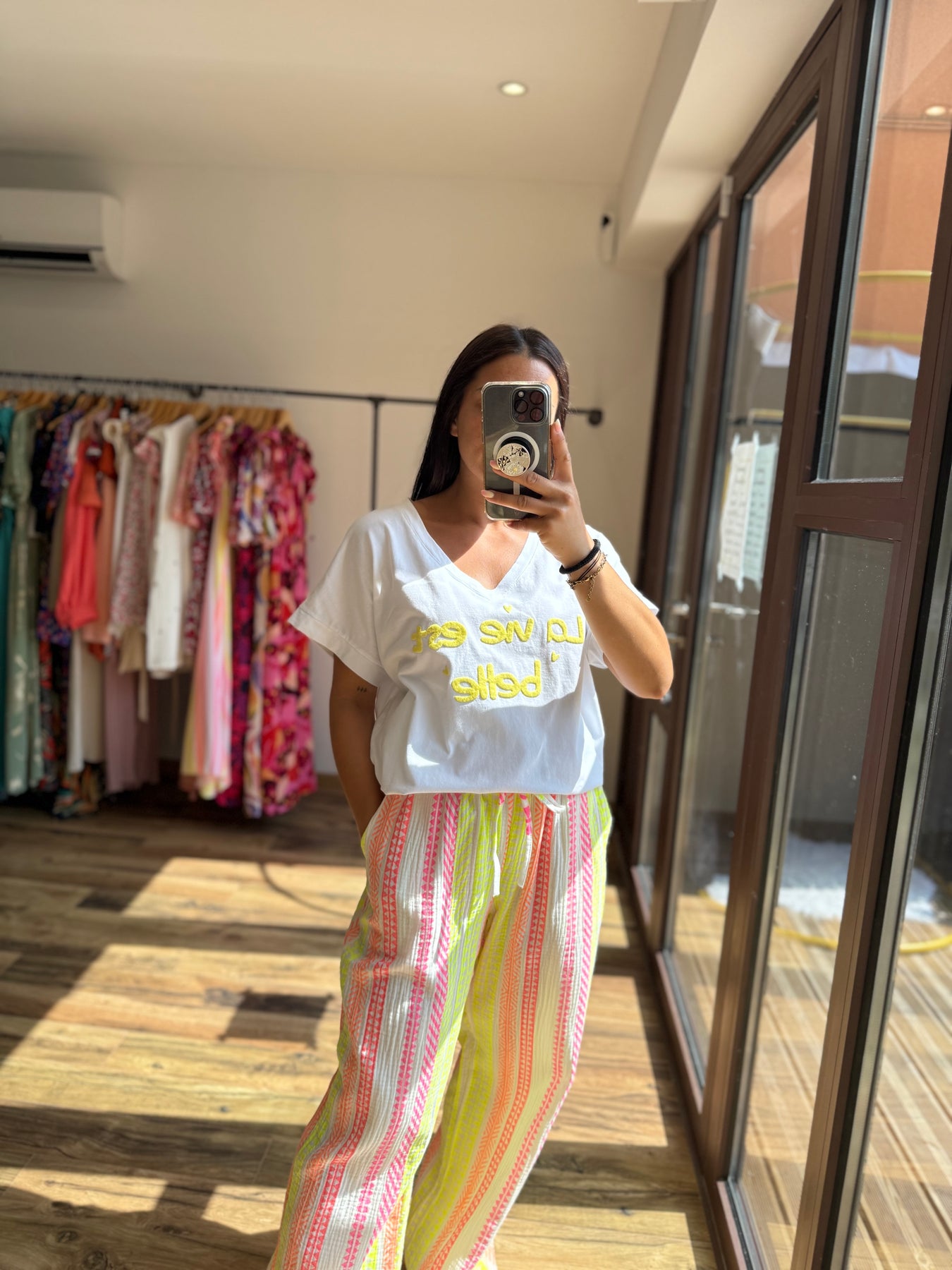 Un vrai coup de cœur pour sa légèreté et ses couleurs ultra-vitaminées ! Facile à associer avec un tee-shirt blanc ou un débardeur fluo, il est parfait pour une journée en bord de mer ou une promenade en ville. Le pantalon “Ezane”, c’est le bon mix entre confort et style sans prise de tête.
