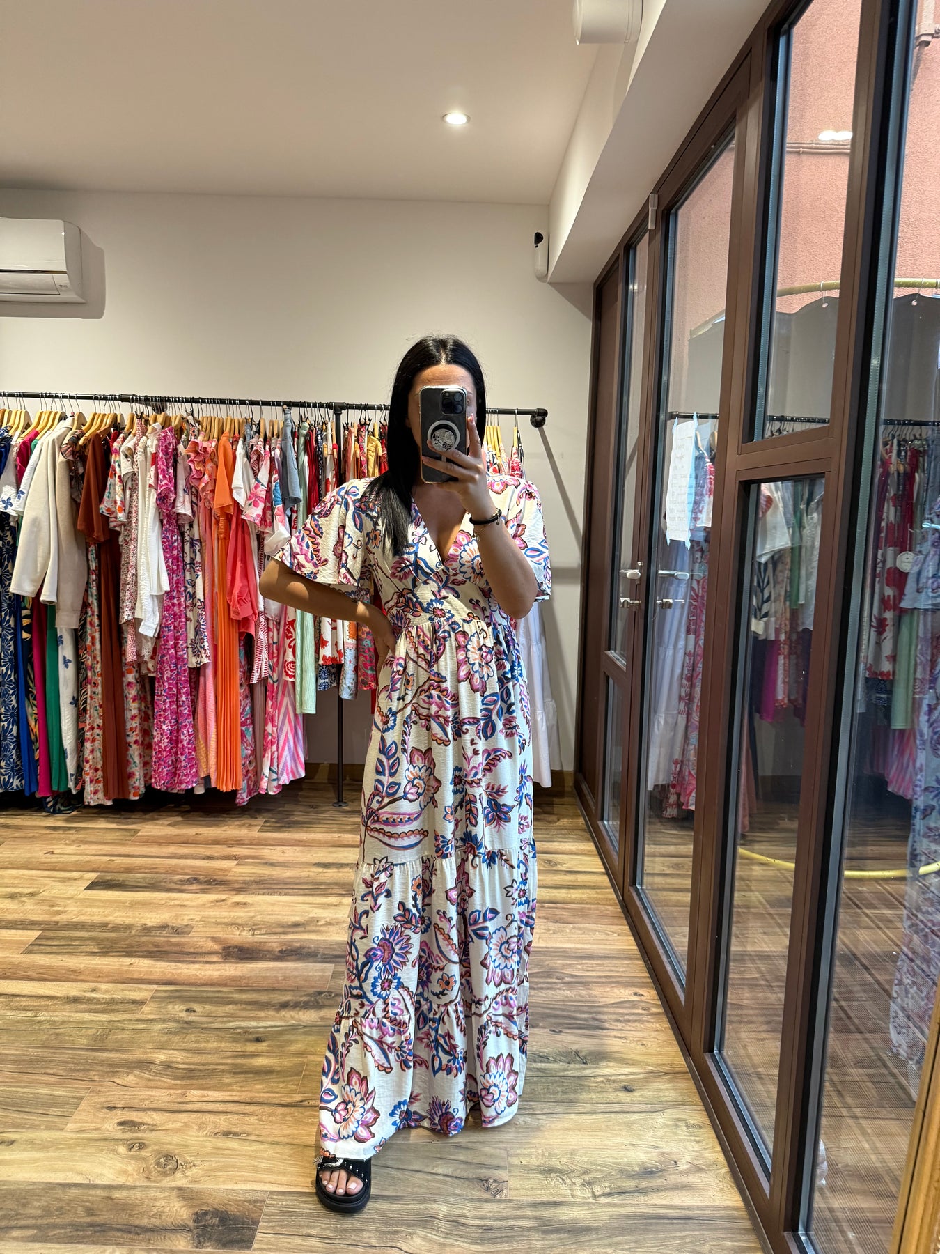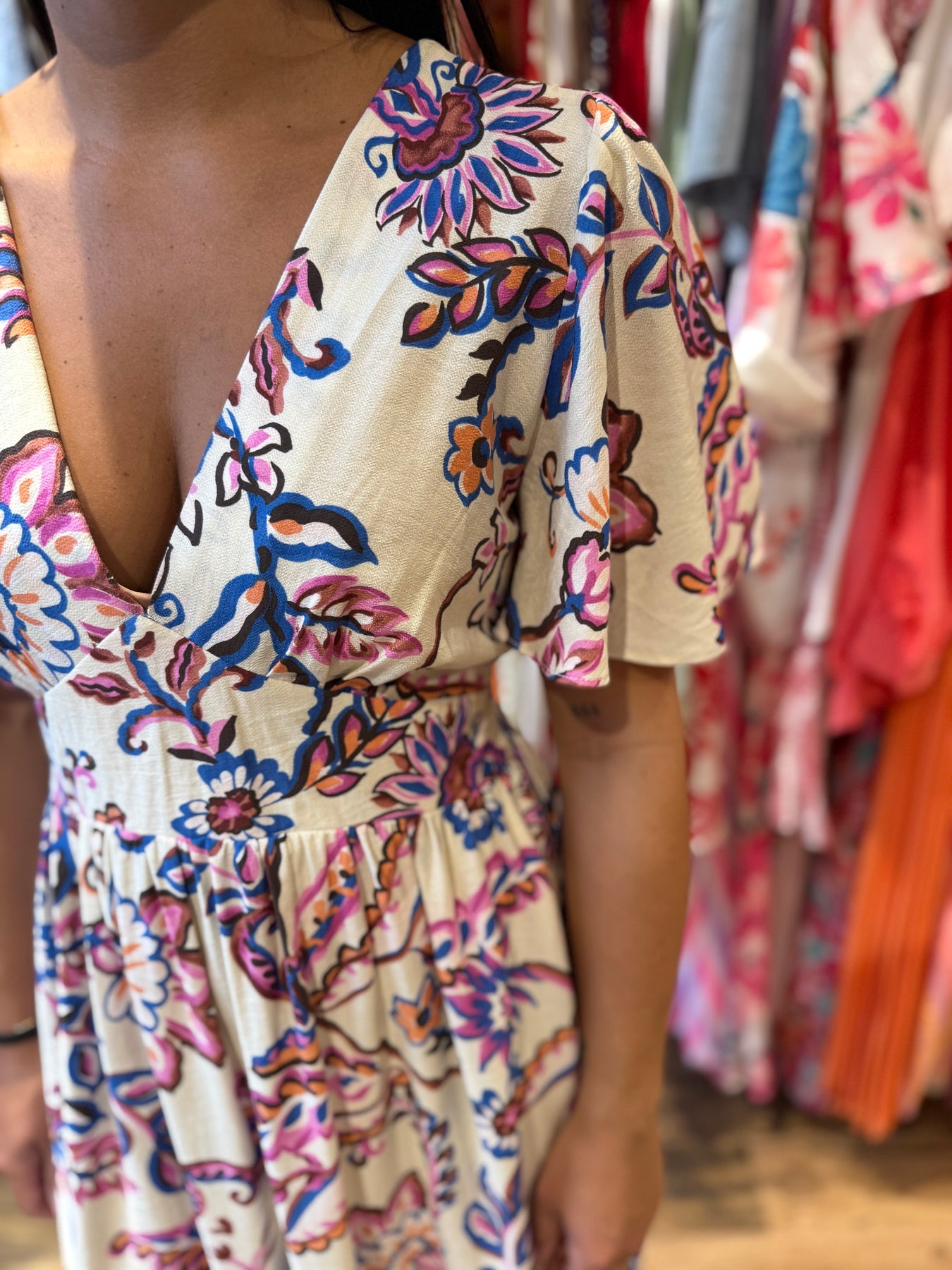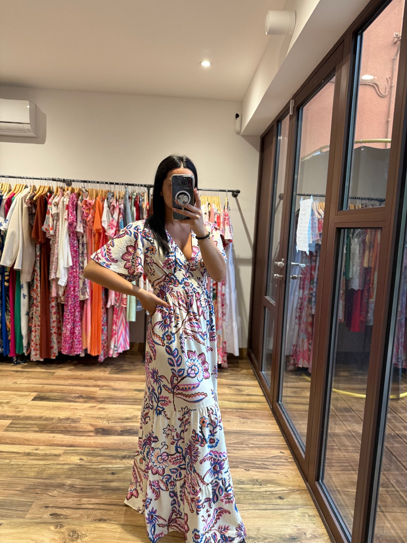 - Robe longue fluide à imprimé floral rose, violet et bleu sur fond écru