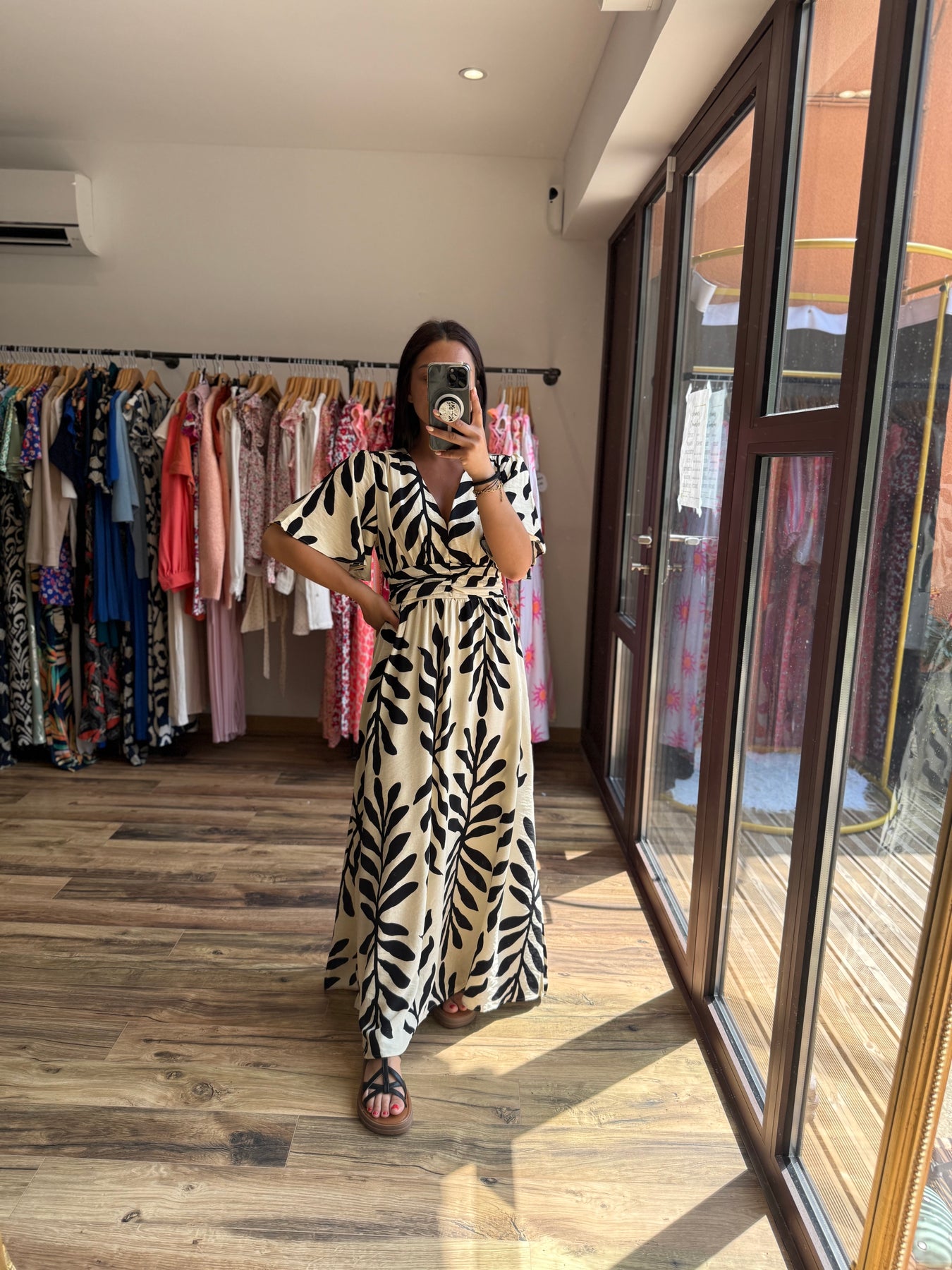 Graphique, confortable et résolument élégante, la robe “Franck” se distingue par son imprimé végétal noir sur fond beige écru et sa coupe flatteuse. Le décolleté croisé et la taille élastiquée soulignent joliment la silhouette. Parfaite pour un brunch, une balade ou même un dîner d’été. Il suffit d’y ajouter une paire de sandales et le tour est joué !