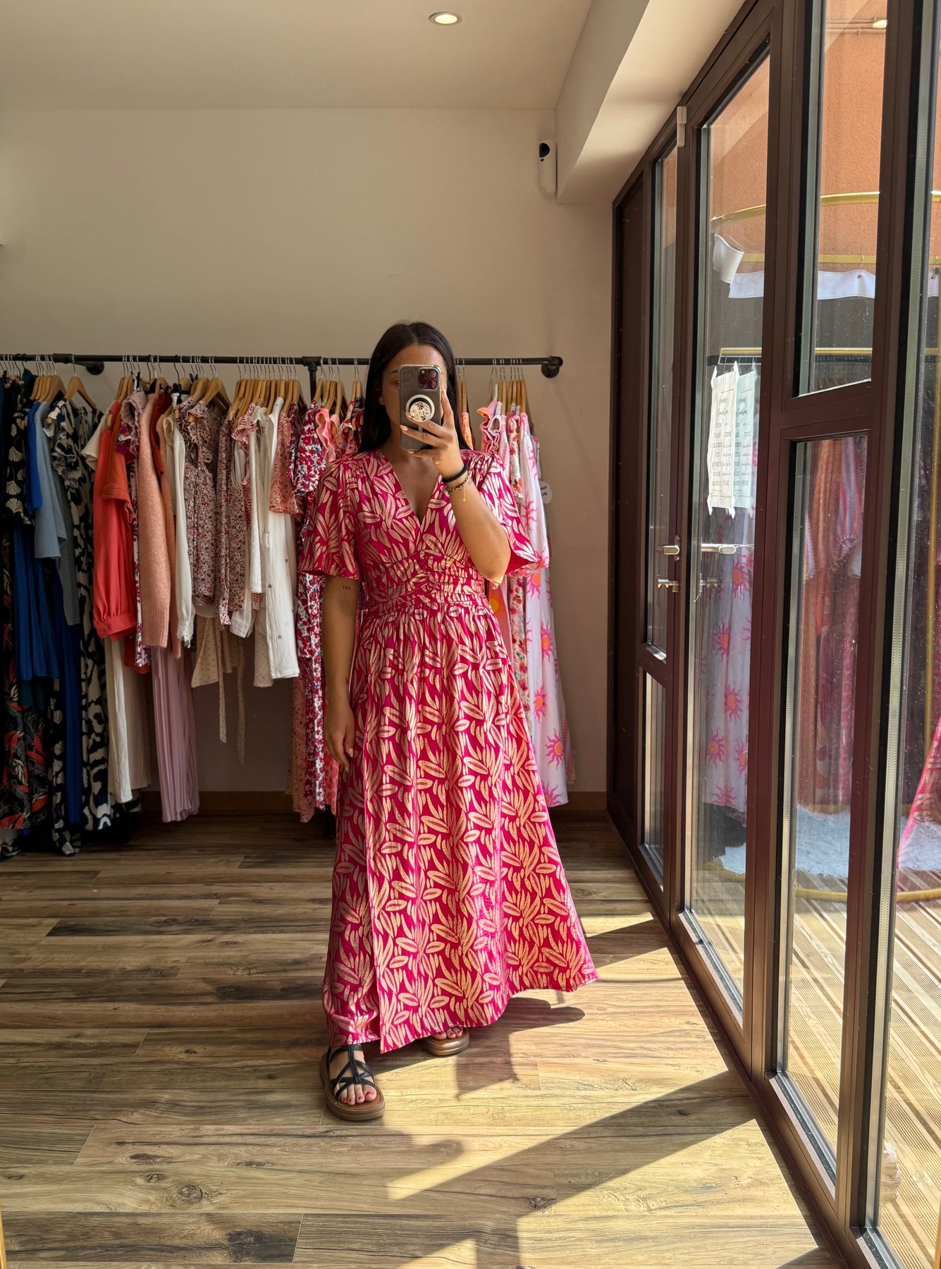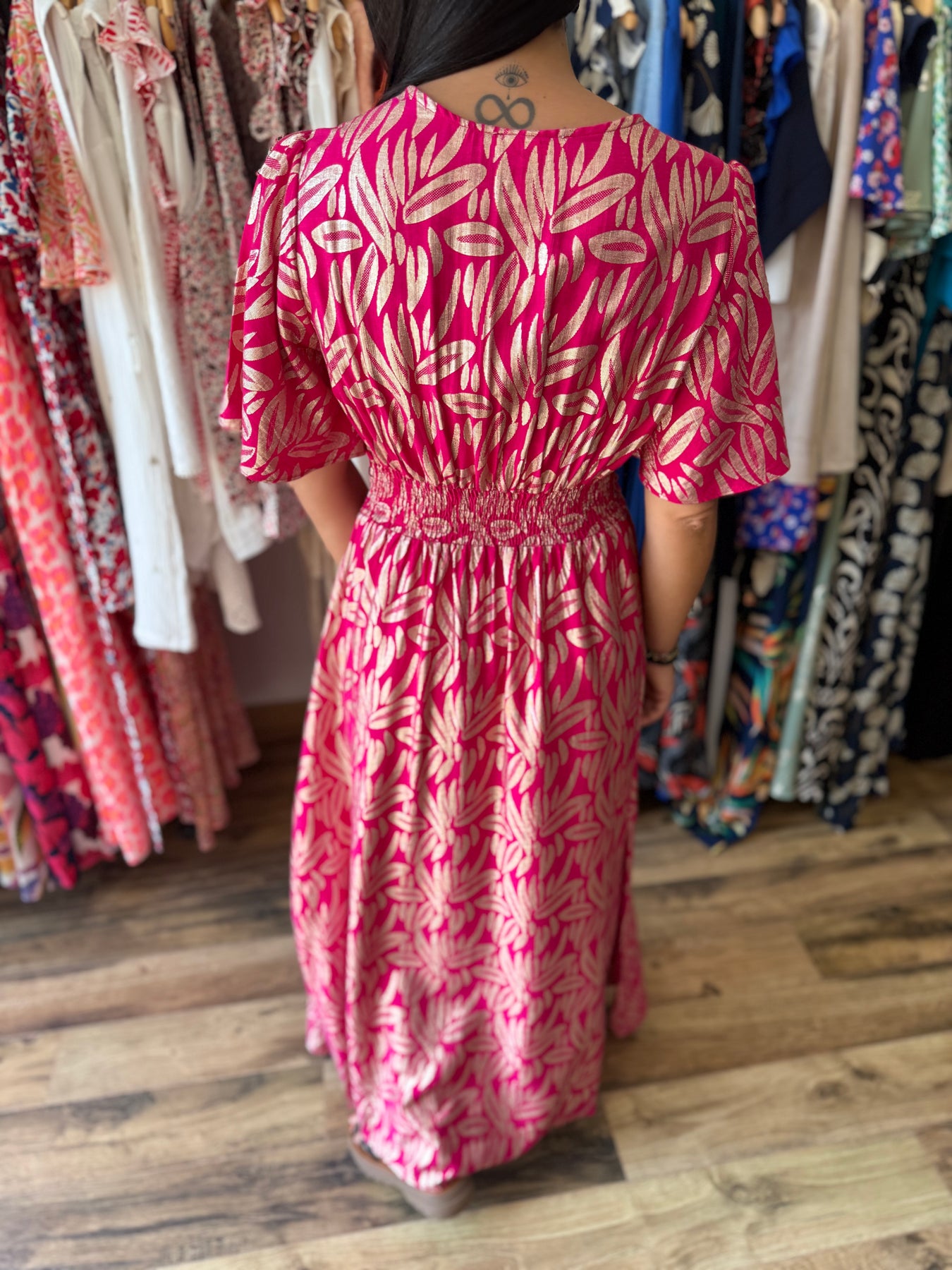 đž Robe longue âJulesâ â Fuchsia Ă©clatant et imprimĂ© dorĂ©