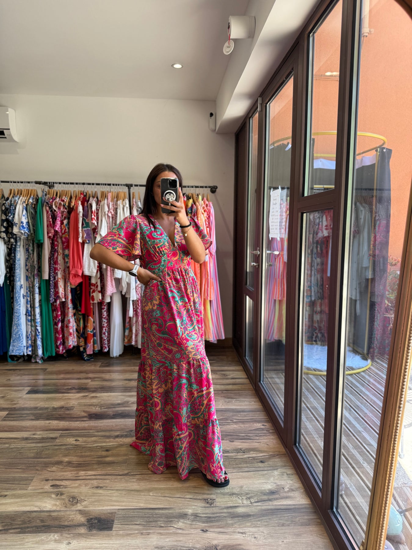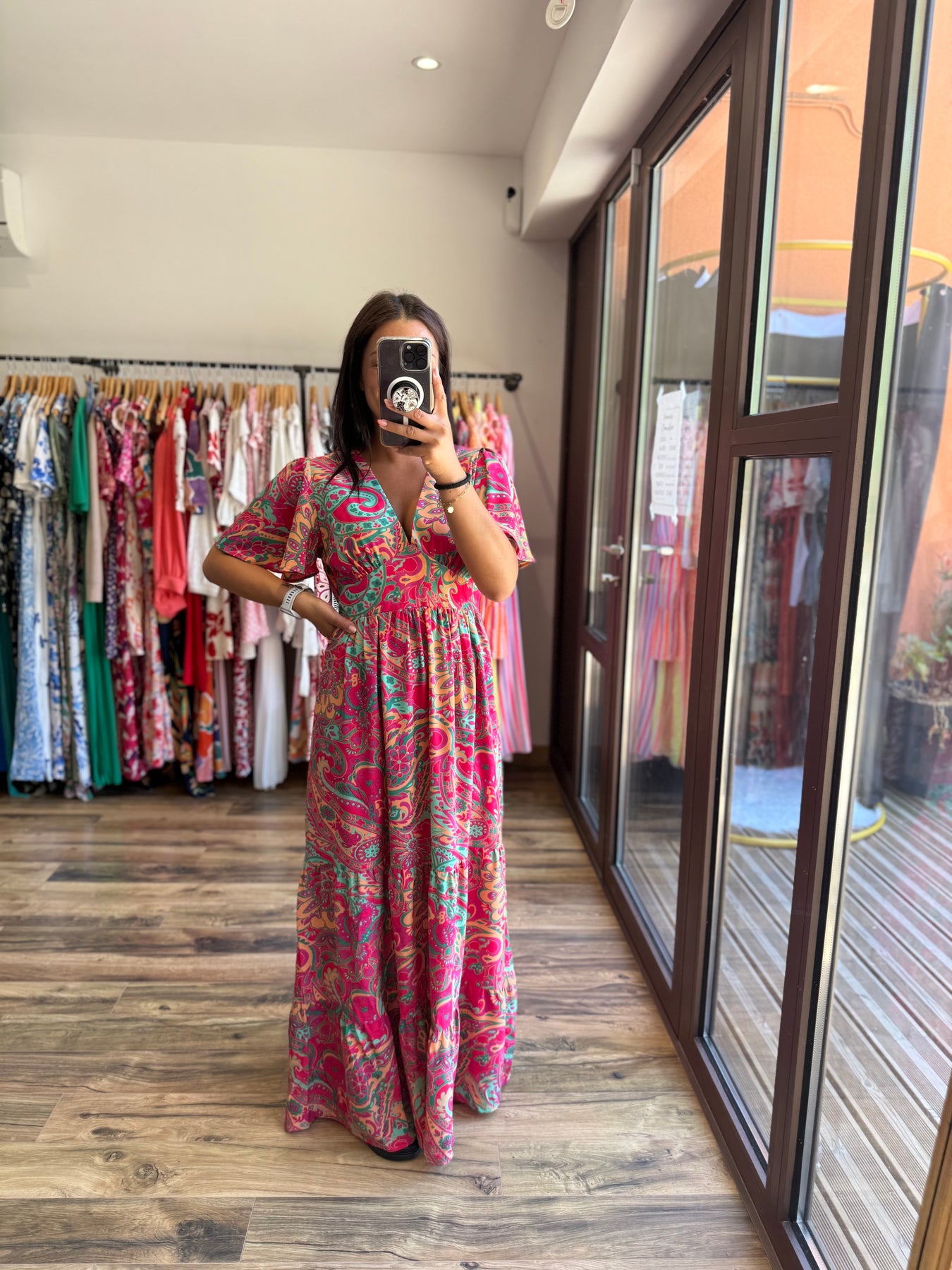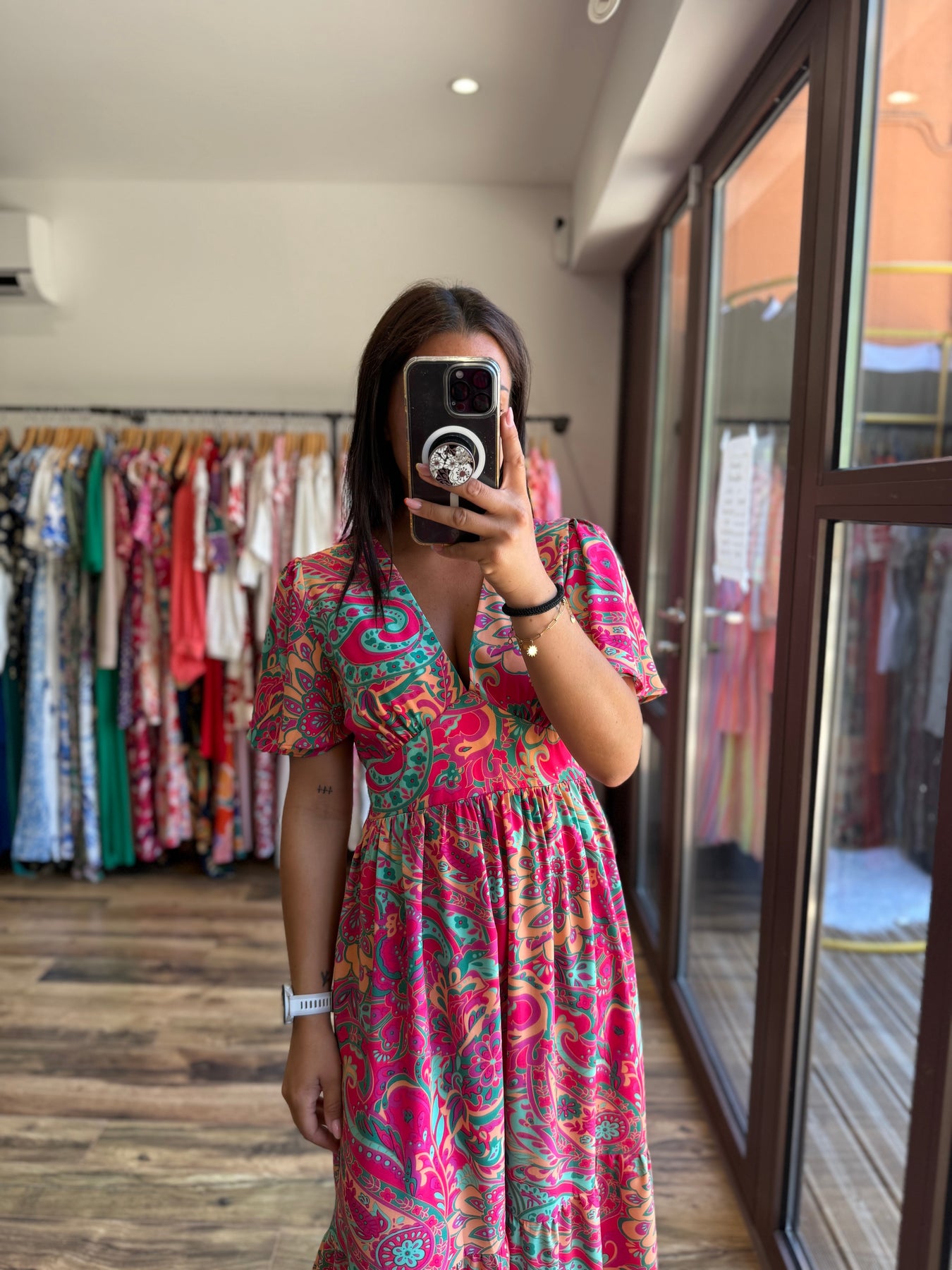 - Imprimé cachemire multicolore (fuchsia, vert, jaune, orange) sur fond rose