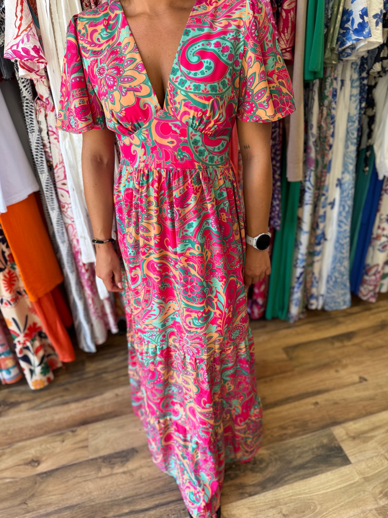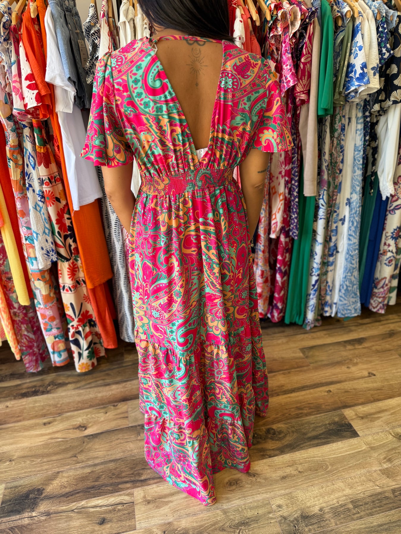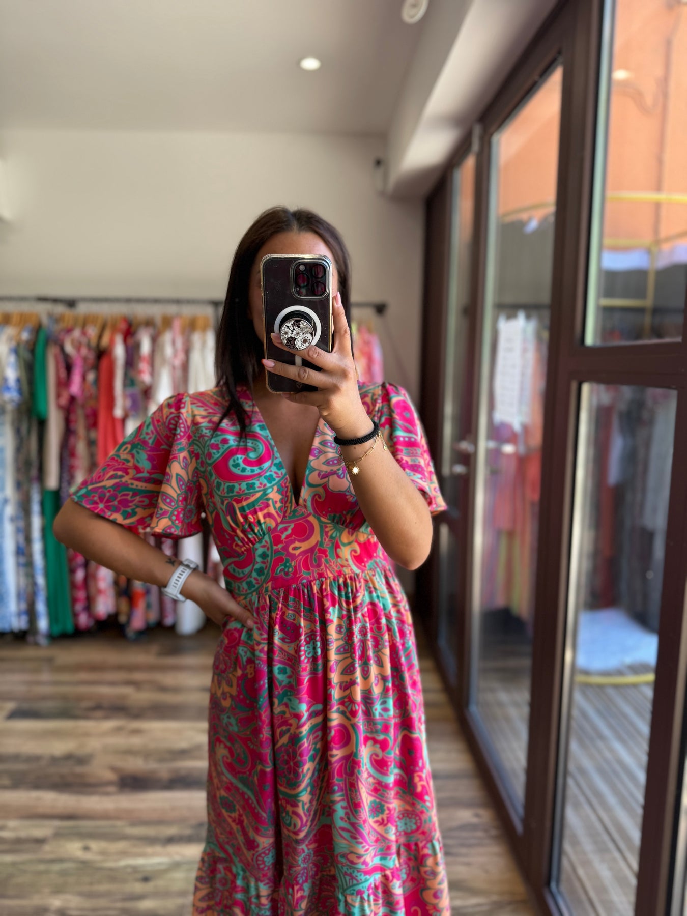 - Imprimé cachemire multicolore (fuchsia, vert, jaune, orange) sur fond rose