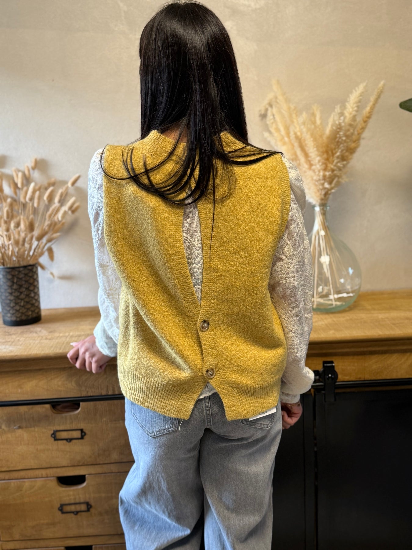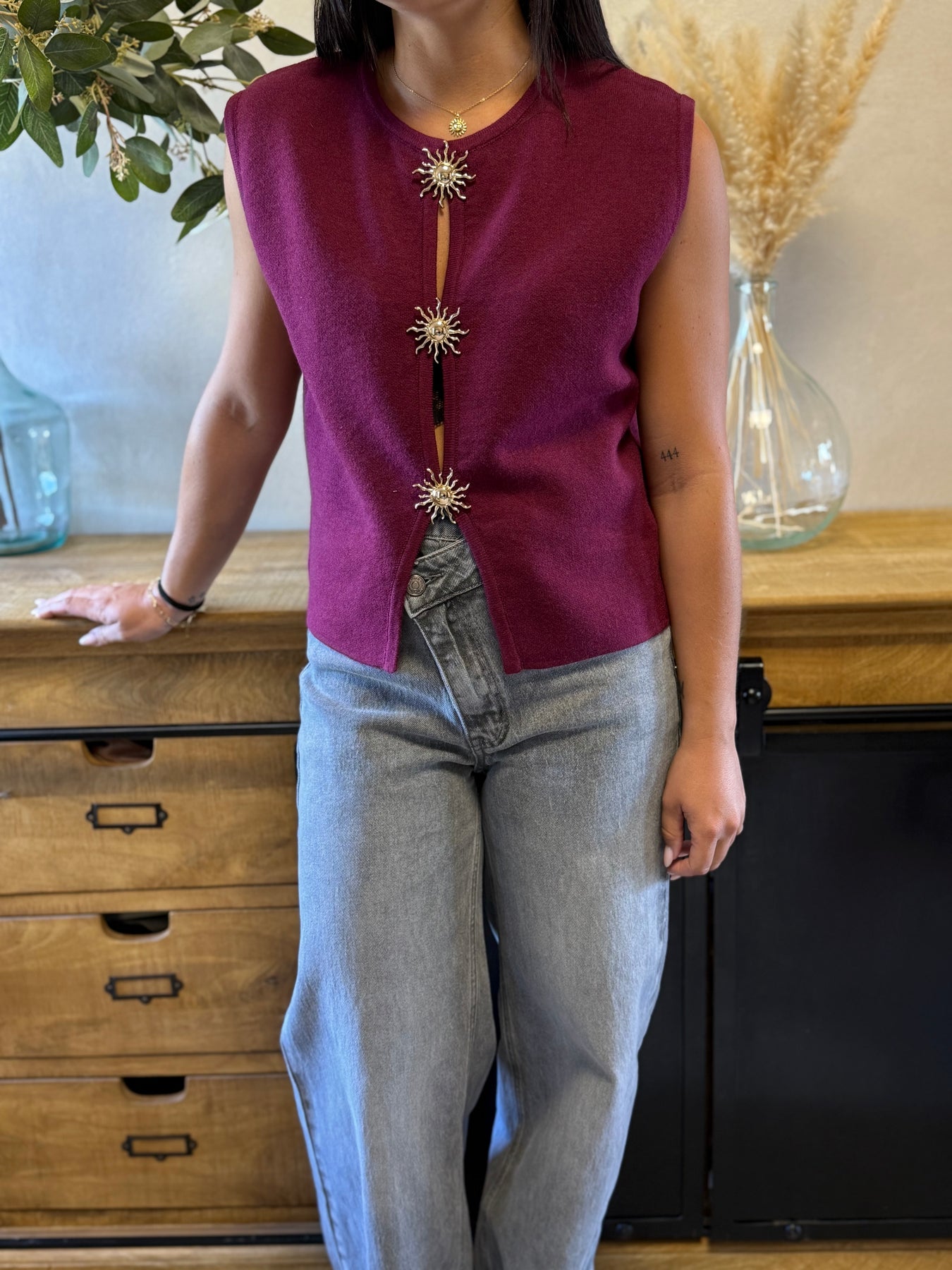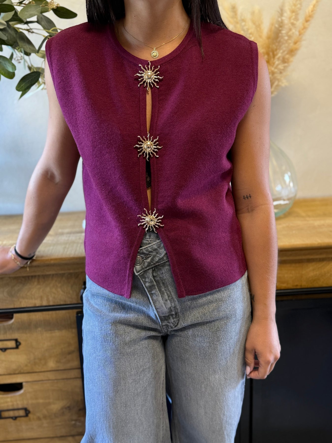 Elle le porte ici avec le gilet Sun prune pour un look tendance et lumineux.
