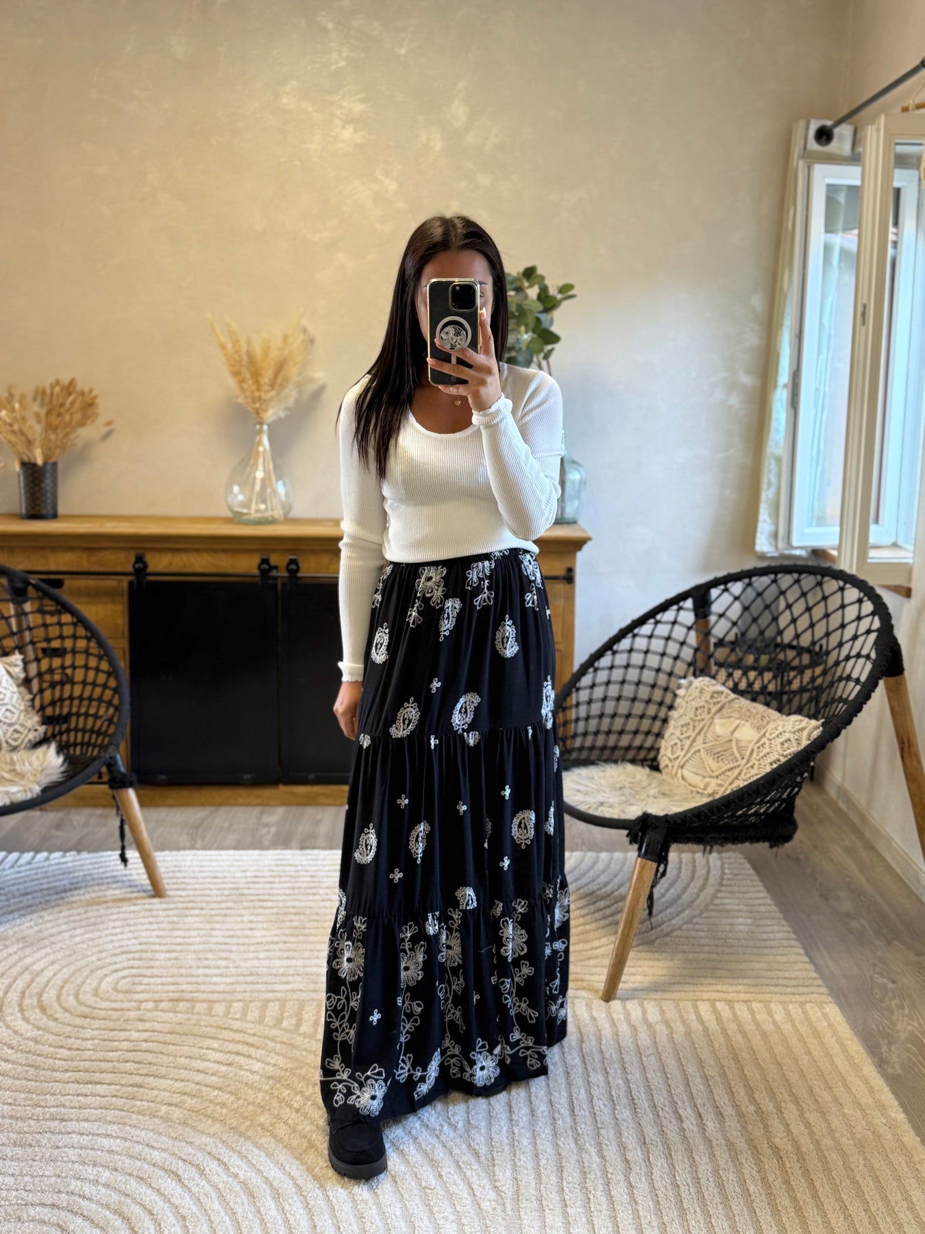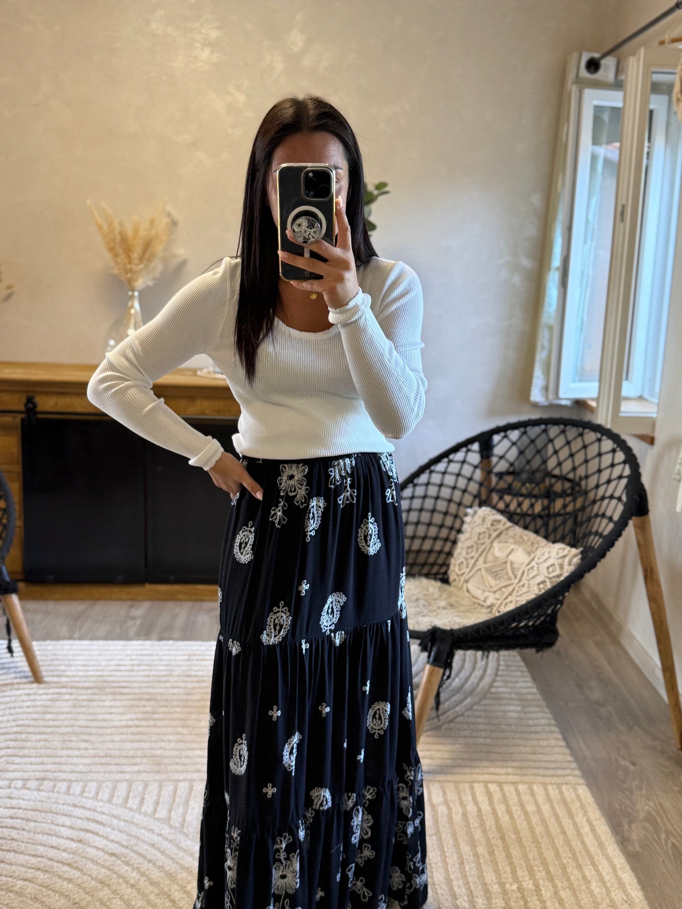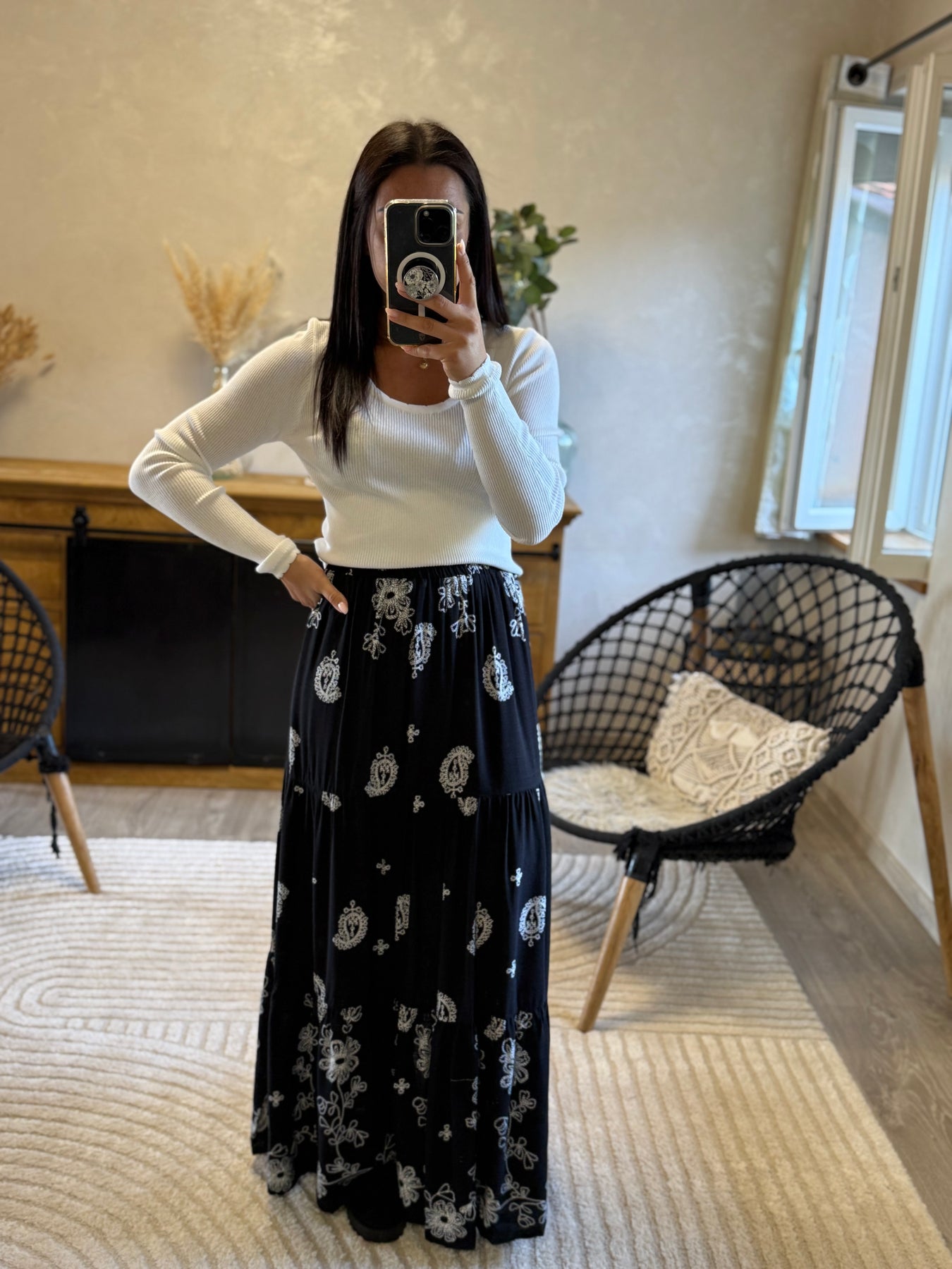 La jupe Fenty est un vrai coup de cœur avec son allure bohème et ses broderies raffinées 🤍. Légère et fluide, elle accompagne tous vos mouvements avec élégance. On l’adore portée avec un pull fin Simmah comme sur le look présenté, mais elle sera tout aussi canon avec un crop top ou une blouse romantique pour les beaux jours 🌿.