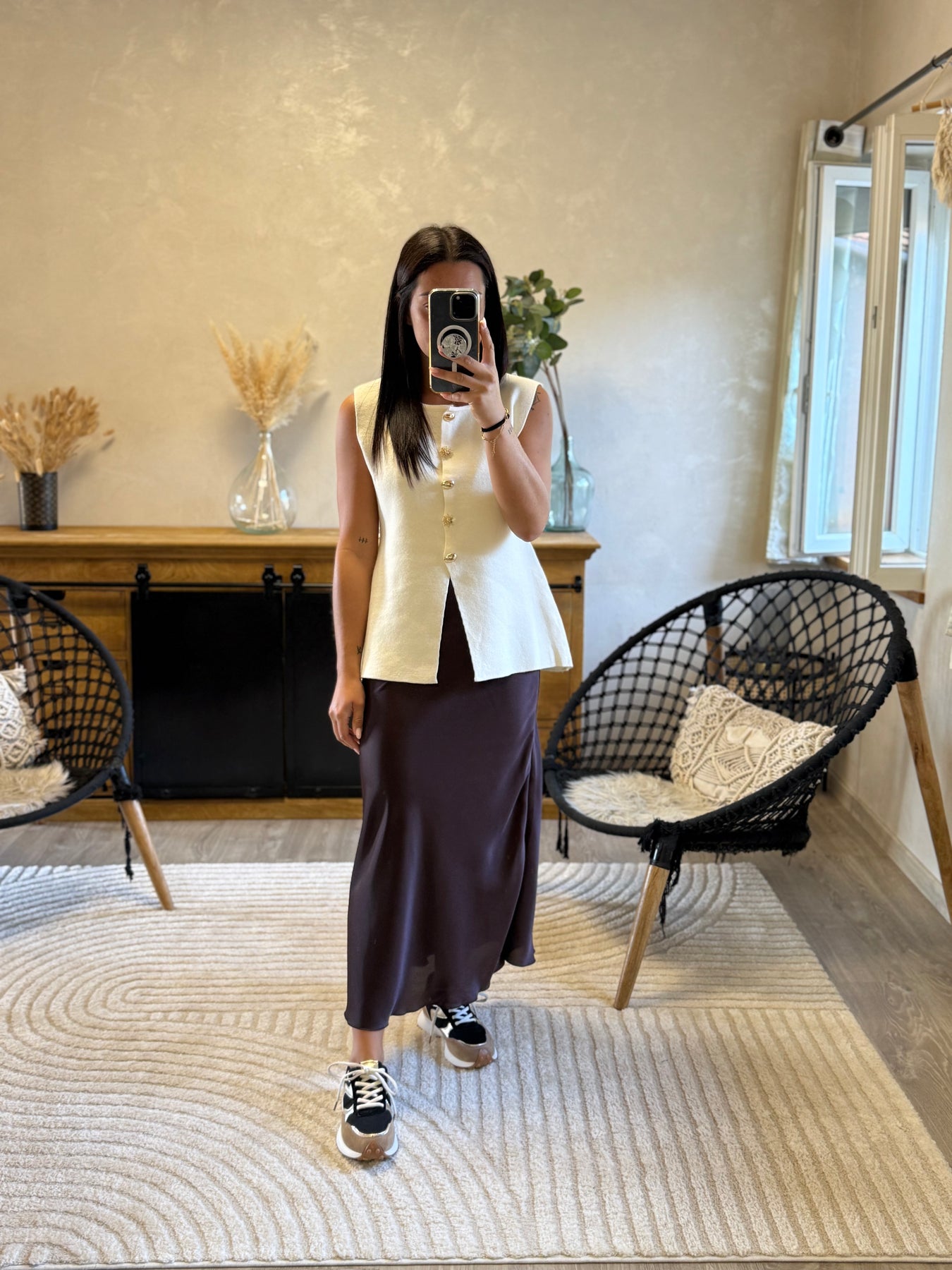 Le Sady est un pull sans manches à la fois moderne et raffiné 🌟. Ses boutons dorés lui donnent une allure sophistiquée, tandis que sa coupe fluide reste très confortable. On l’adore porté avec la jupe satin chocolat pour un look chic et tendance, mais il se mariera aussi parfaitement avec un jean taille haute ou un pantalon fluide pour un style plus casual chic 🌿.
