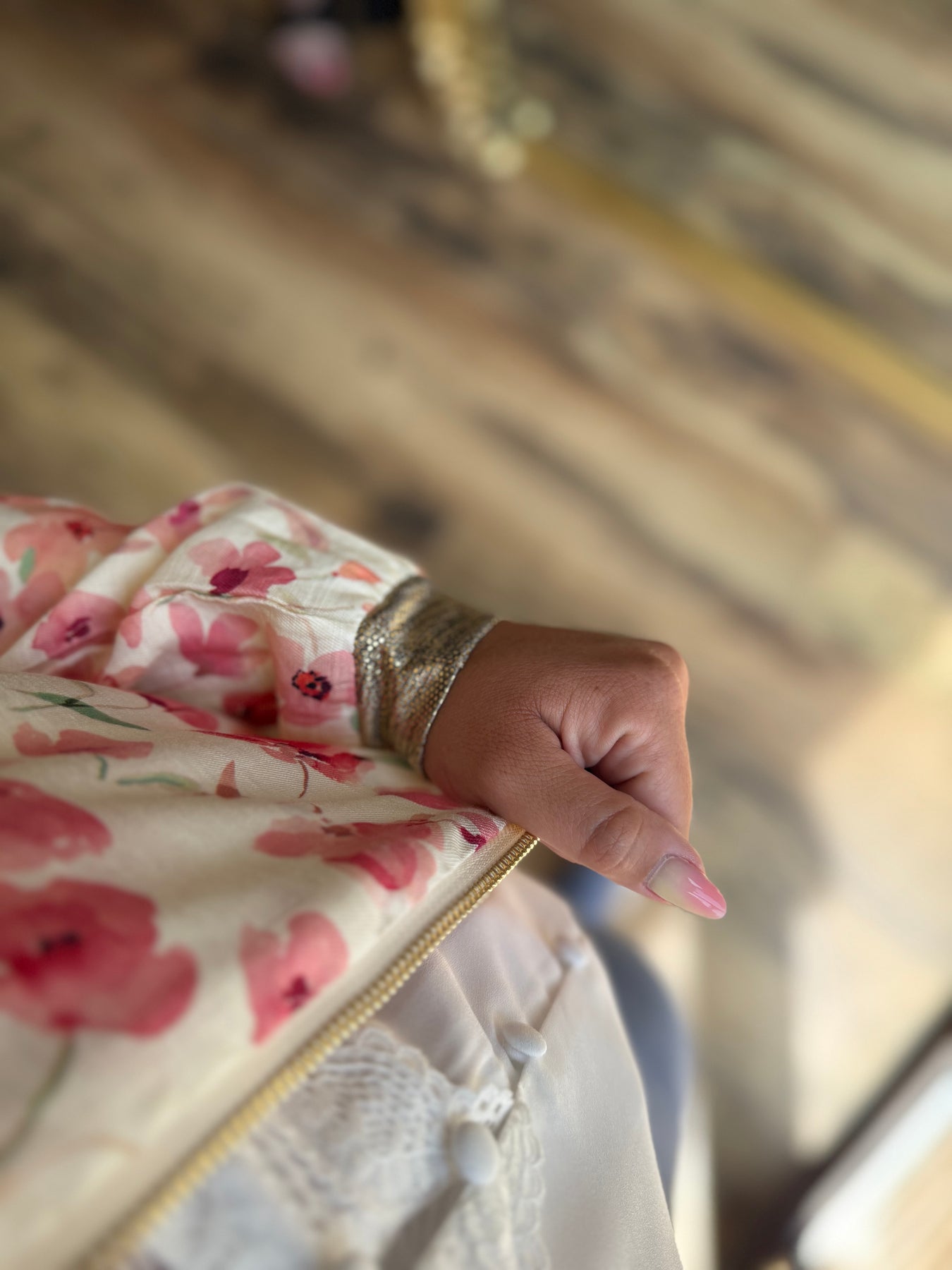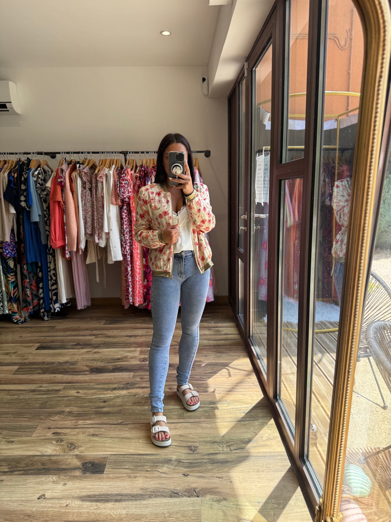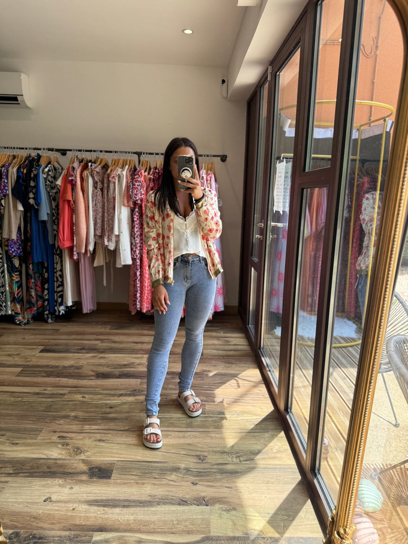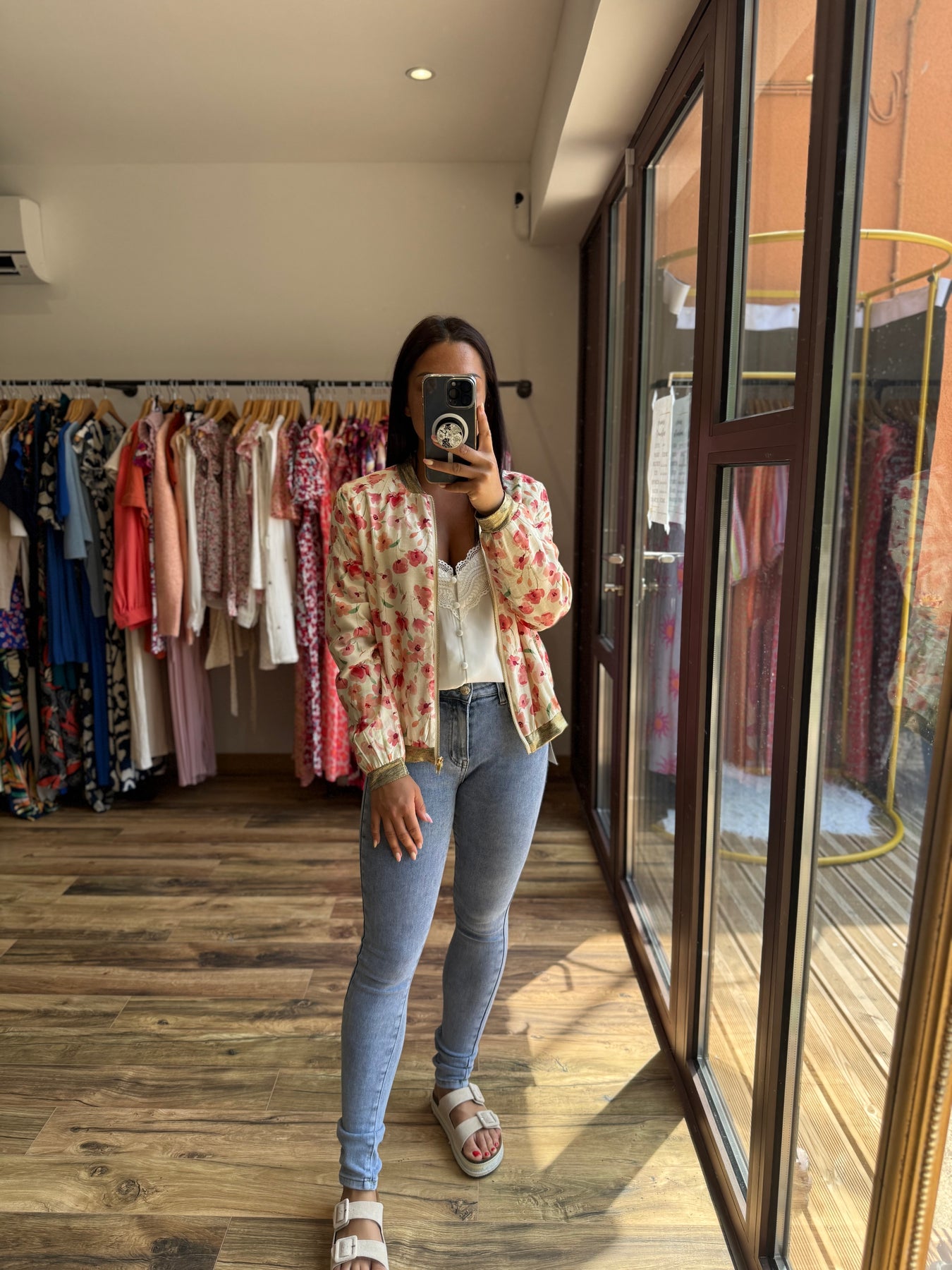 Le bombers “Moli” réinvente le blouson léger avec un imprimé fleuri plein de fraîcheur. Il réveille n’importe quelle tenue basique : à porter sur une robe unie, un débardeur en dentelle ou un jean comme Alicia pour un look printanier chic. Les détails dorés apportent une touche féminine et élégante.
