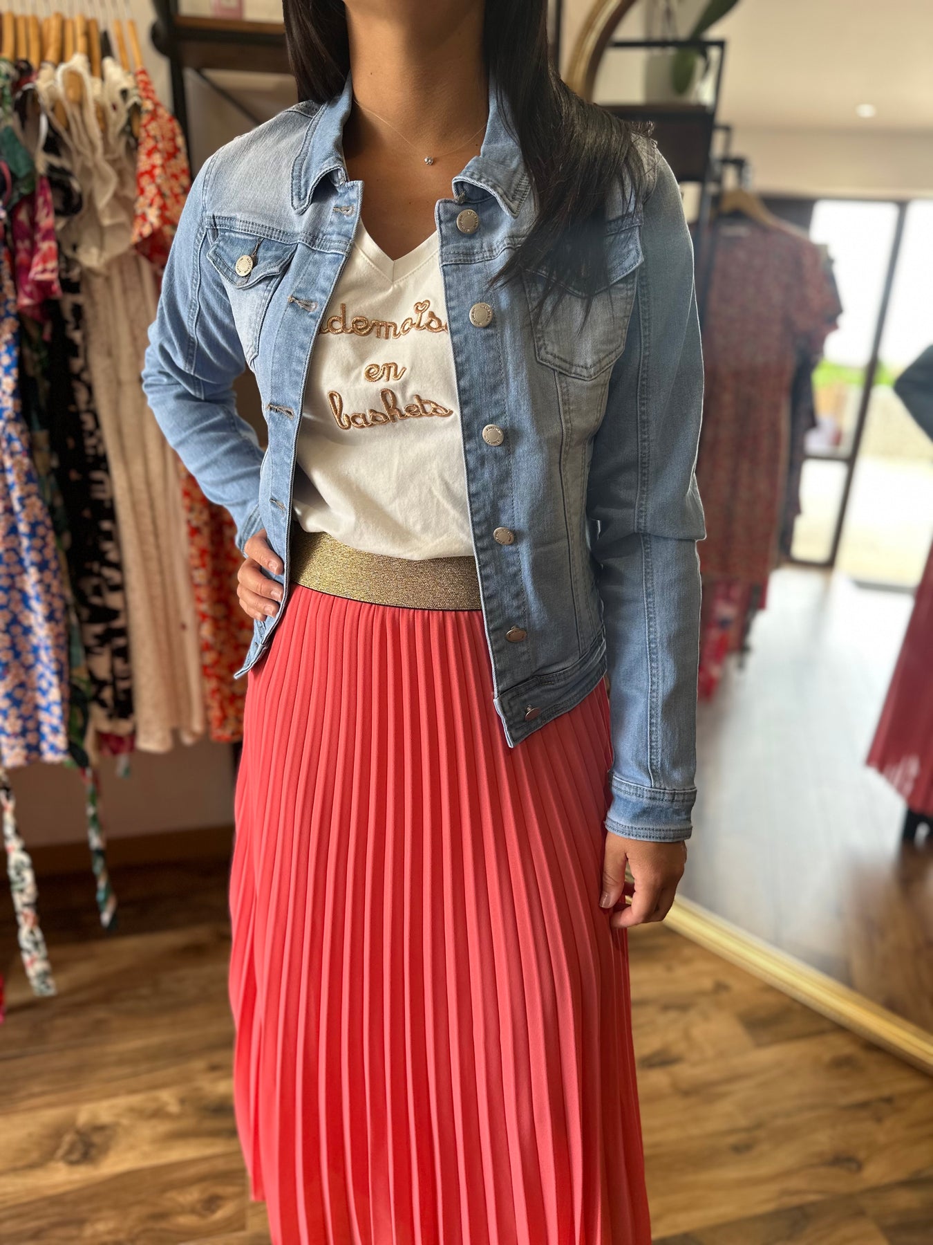 Alicia mesure 1m57 et met du 36 elle porte la jupe longue corail et le teeshirt mademoiselle en baskets doré