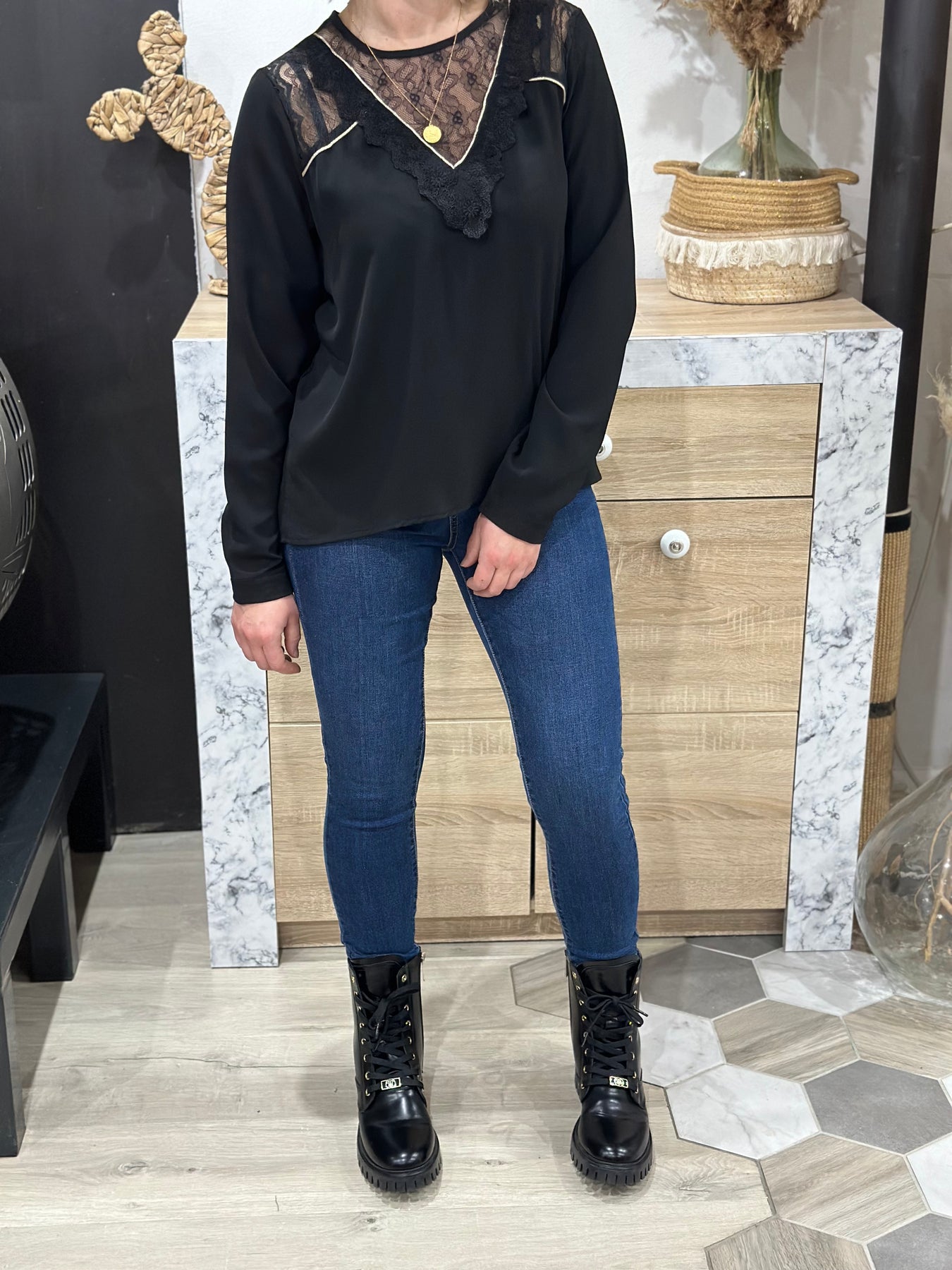 Elise mesure 1m62 et met du 36 elle porte la blouse avec le jean Crystal