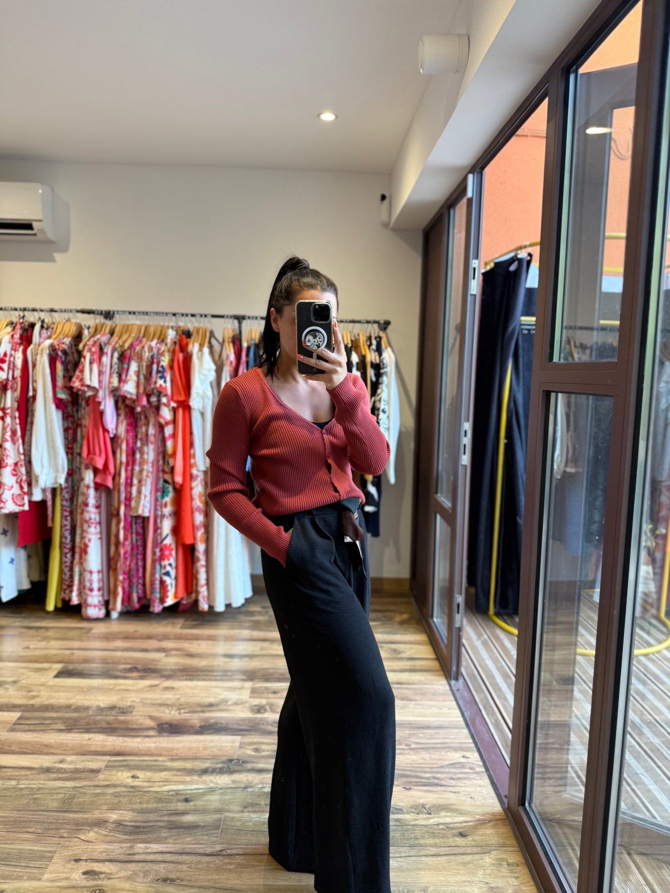 Un gilet tout doux et féminin, qui se porte aussi bien comme un petit pull boutonné que comme une maille légère ouverte sur un top ✨. Son coloris terracotta apporte de la chaleur et s’associe à merveille avec des tons automnaux comme le noir, le beige ou le camel. Un indispensable cosy-chic de la saison 🍂.