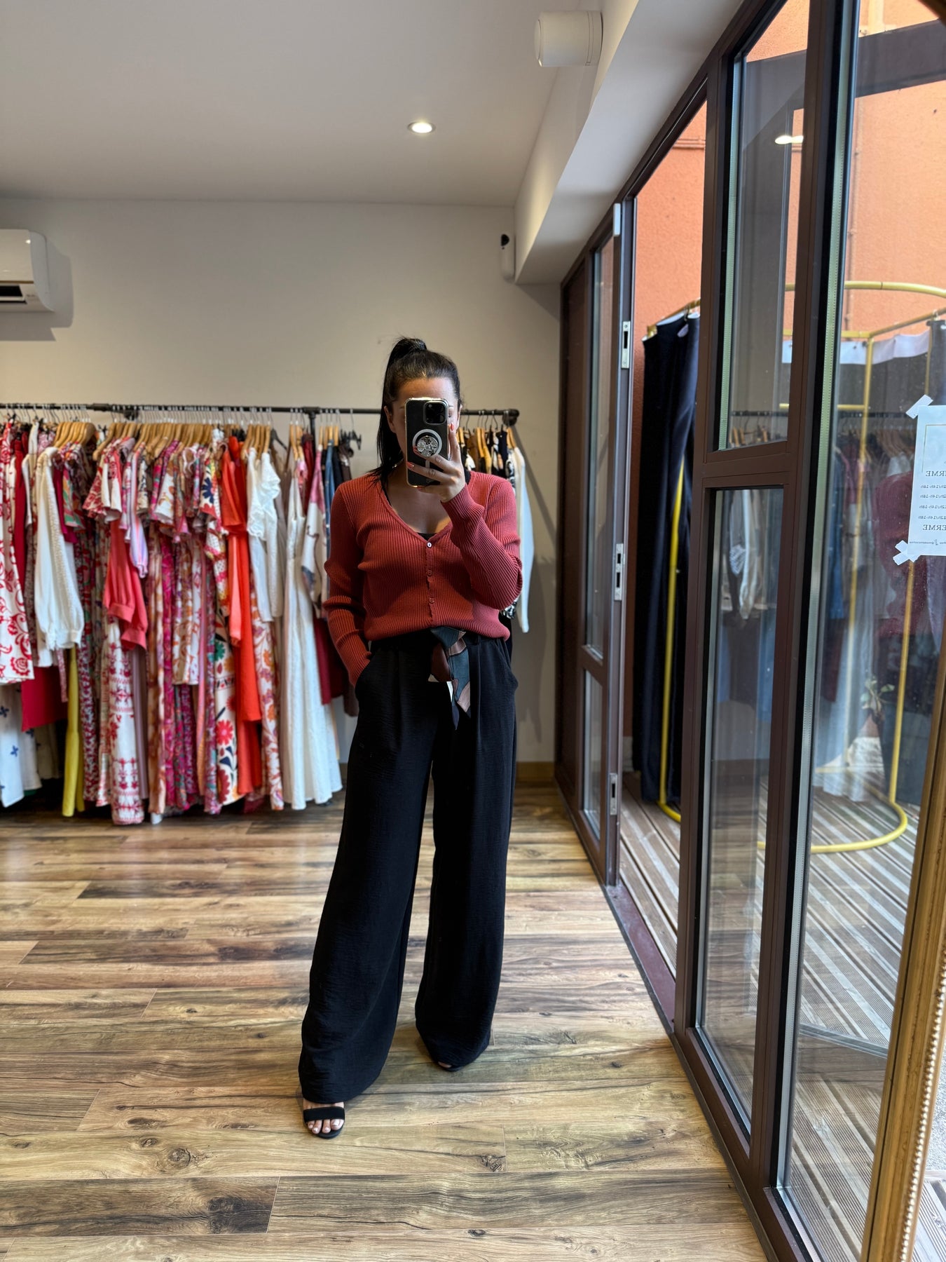 Alicia (1m57, taille 36) porte le gilet “Nona” terracotta avec le pantalon “Eliam” noir – collection automne.