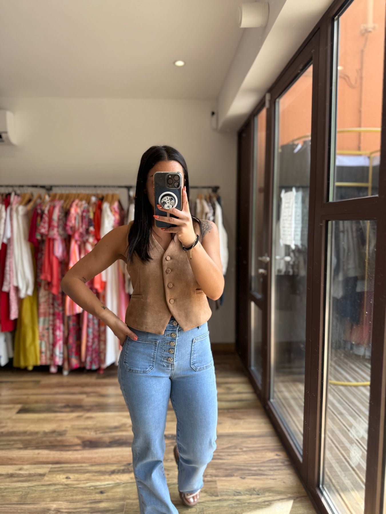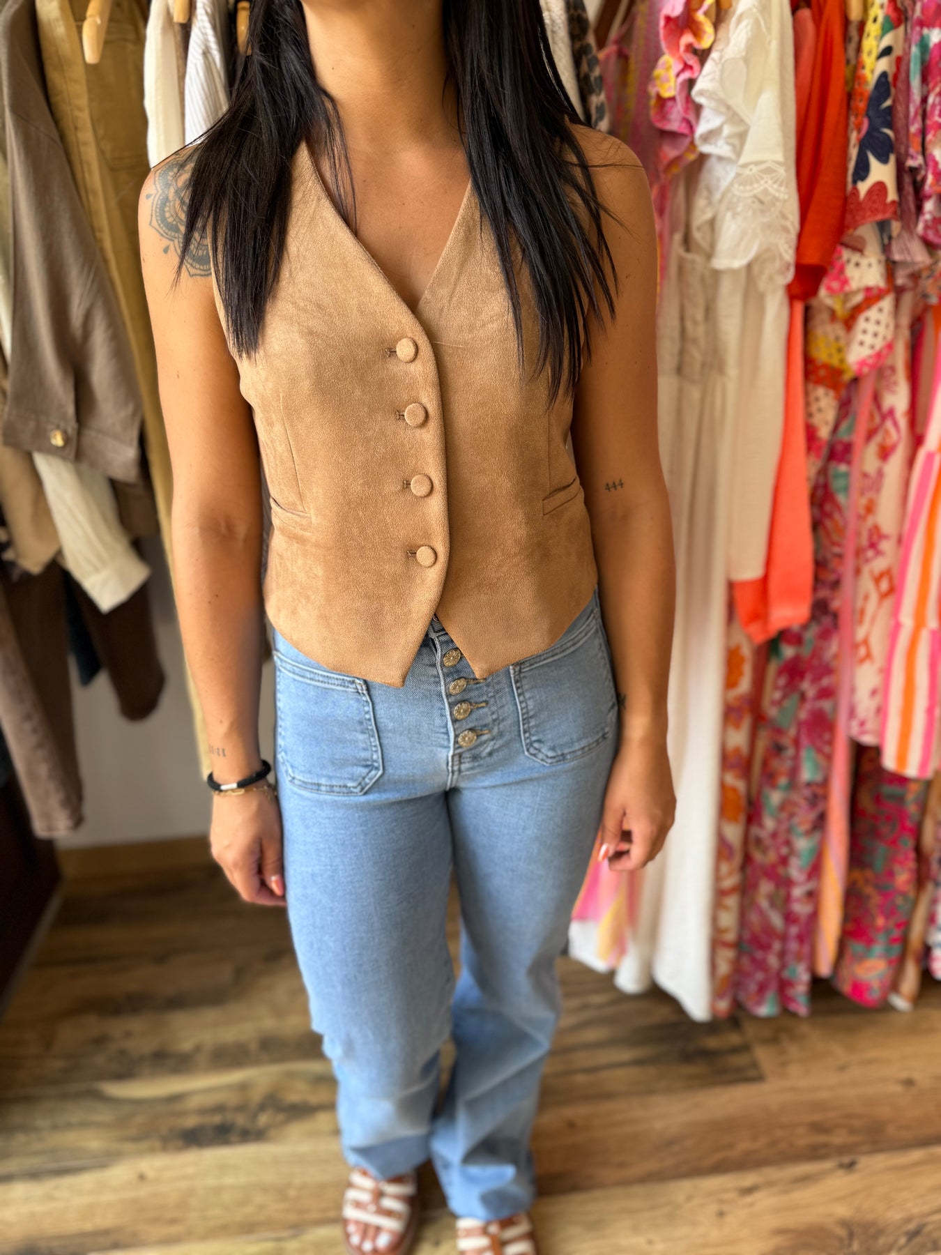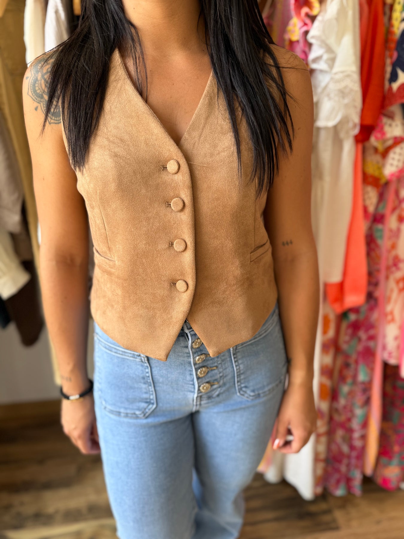 Un gilet à l’esprit rétro qui revient en force cette saison ✨. À porter seul pour un style affirmé ou superposé sur une chemise blanche pour une allure élégante. Sa matière suédine et sa coupe ajustée mettent en valeur la silhouette tout en restant confortables.