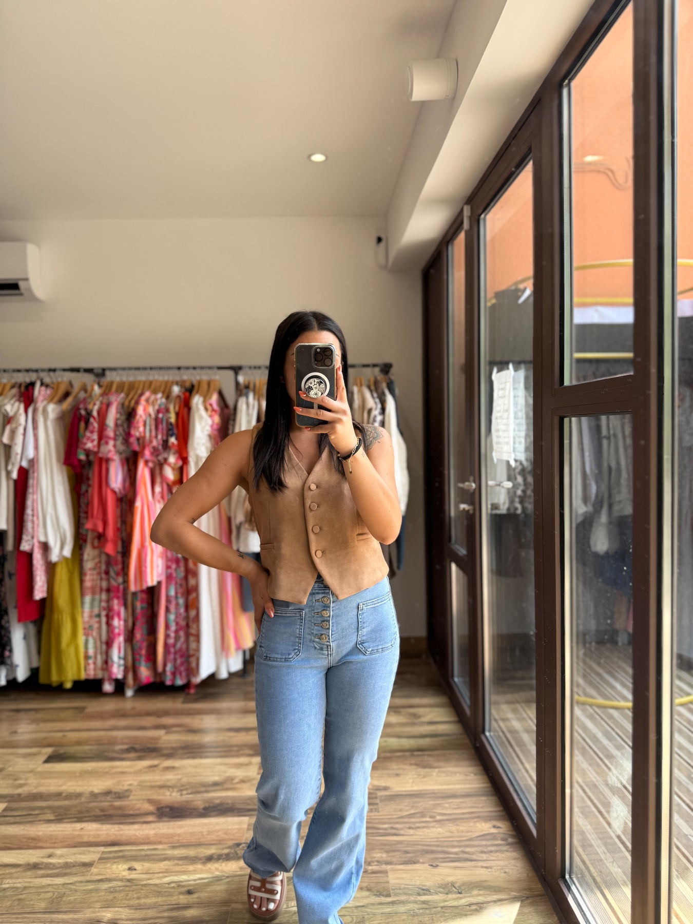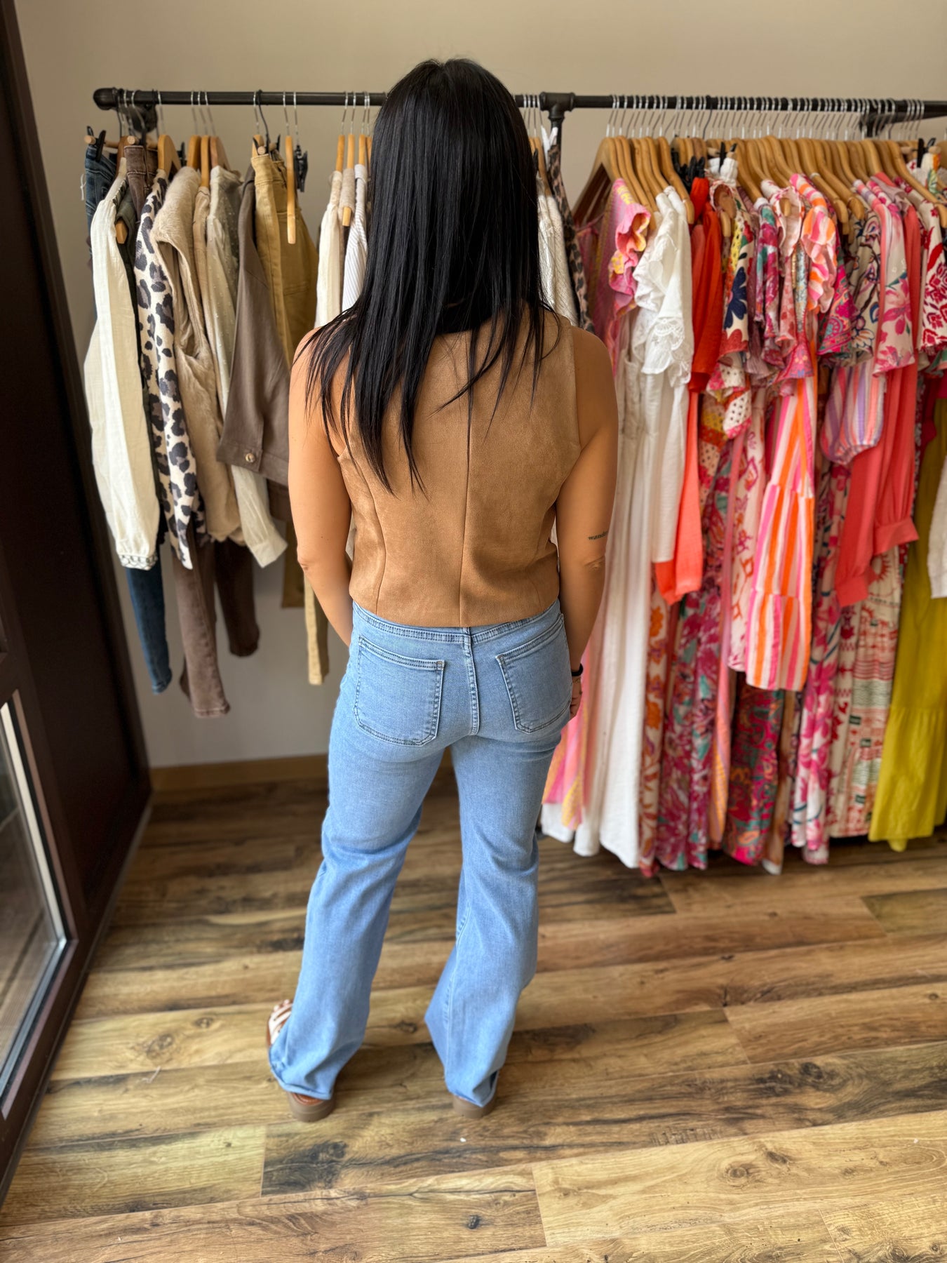 Alicia (1m57, taille 36) porte le gilet sans manches suédine avec un jean bleu flare.