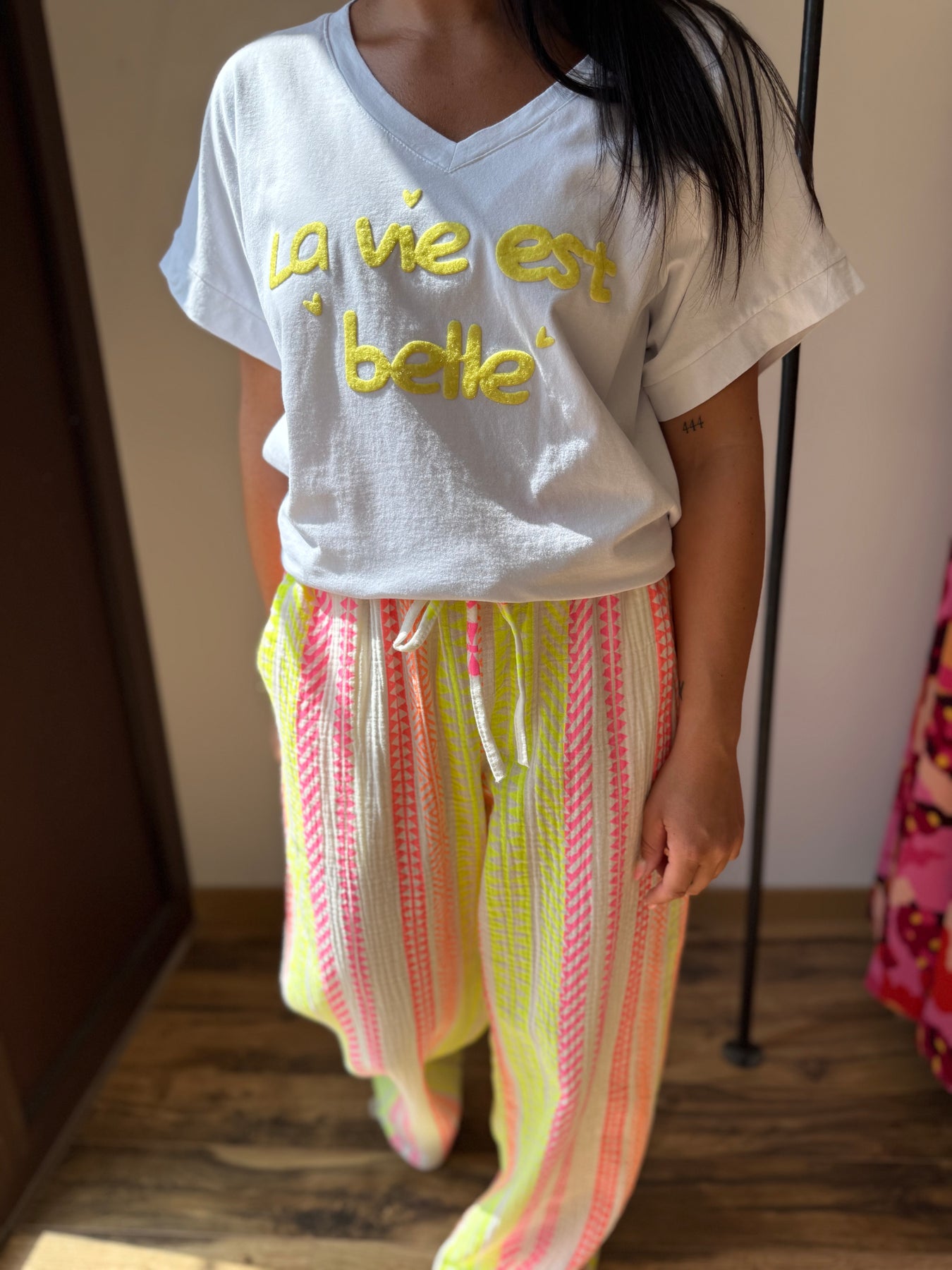 Tee-shirt “La vie est belle” – Bonne humeur brodée en jaune soleil