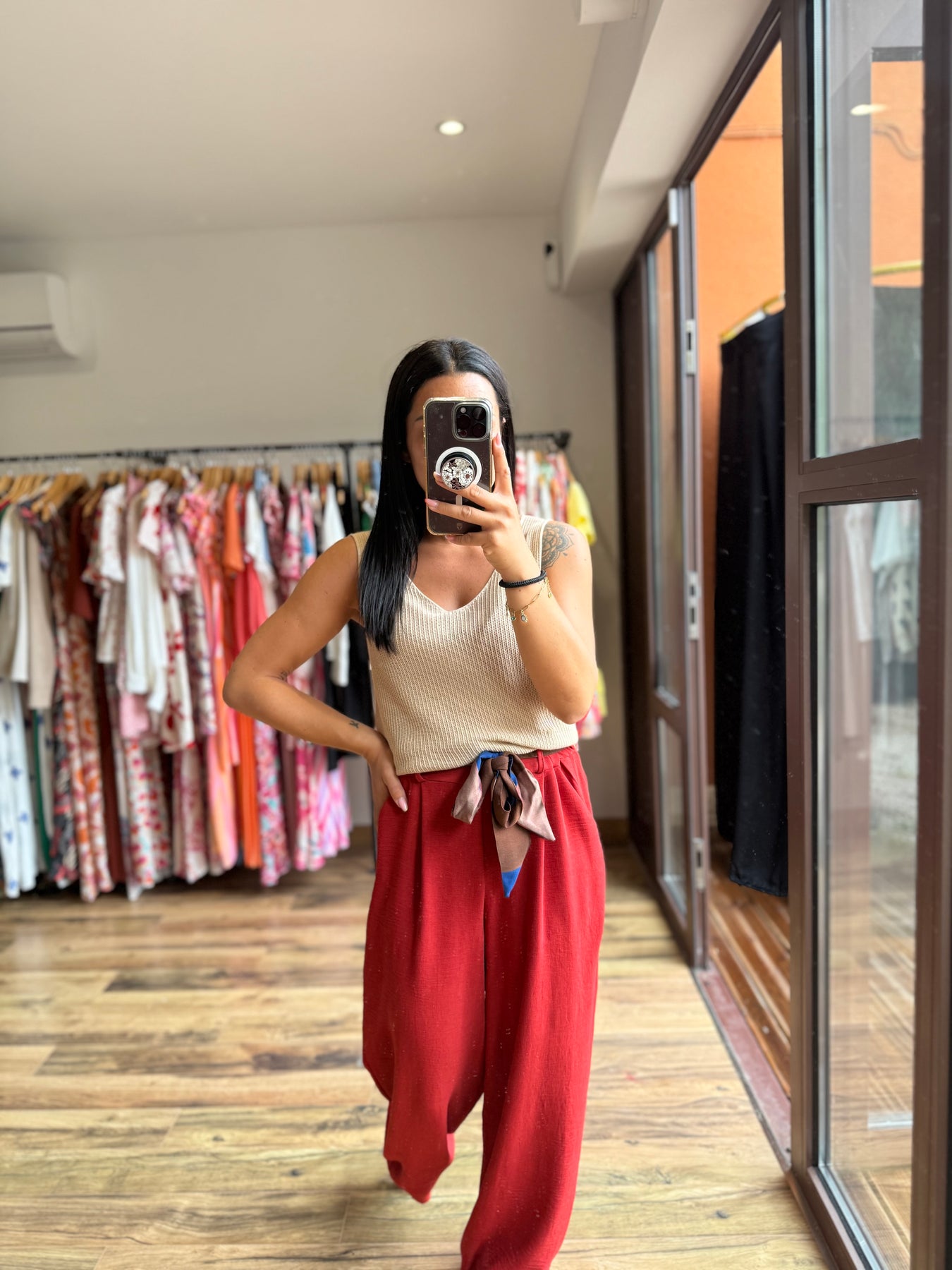 Alicia mesure 1m57 et porte le top “Odile” avec le pantalon “Eliam” terracotta.