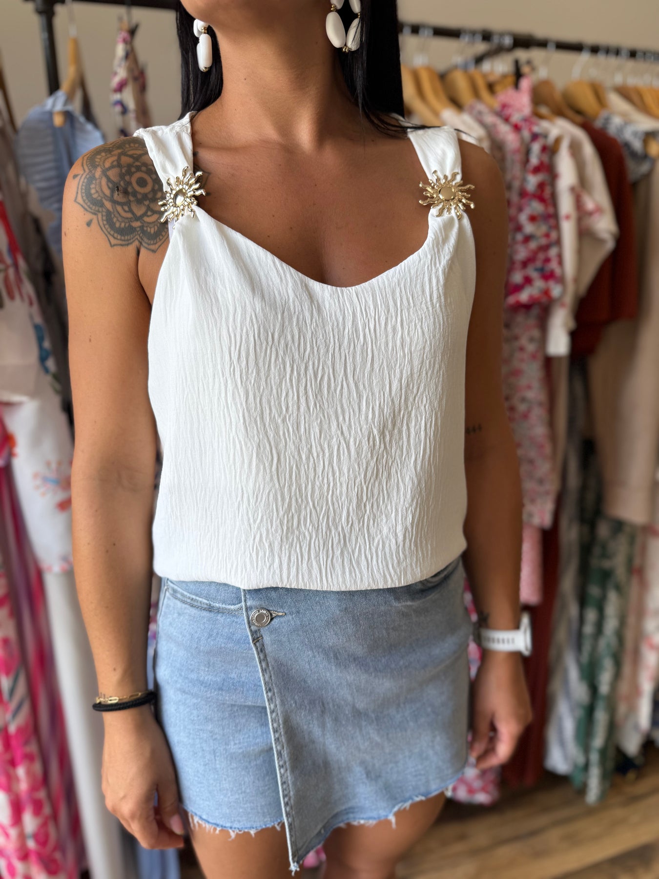 Le top Soleya, c’est LA pièce chic qui habille à elle seule une tenue ✨ Son tissu texturé blanc lumineux et ses broches dorées effet bijou sur les épaules font toute la différence. Il s’associe parfaitement à un bas en jean pour un style bohème-chic, ou à une jupe fluide pour une allure plus élégante 🌞
